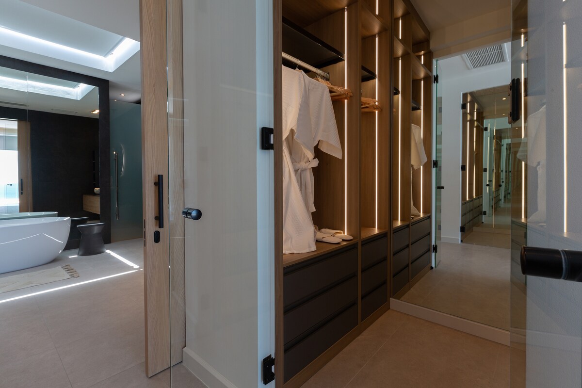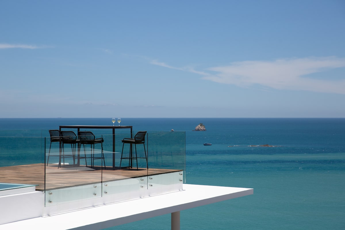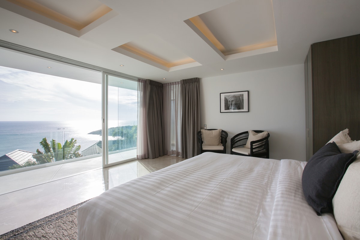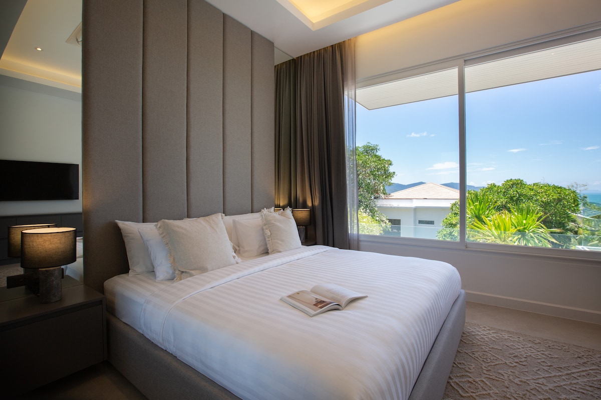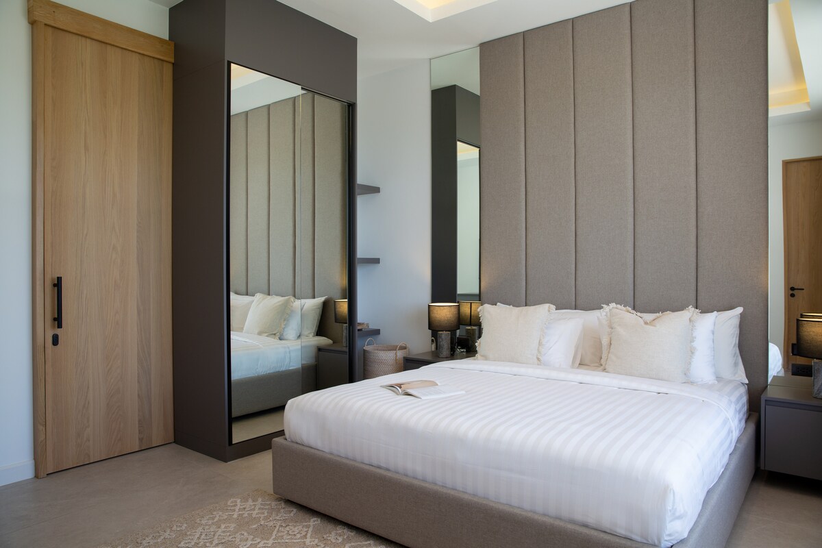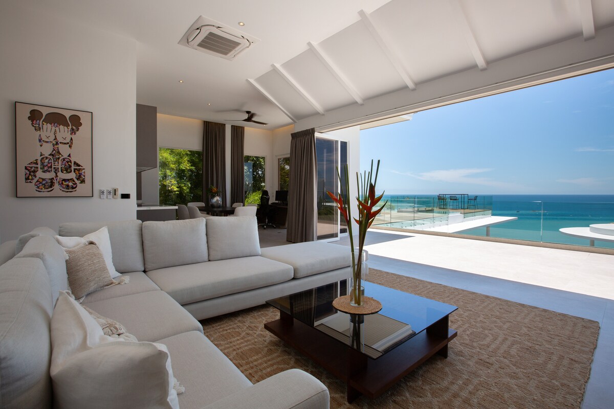 * Master Suite: Upper-level retreat with king bed, work desk, private sea-view terrace, and spa-like ensuite with walk-in rain shower and freestanding tub.