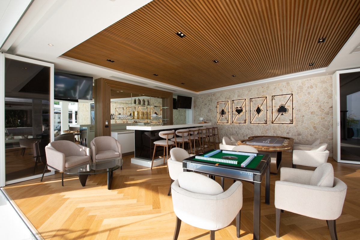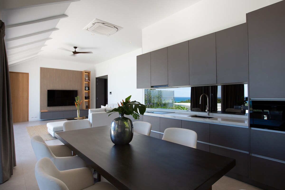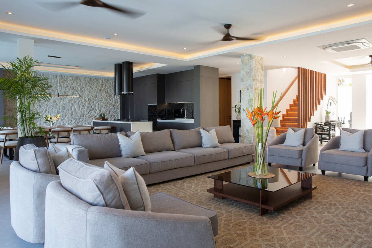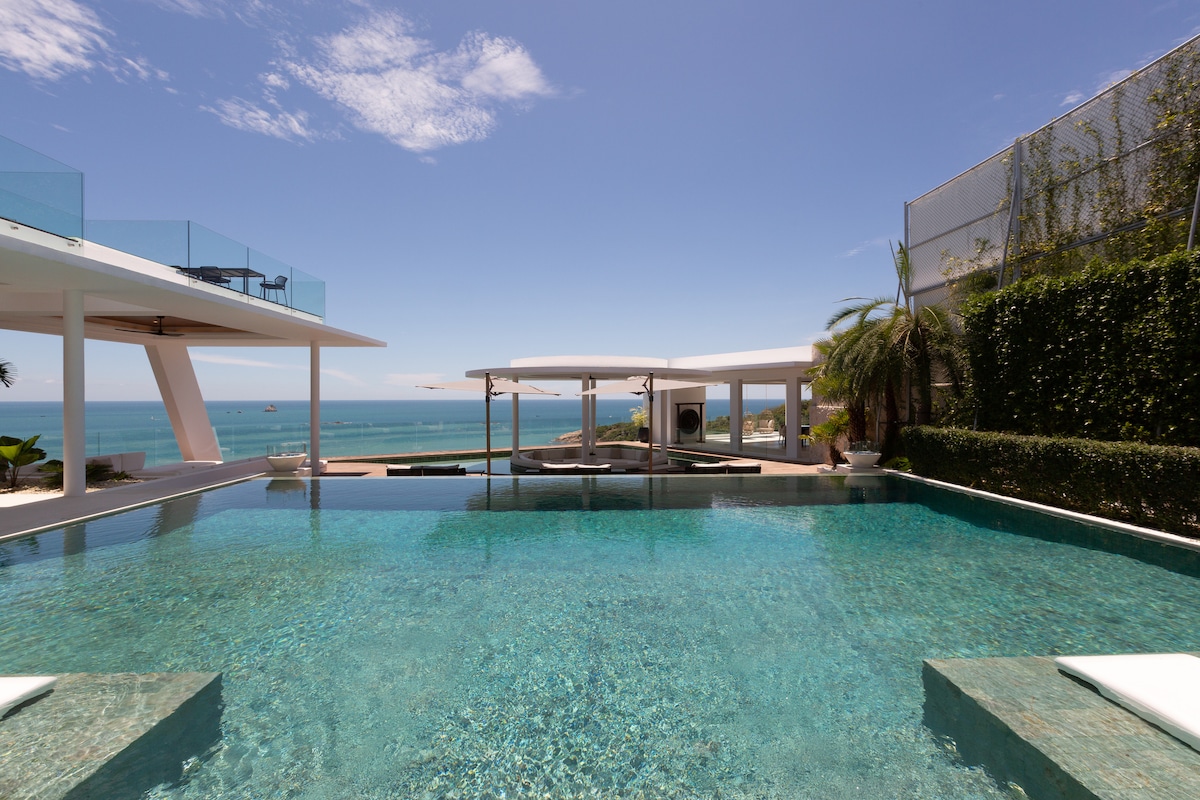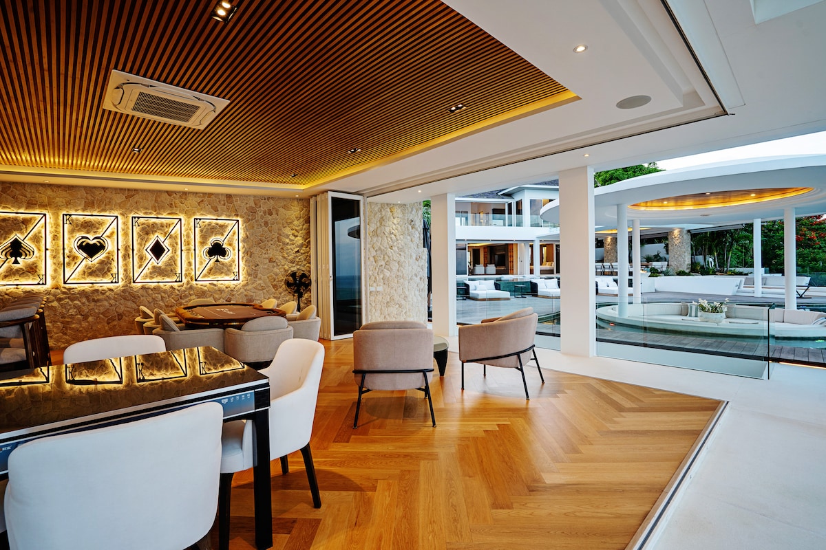 Blending sleek modern design with elegant Asian touches, the villa features seven spacious en-suite bedrooms and a range of premium amenities including a private cinema, gym, sauna, and games room, and bar. Open-plan spaces invite natural light and cooling breezes, with seamless transitions between indoor and outdoor areas.