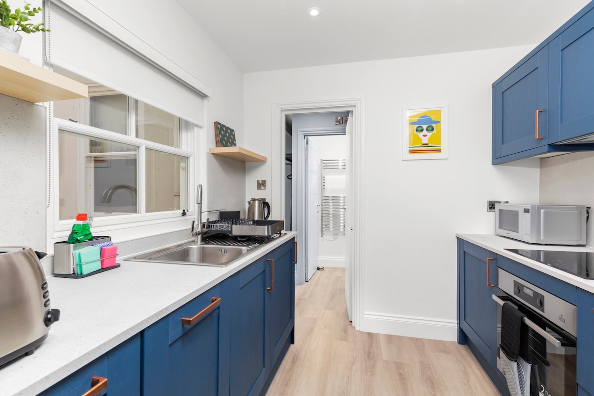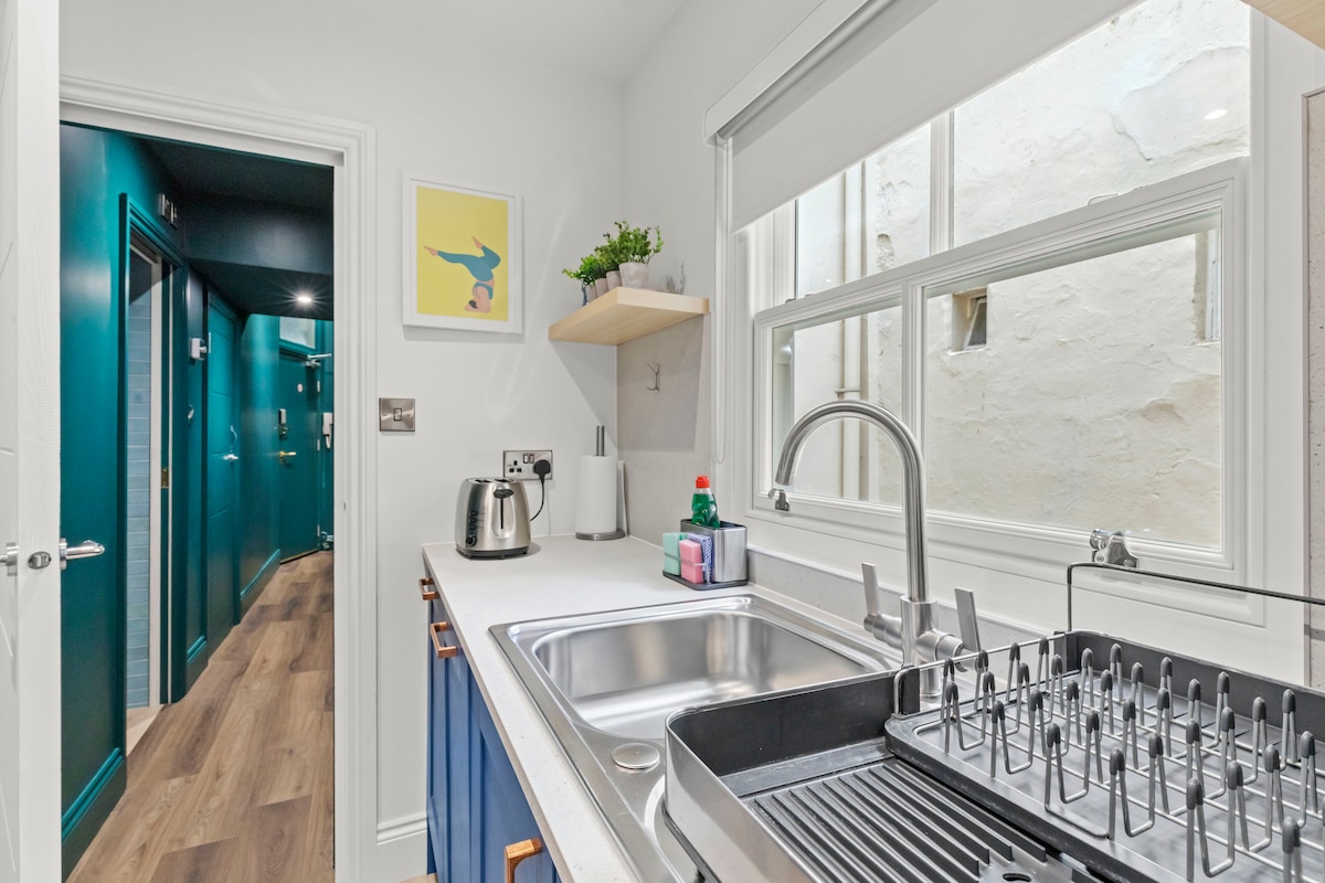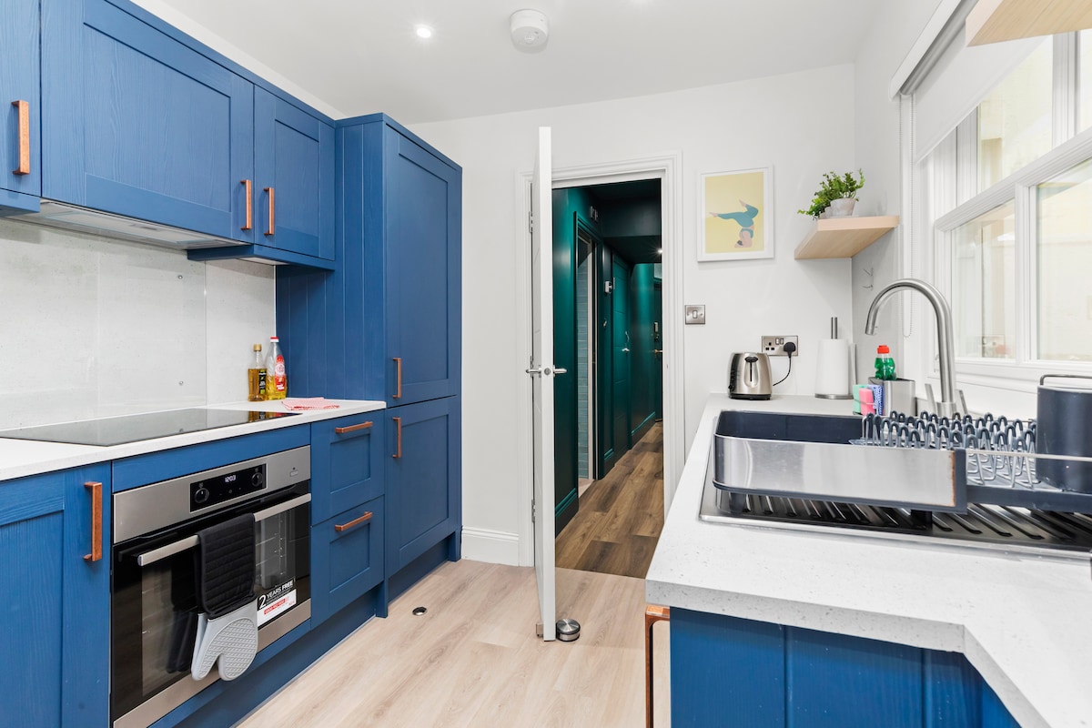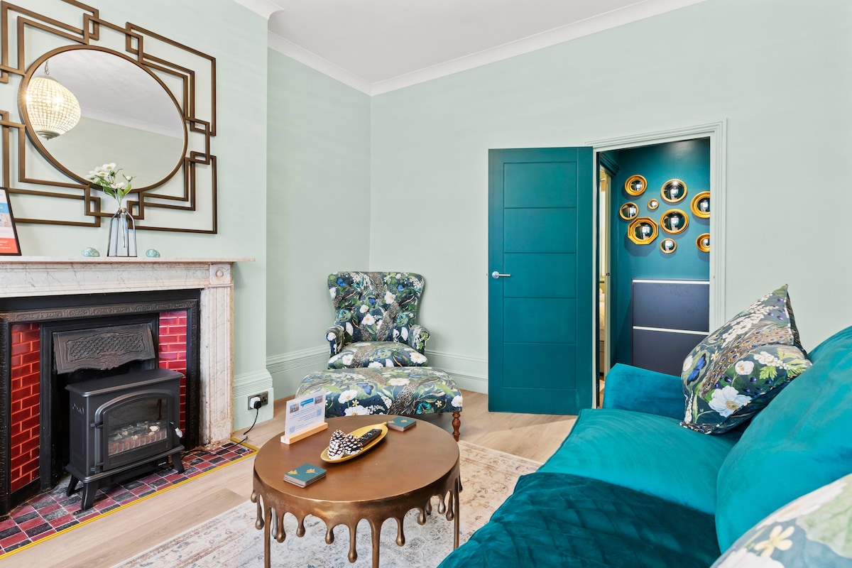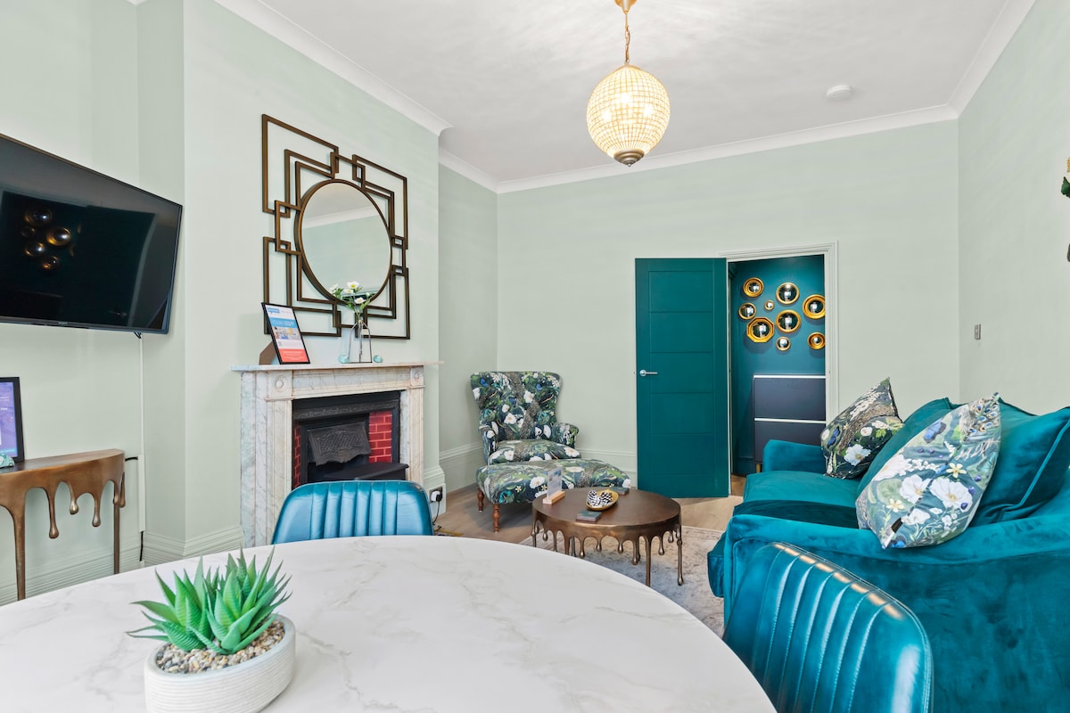 Overlooking a serene Regency square, the living area has tonnes of natural daylight. With blues and greens and coastal themes, including furnishings by the Vintage Sofa Company, you'll find the sociable and light living room a lovely space for chilling out, getting together for a few drinks or catching up on the events of the day. If you prefer, you can simply relax and watch a movie on the Smart TV.