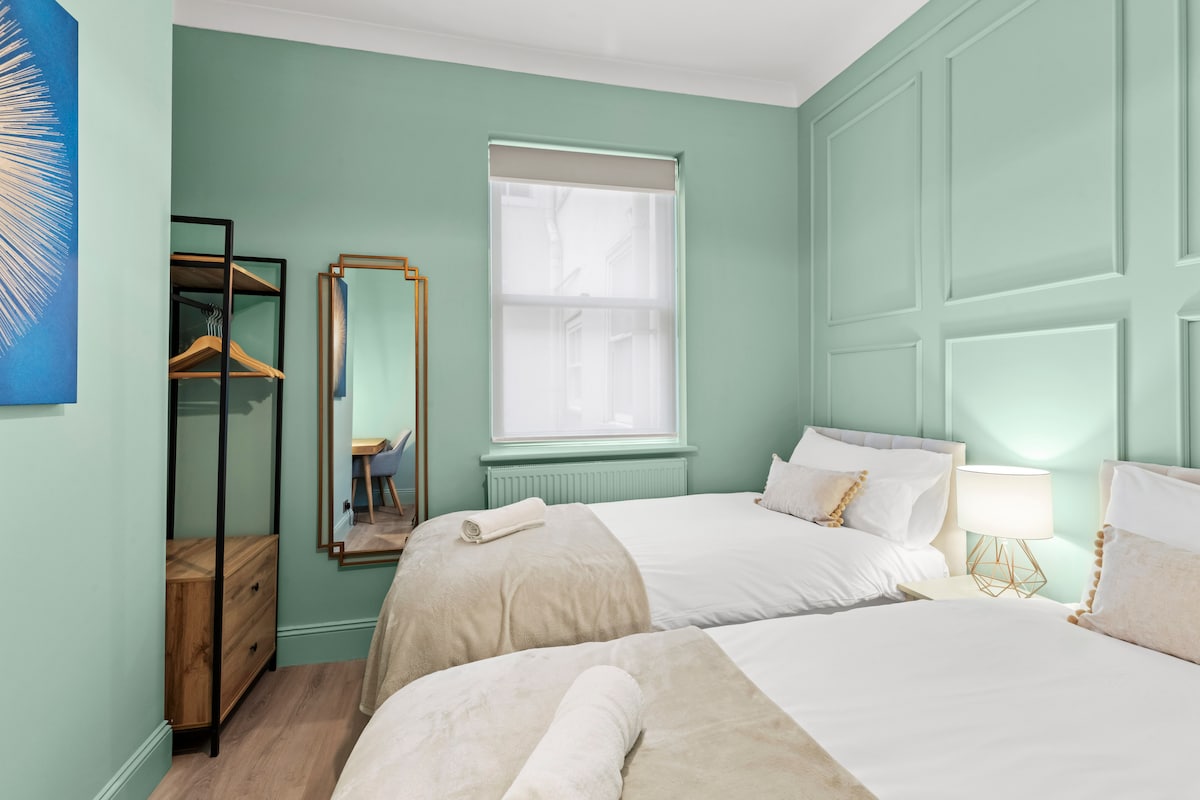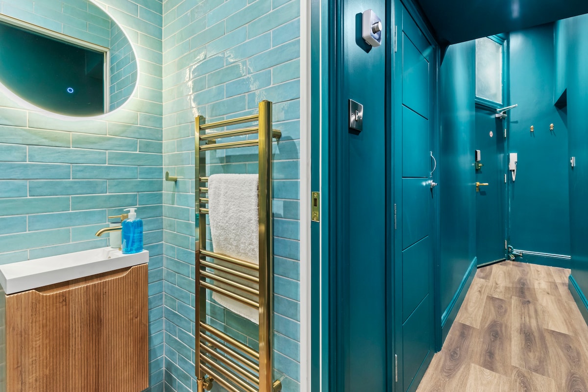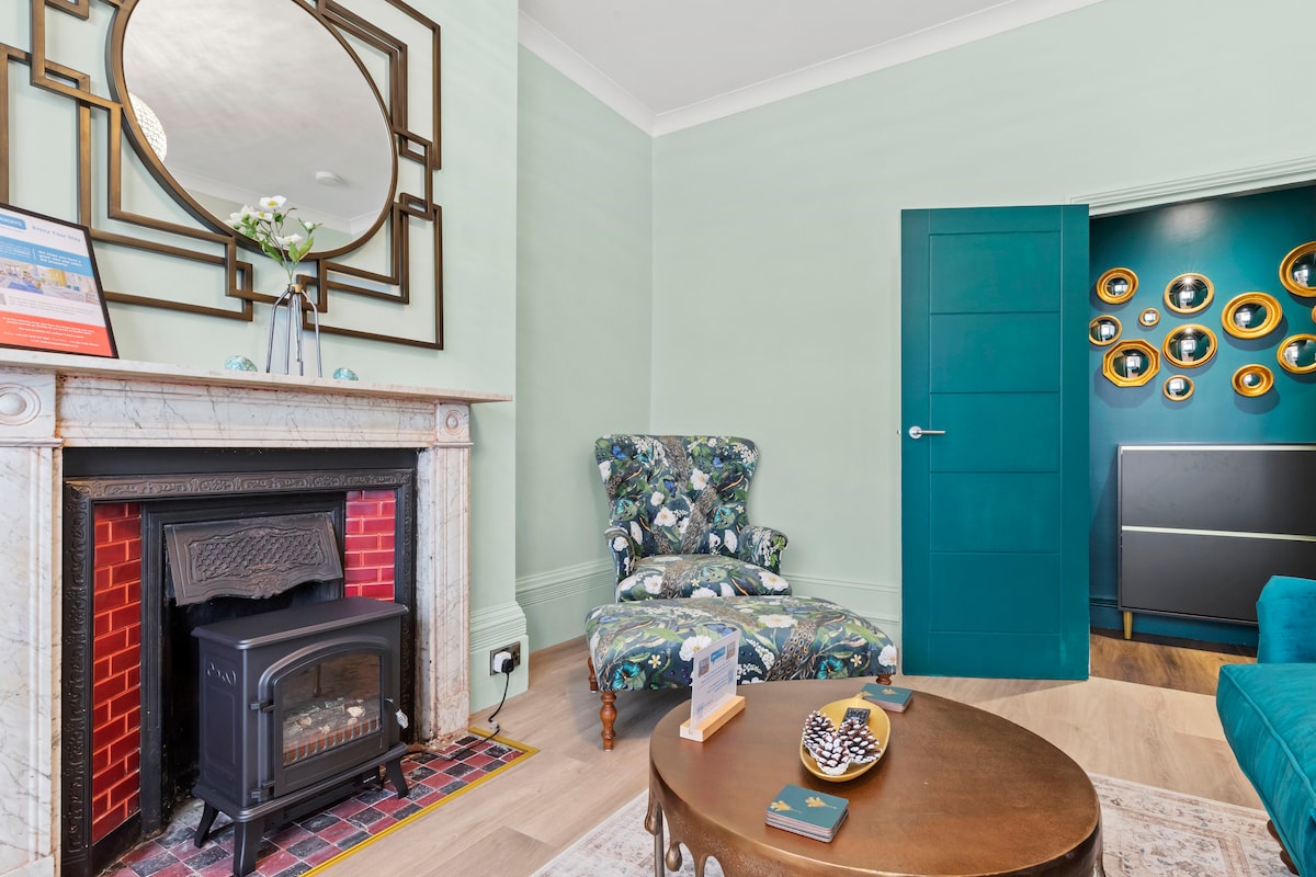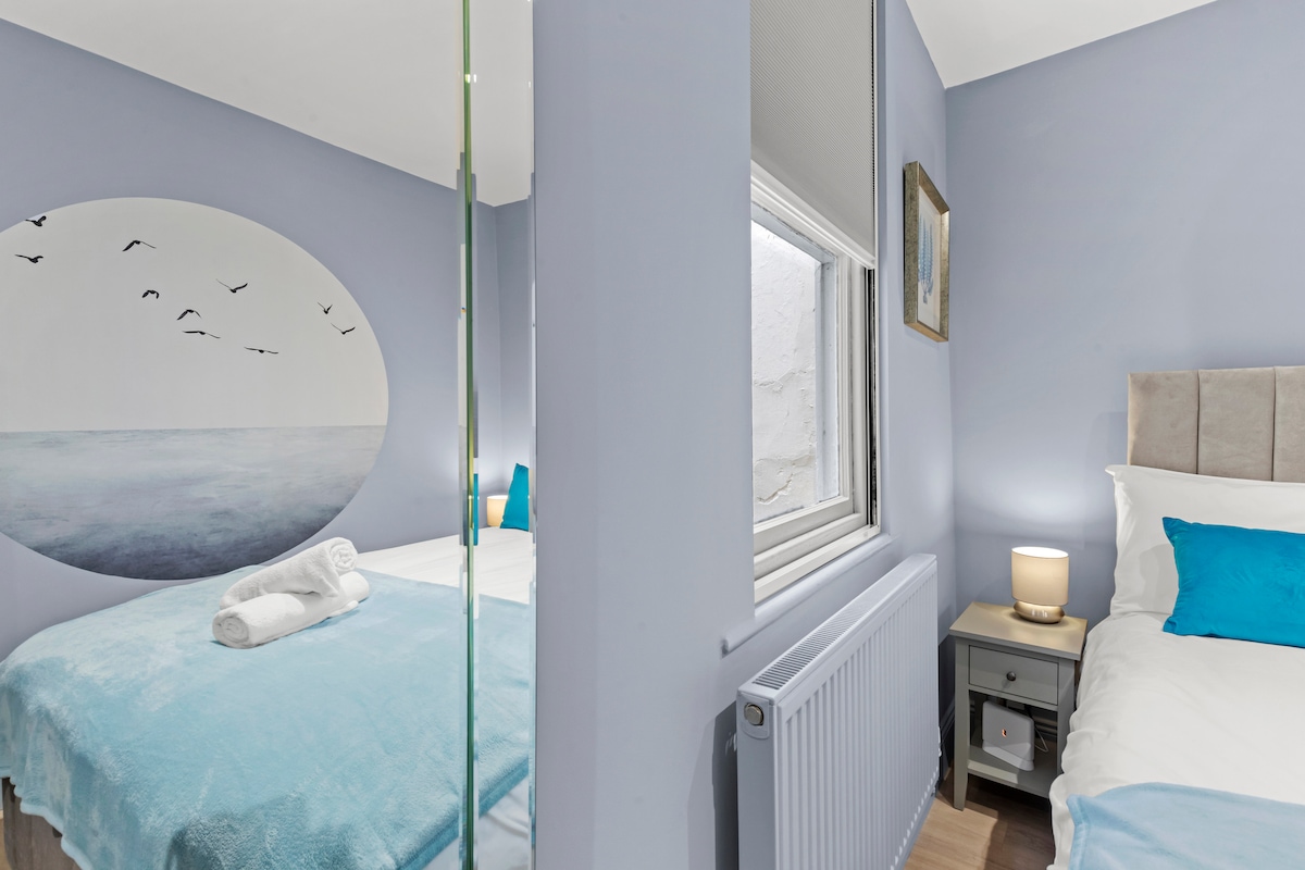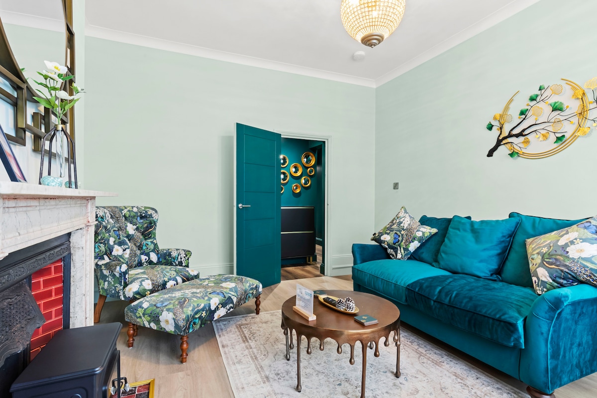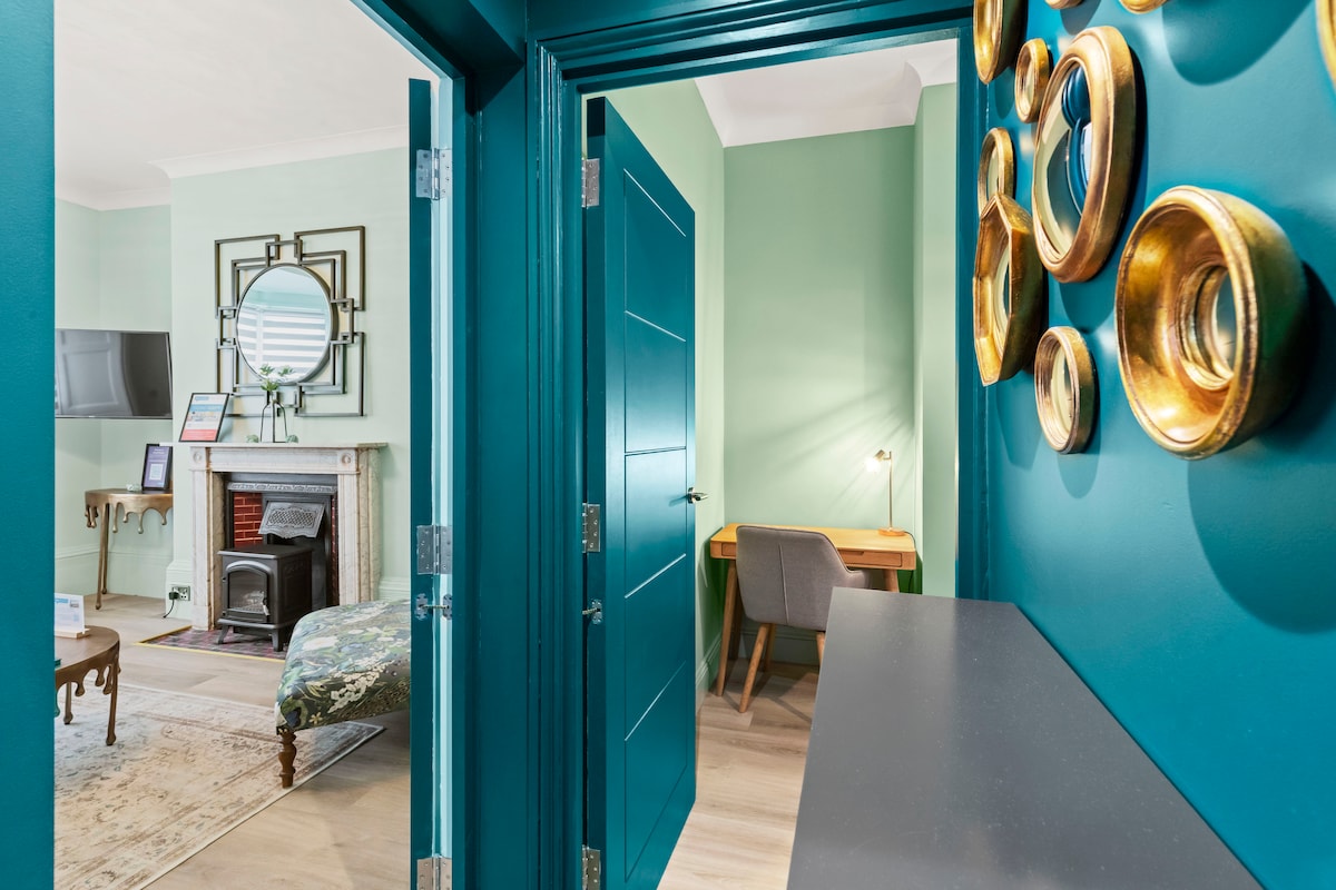 Overlooking a serene Regency square, the living area has tonnes of natural daylight. With blues and greens and coastal themes, including furnishings by the Vintage Sofa Company, you'll find the sociable and light living room a lovely space for chilling out, getting together for a few drinks or catching up on the events of the day. If you prefer, you can simply relax and watch a movie on the Smart TV.