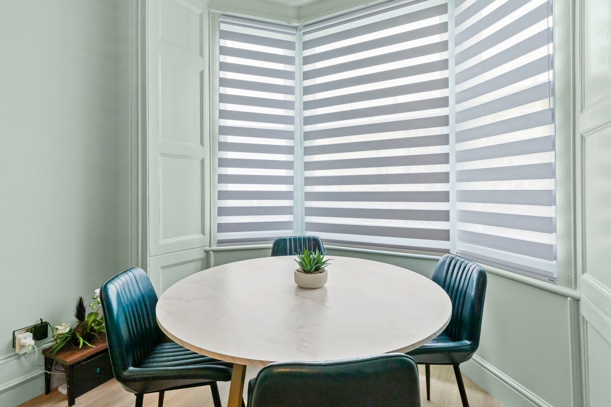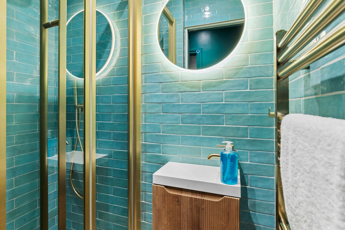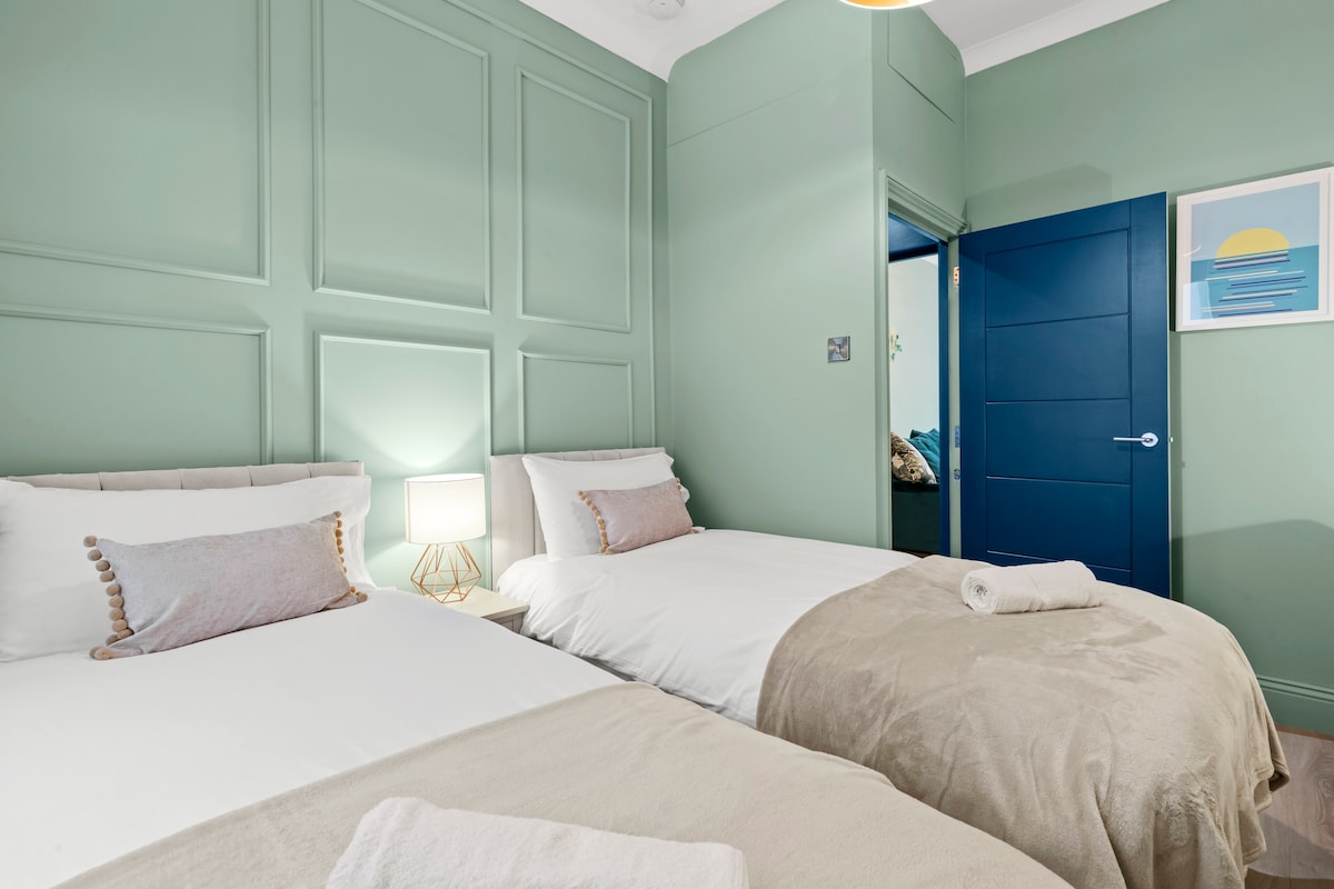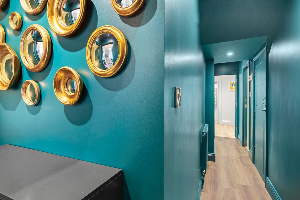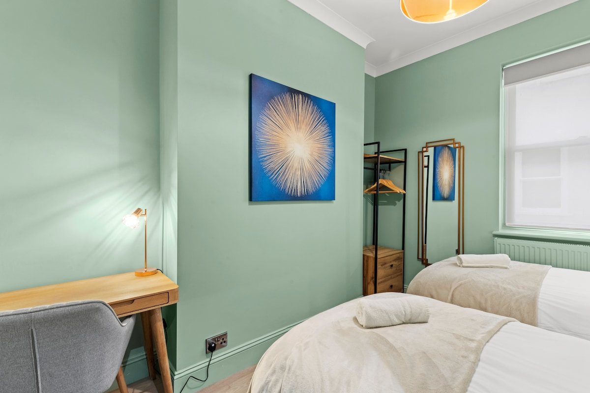 Overlooking a serene Regency square, the living area has tonnes of natural daylight. With blues and greens and coastal themes, including furnishings by the Vintage Sofa Company, you'll find the sociable and light living room a lovely space for chilling out, getting together for a few drinks or catching up on the events of the day. If you prefer, you can simply relax and watch a movie on the Smart TV.