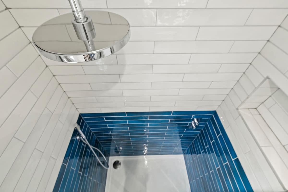- The main bathroom has a shower, sink, LED mirror and toilet.