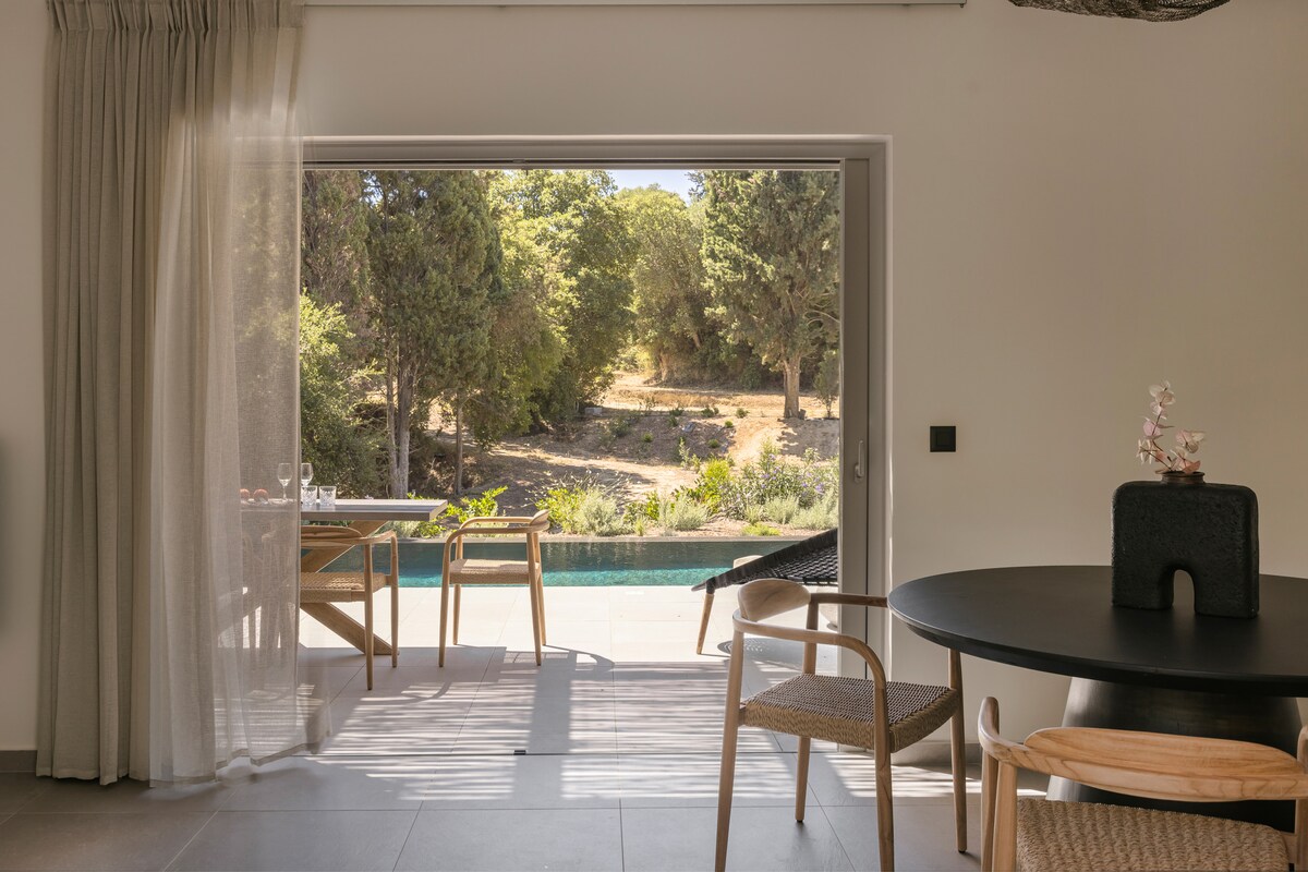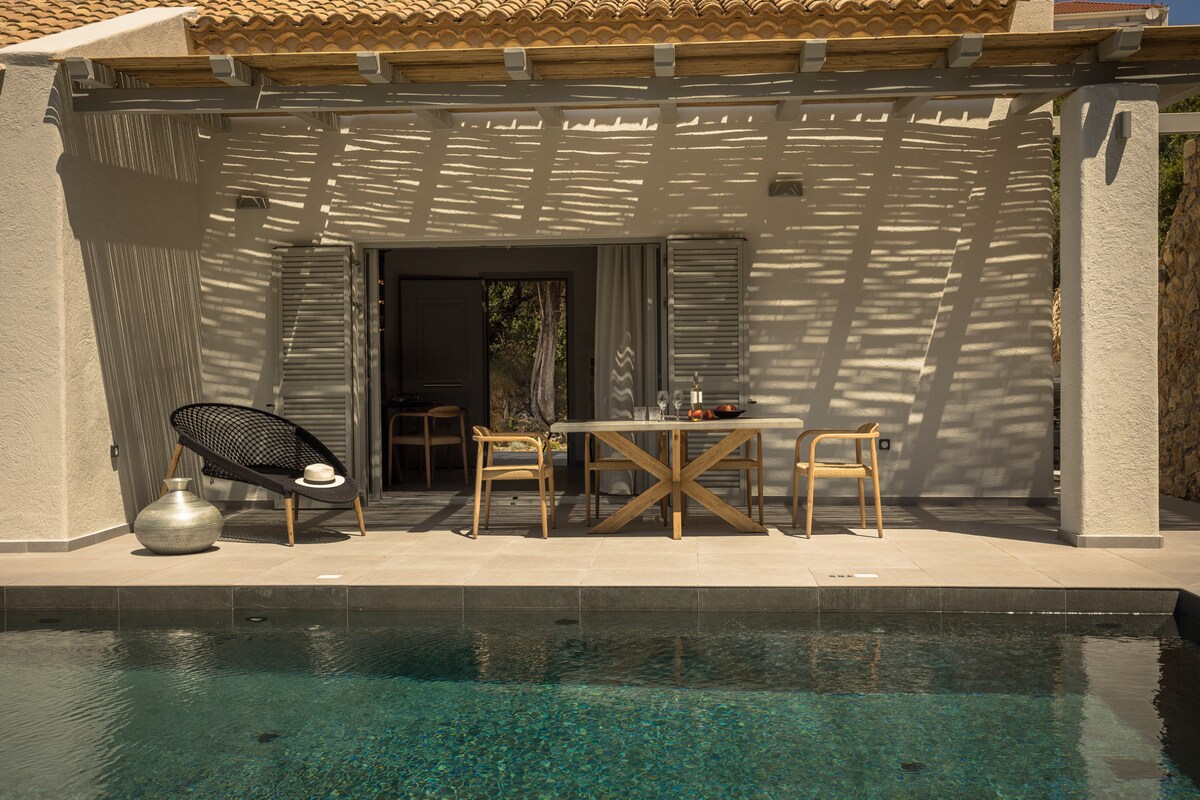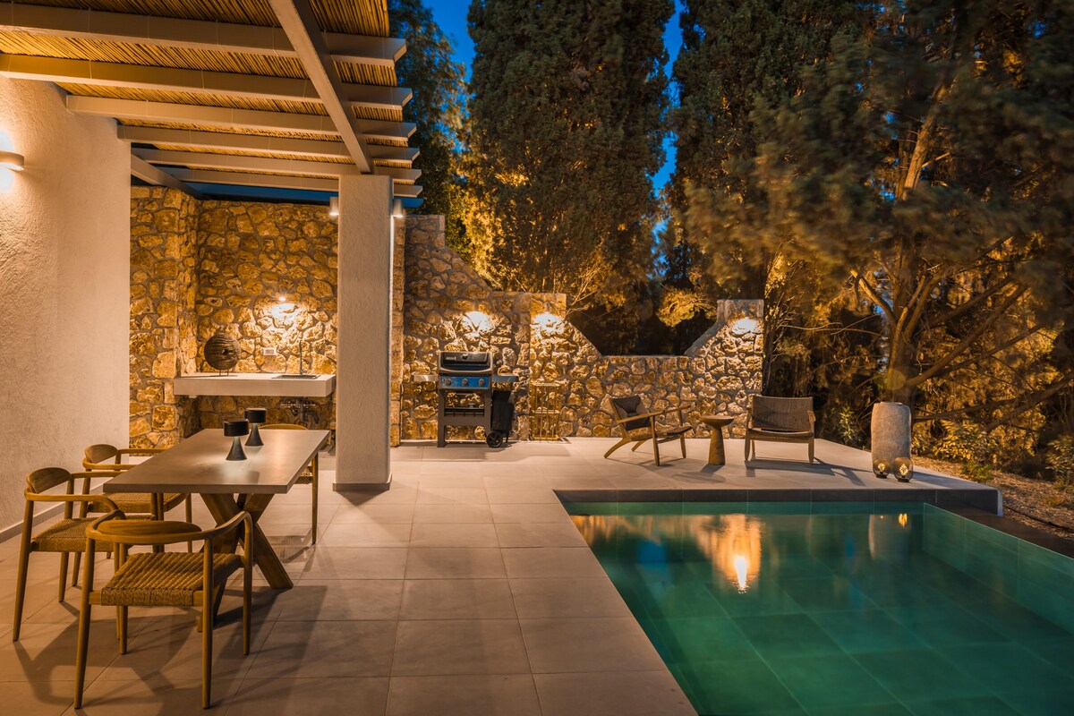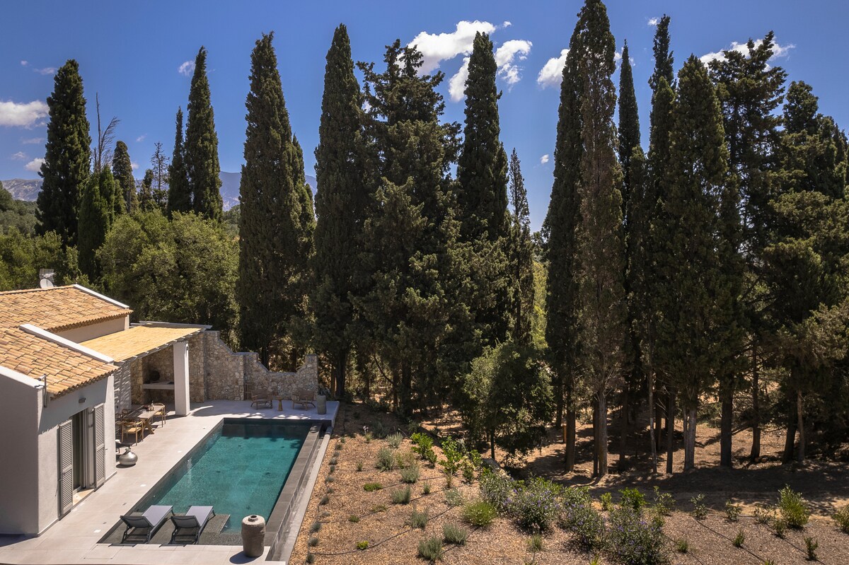 The Forest Villa is self- explanatory: a beautiful and luxury villa surrounded by even prettier green nature and trees, perfect for a peaceful getaway! Brand new for 2023, this fabulous villa is a perfect place to relax among the Kefalonian nature! You can admire the stars laying in bed, eat breakfast on your private terrace and feel the tranquility immersed in this green ocean of trees ! But still, while being in the forest, just few meters away are the best beaches of Kefalonia. It is situated in the small village of Sarlata, very close to Lakithra and Svoronata villages. The red roof tops and traditional Ionian colours of the houses of Sarlata are surrounded by greenery, mainly olive groves interspersed by tall cypress trees that stretch all the way down to the coastline. A couple of restaurants and mini markets in Lakithra and Svoronata are less than a 5 minute drive, and the beaches of Avithos, Ai Helis and Ammes are also not more than 8-10 minutes drive away. The interiors of the one storey villa are stylish and impressive, with a main living, dining and kitchen area open plan design, boasting patio doors opening onto the swimming pool terrace with stylish outdoor furniture. The king size bedroom also open out onto the terrace . The quality of the decor is second to none, boasting neutral shades of beige, grey and white and a charming minimalism that creates a calm, peaceful ambience. The shower room has a great quality with black chrome and glass. The swimming pool and terrace have lawn chairs to relax among the trees. The swimming pool also benefits from the use of eco – non chlorine products. The Capital of the island; Argostoli, is a 15 minute drive and well worth a visit, with an elegant main square and lots of shops, tavernas, cafes and bars to explore and a great outdoor vegetable, fruit market on the harbourfront, it is a great place for people “watchi”.Other things to note