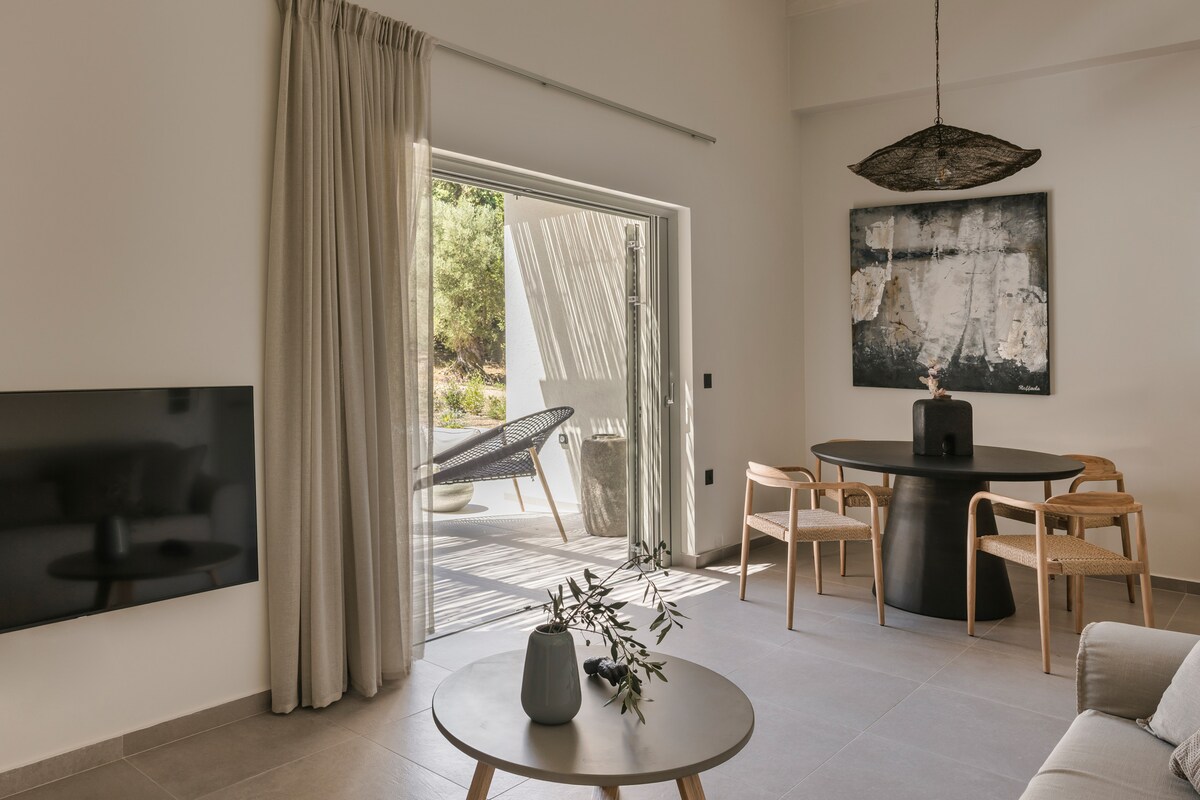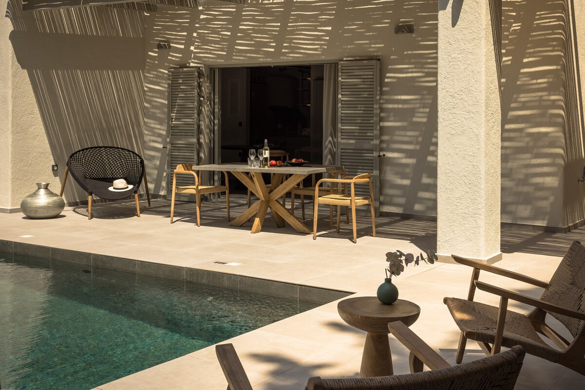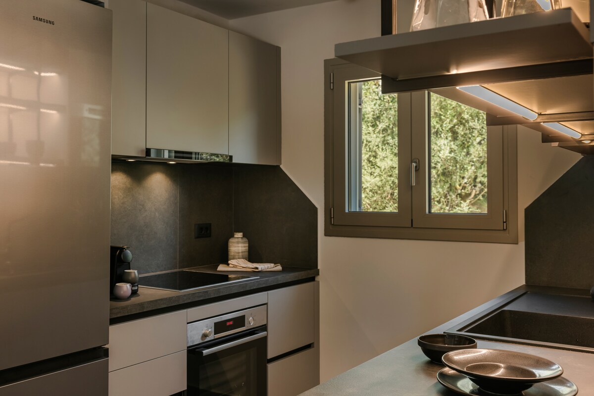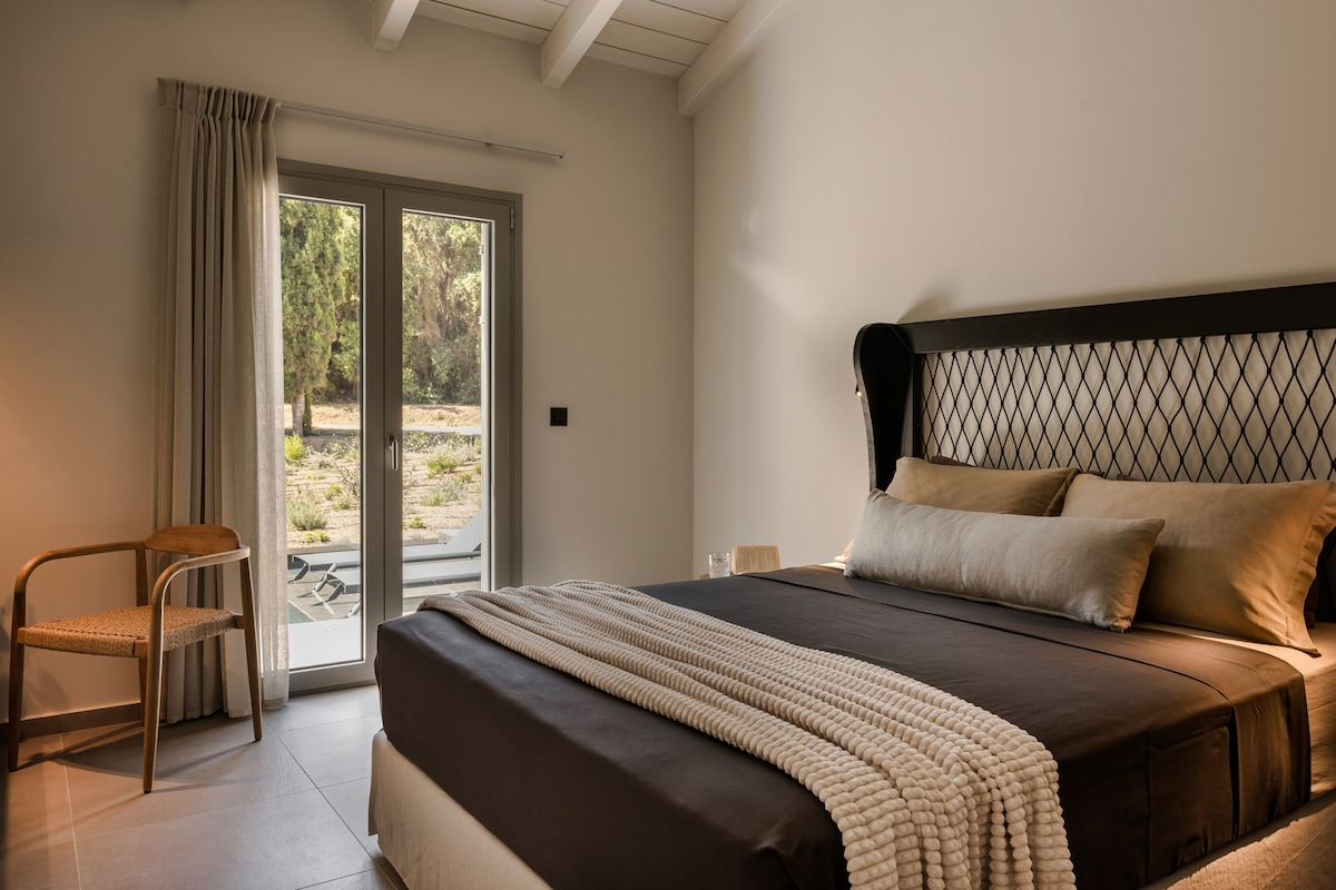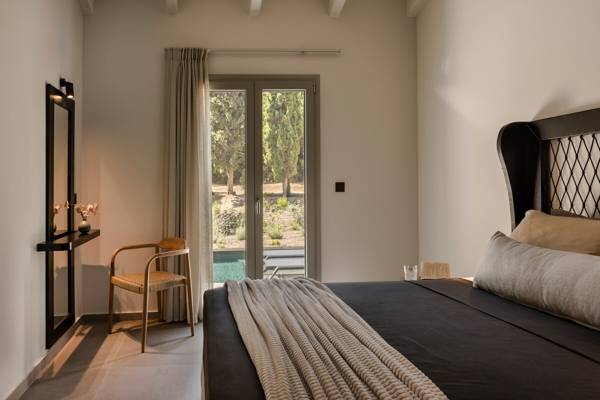 The Forest Villa is self- explanatory: a beautiful and luxury villa surrounded by even prettier green nature and trees, perfect for a peaceful getaway! Brand new for 2023, this fabulous villa is a perfect place to relax among the Kefalonian nature! You can admire the stars laying in bed, eat breakfast on your private terrace and feel the tranquility immersed in this green ocean of trees ! But still, while being in the forest, just few meters away are the best beaches of Kefalonia. It is situated in the small village of Sarlata, very close to Lakithra and Svoronata villages. The red roof tops and traditional Ionian colours of the houses of Sarlata are surrounded by greenery, mainly olive groves interspersed by tall cypress trees that stretch all the way down to the coastline. A couple of restaurants and mini markets in Lakithra and Svoronata are less than a 5 minute drive, and the beaches of Avithos, Ai Helis and Ammes are also not more than 8-10 minutes drive away. The interiors of the one storey villa are stylish and impressive, with a main living, dining and kitchen area open plan design, boasting patio doors opening onto the swimming pool terrace with stylish outdoor furniture. The king size bedroom also open out onto the terrace . The quality of the decor is second to none, boasting neutral shades of beige, grey and white and a charming minimalism that creates a calm, peaceful ambience. The shower room has a great quality with black chrome and glass. The swimming pool and terrace have lawn chairs to relax among the trees. The swimming pool also benefits from the use of eco – non chlorine products. The Capital of the island; Argostoli, is a 15 minute drive and well worth a visit, with an elegant main square and lots of shops, tavernas, cafes and bars to explore and a great outdoor vegetable, fruit market on the harbourfront, it is a great place for people “watchi”.Other things to note