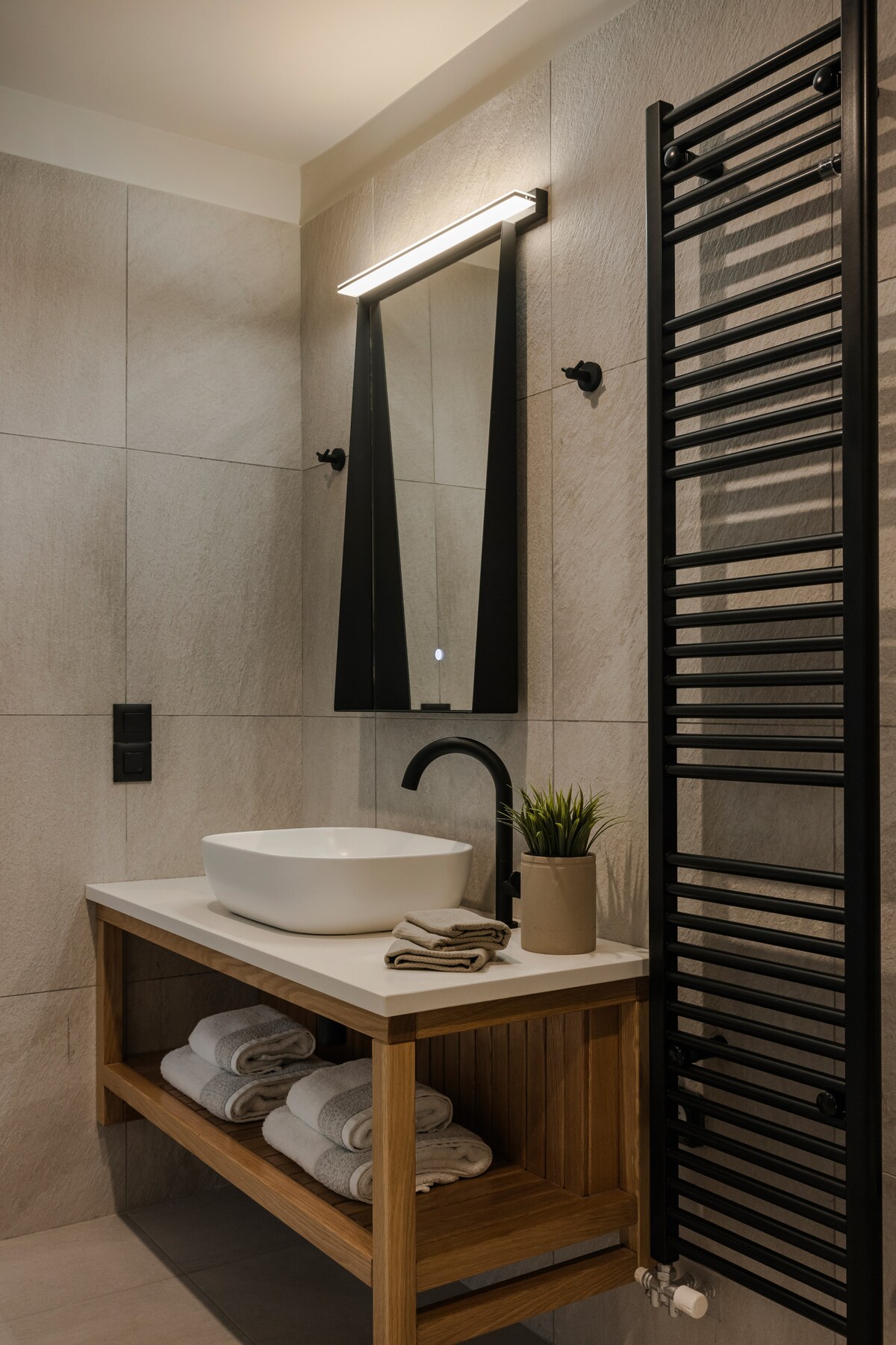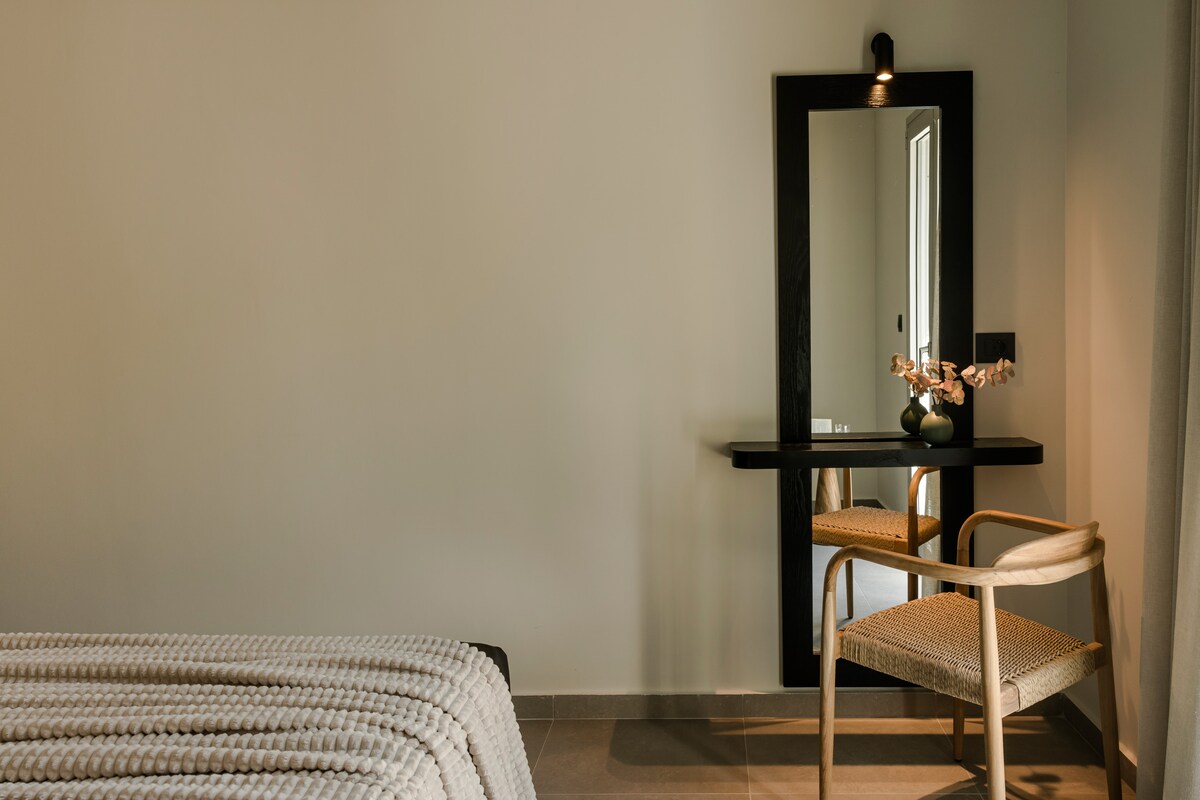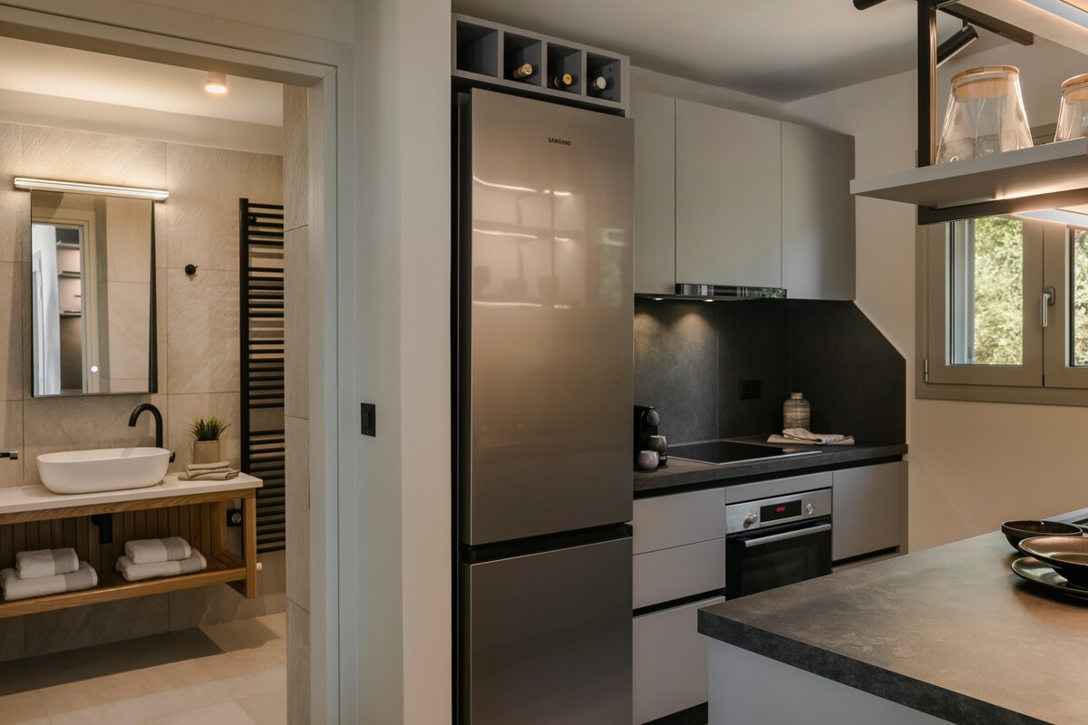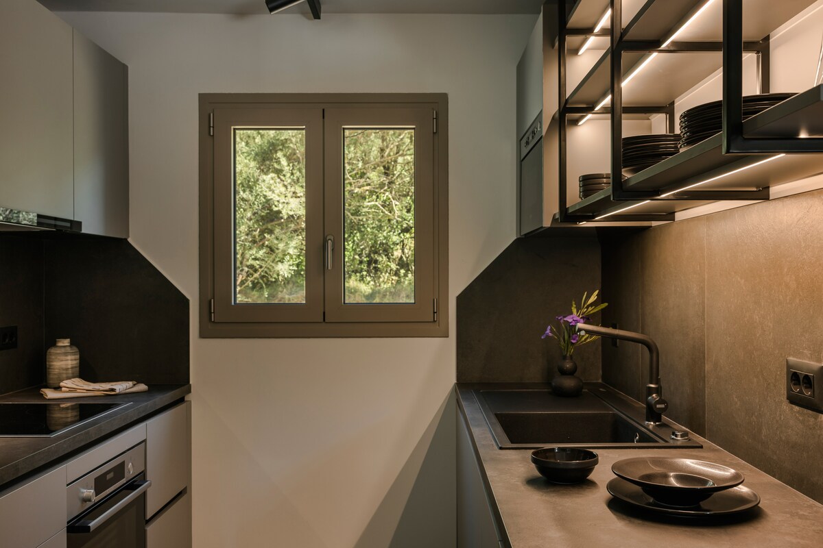 The Forest Villa is self- explanatory: a beautiful and luxury villa surrounded by even prettier green nature and trees, perfect for a peaceful getaway! Brand new for 2023, this fabulous villa is a perfect place to relax among the Kefalonian nature! You can admire the stars laying in bed, eat breakfast on your private terrace and feel the tranquility immersed in this green ocean of trees ! But still, while being in the forest, just few meters away are the best beaches of Kefalonia. It is situated in the small village of Sarlata, very close to Lakithra and Svoronata villages. The red roof tops and traditional Ionian colours of the houses of Sarlata are surrounded by greenery, mainly olive groves interspersed by tall cypress trees that stretch all the way down to the coastline. A couple of restaurants and mini markets in Lakithra and Svoronata are less than a 5 minute drive, and the beaches of Avithos, Ai Helis and Ammes are also not more than 8-10 minutes drive away. The interiors of the one storey villa are stylish and impressive, with a main living, dining and kitchen area open plan design, boasting patio doors opening onto the swimming pool terrace with stylish outdoor furniture. The king size bedroom also open out onto the terrace . The quality of the decor is second to none, boasting neutral shades of beige, grey and white and a charming minimalism that creates a calm, peaceful ambience. The shower room has a great quality with black chrome and glass. The swimming pool and terrace have lawn chairs to relax among the trees. The swimming pool also benefits from the use of eco – non chlorine products. The Capital of the island; Argostoli, is a 15 minute drive and well worth a visit, with an elegant main square and lots of shops, tavernas, cafes and bars to explore and a great outdoor vegetable, fruit market on the harbourfront, it is a great place for people “watchi”.Other things to note