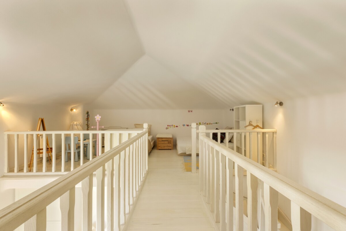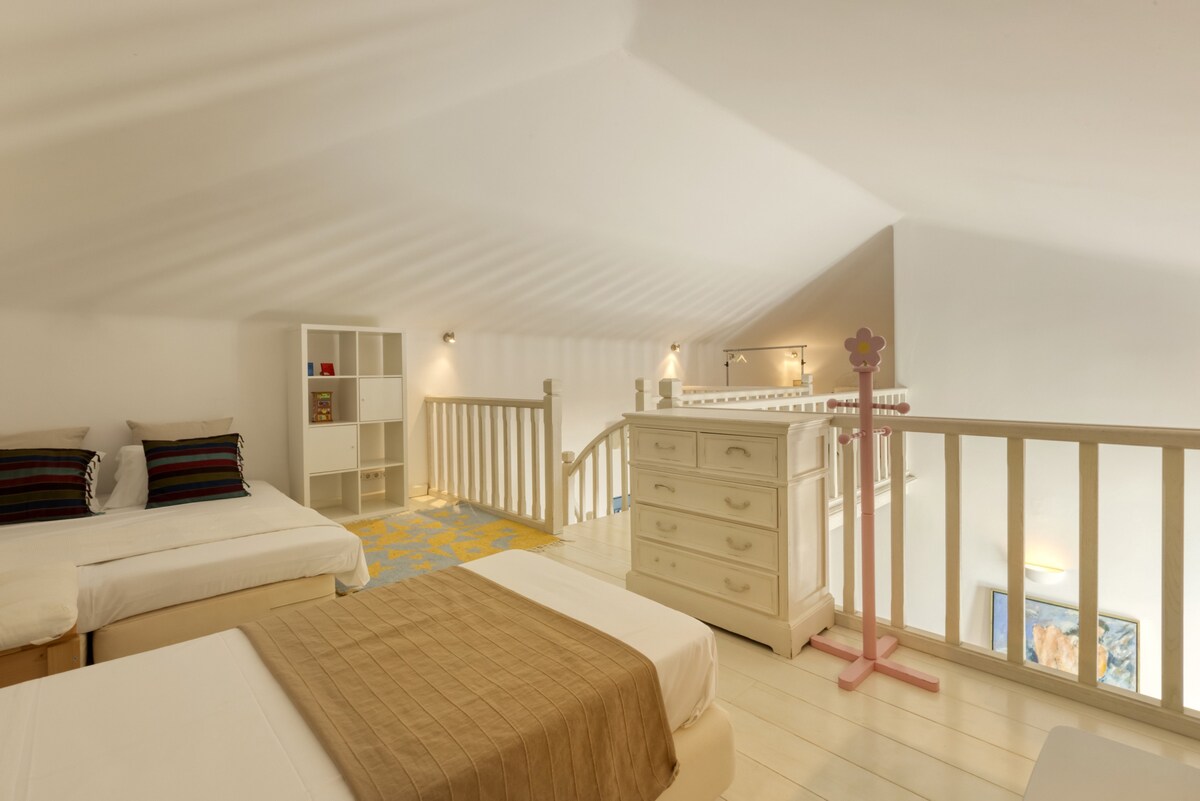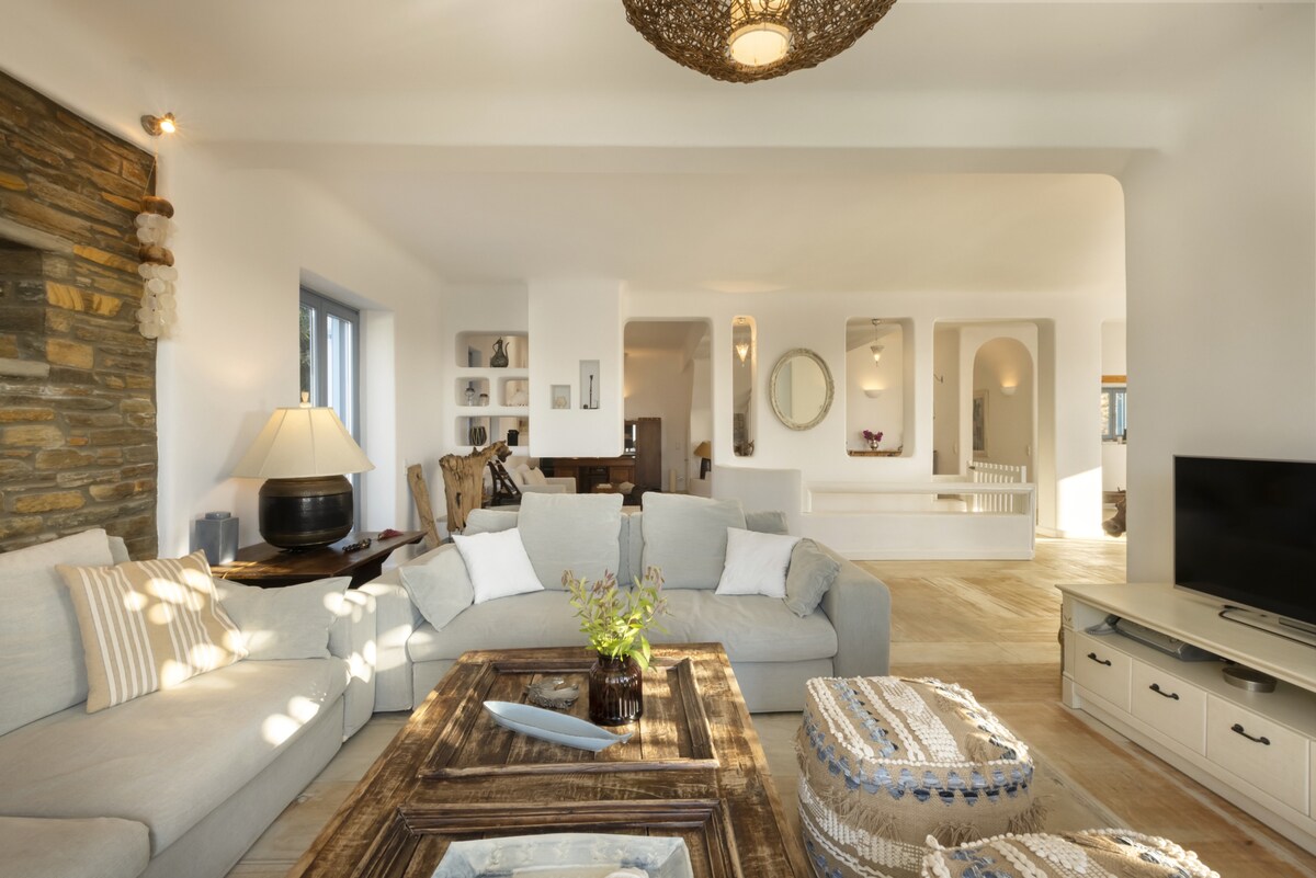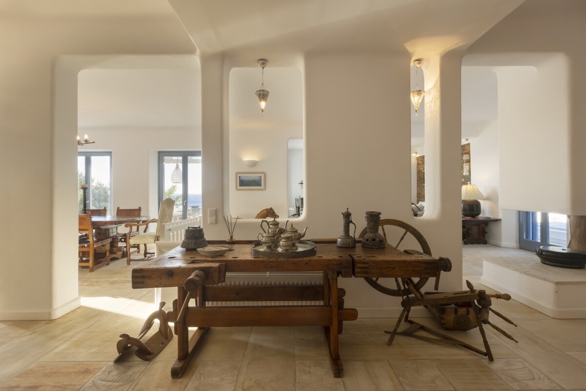 A magnificent seaside villa with superb views over the Aegean, this home has been featured in architecture magazines for its elegant design. Set in an area of exquisite natural beauty, on the noble Greek island of Andros, this substantial 6-bedroom home is just a few meters walk on a private path away from an idyllic sandy beach. Ideal for large groups or families looking to relax in comfort and in one of Greece’s less known and more exclusive islands. The residence is set on three levels. It has been built in keeping with the local architecture, using local stone and featuring wooden elements and whitewashes walls. From its garden, verandas and outdoor spaces you will savor the Aegean sea, take in the island’s atmosphere and relax in elegance and comfort. On the ground floor you will spend time in the villa’s sizeable living area with a comfortable sitting room and a large dining area that can comfortably seat a big group or family. There is also an office area, a Wc and a double bedroom with a private bathroom. The retro style kitchen is self-contained and fully equipped and has its own dining table and sitting area. Walk out on the shaded dining area or head for the patio with its chic outdoors sitting. Here you can take in the views and the night sky and enjoy quality time al fresco with friends and family. On the first floor there is another living area with a small kitchenette, washing machine and a small refrigerator. There are three bedrooms: the master bedroom with its en-suite bathroom, a bedroom with two single beds, and another with one single bed. There is also another bathroom. This level has its very own separate entrance should you want to use it for more privacy. A large wooden staircase leads to a large open plan room in the attic with two beds and another attic bedroom with a single bed. Throughout the house you can just look out of the windows and enjoy the incredibly beautiful sea and island views. You will have access to a fully equipped and independent villa, with a private shaded terrace and a private pedestrian road which leads to a beautiful sandy beach. We are only a phone call/email or a text away for anything you need. The residence is set near the village of Stenies, a short drive from the main Andros town Hora, where you will be able to find all essential shopping. It is part of a group of five homes, all with private entrances and private outdoors areas. All five homes have direct access to a beautiful sandy beach and there is a taverna nearby. 4 km away, in quaint Hora, you will find stylish shops, excellent restaurants, bars and museums, including one of Greece’s best-known modern art museums. Andros is a paradise for walkers, with a number of different trails and also features superb beaches. To best enjoy your stay in our home and Andros we recommend you hire a car. There is free parking on the premises. Hora is just 4 km away and the main port of Andros, Gavrio, around 40km. You can walk down the path to the beach, which also has a beach bar. There is also a taverna 1' up the hill from the villa. For everything else you will need a car.Guest access