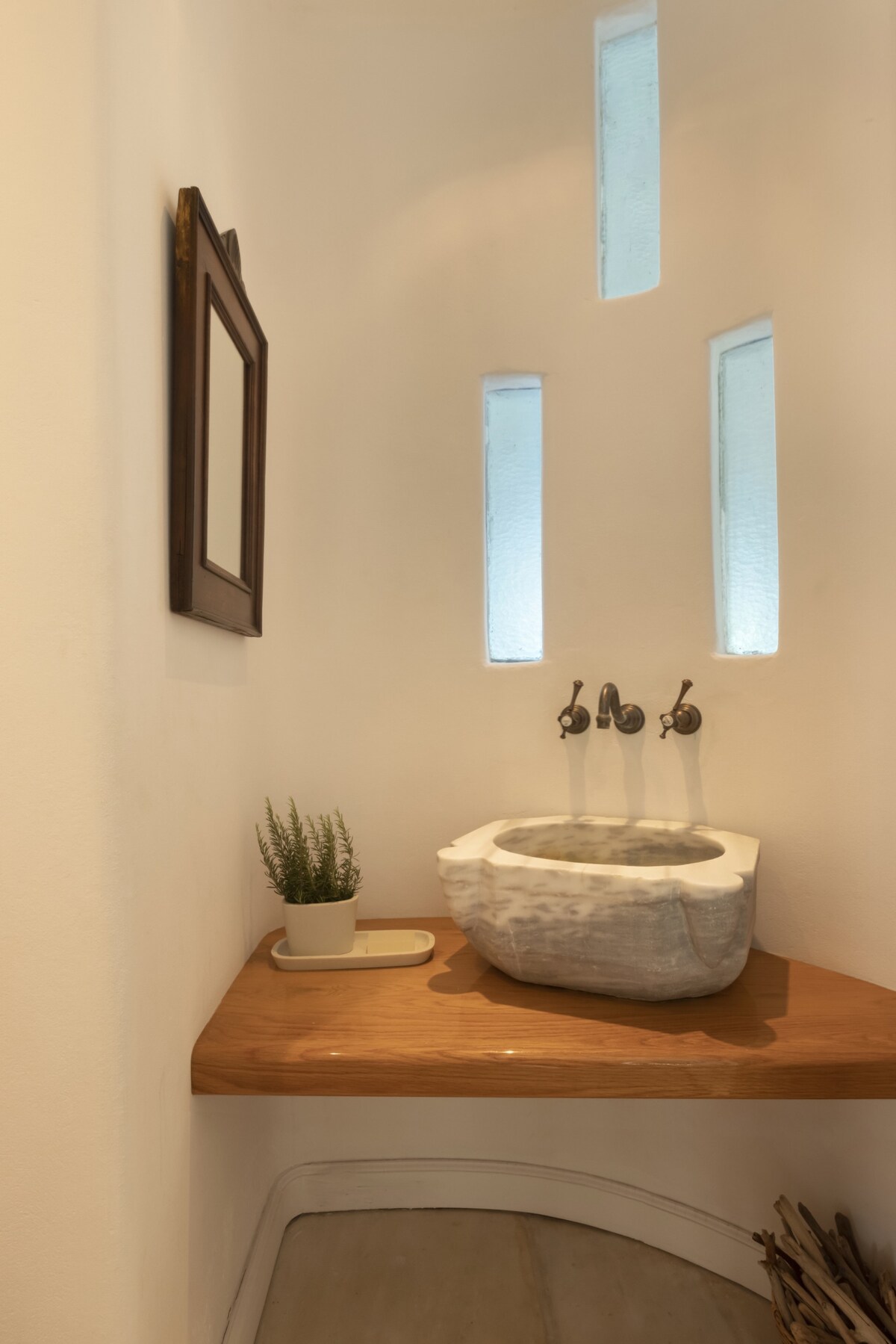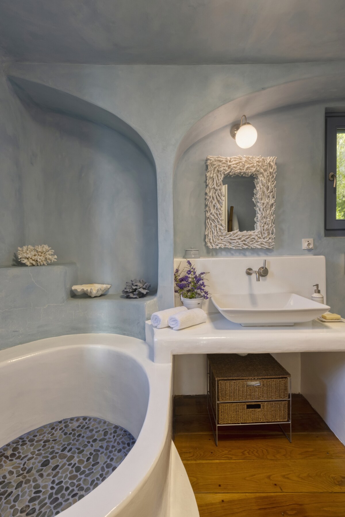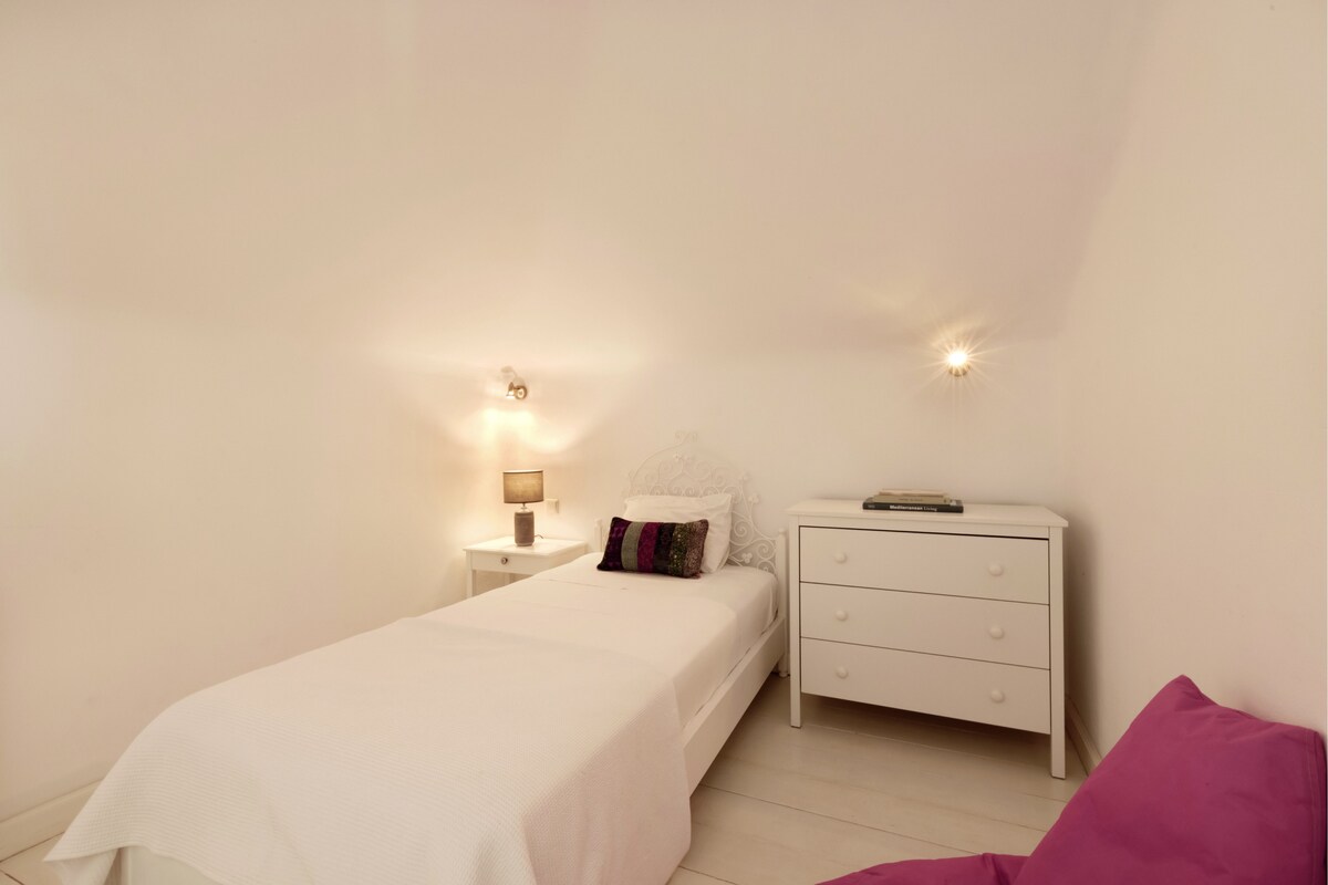 A magnificent seaside villa with superb views over the Aegean, this home has been featured in architecture magazines for its elegant design. Set in an area of exquisite natural beauty, on the noble Greek island of Andros, this substantial 6-bedroom home is just a few meters walk on a private path away from an idyllic sandy beach. Ideal for large groups or families looking to relax in comfort and in one of Greece’s less known and more exclusive islands. The residence is set on three levels. It has been built in keeping with the local architecture, using local stone and featuring wooden elements and whitewashes walls. From its garden, verandas and outdoor spaces you will savor the Aegean sea, take in the island’s atmosphere and relax in elegance and comfort. On the ground floor you will spend time in the villa’s sizeable living area with a comfortable sitting room and a large dining area that can comfortably seat a big group or family. There is also an office area, a Wc and a double bedroom with a private bathroom. The retro style kitchen is self-contained and fully equipped and has its own dining table and sitting area. Walk out on the shaded dining area or head for the patio with its chic outdoors sitting. Here you can take in the views and the night sky and enjoy quality time al fresco with friends and family. On the first floor there is another living area with a small kitchenette, washing machine and a small refrigerator. There are three bedrooms: the master bedroom with its en-suite bathroom, a bedroom with two single beds, and another with one single bed. There is also another bathroom. This level has its very own separate entrance should you want to use it for more privacy. A large wooden staircase leads to a large open plan room in the attic with two beds and another attic bedroom with a single bed. Throughout the house you can just look out of the windows and enjoy the incredibly beautiful sea and island views. You will have access to a fully equipped and independent villa, with a private shaded terrace and a private pedestrian road which leads to a beautiful sandy beach. We are only a phone call/email or a text away for anything you need. The residence is set near the village of Stenies, a short drive from the main Andros town Hora, where you will be able to find all essential shopping. It is part of a group of five homes, all with private entrances and private outdoors areas. All five homes have direct access to a beautiful sandy beach and there is a taverna nearby. 4 km away, in quaint Hora, you will find stylish shops, excellent restaurants, bars and museums, including one of Greece’s best-known modern art museums. Andros is a paradise for walkers, with a number of different trails and also features superb beaches. To best enjoy your stay in our home and Andros we recommend you hire a car. There is free parking on the premises. Hora is just 4 km away and the main port of Andros, Gavrio, around 40km. You can walk down the path to the beach, which also has a beach bar. There is also a taverna 1' up the hill from the villa. For everything else you will need a car.Guest access