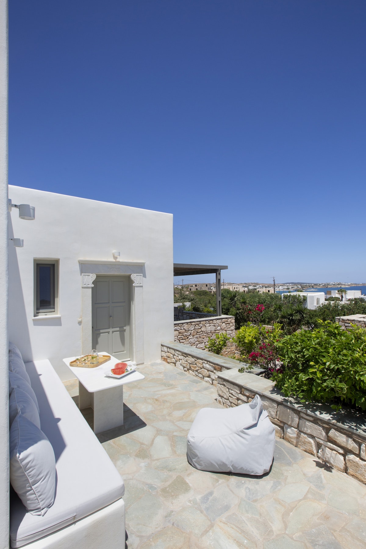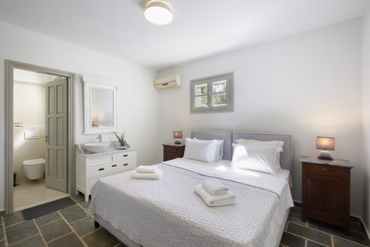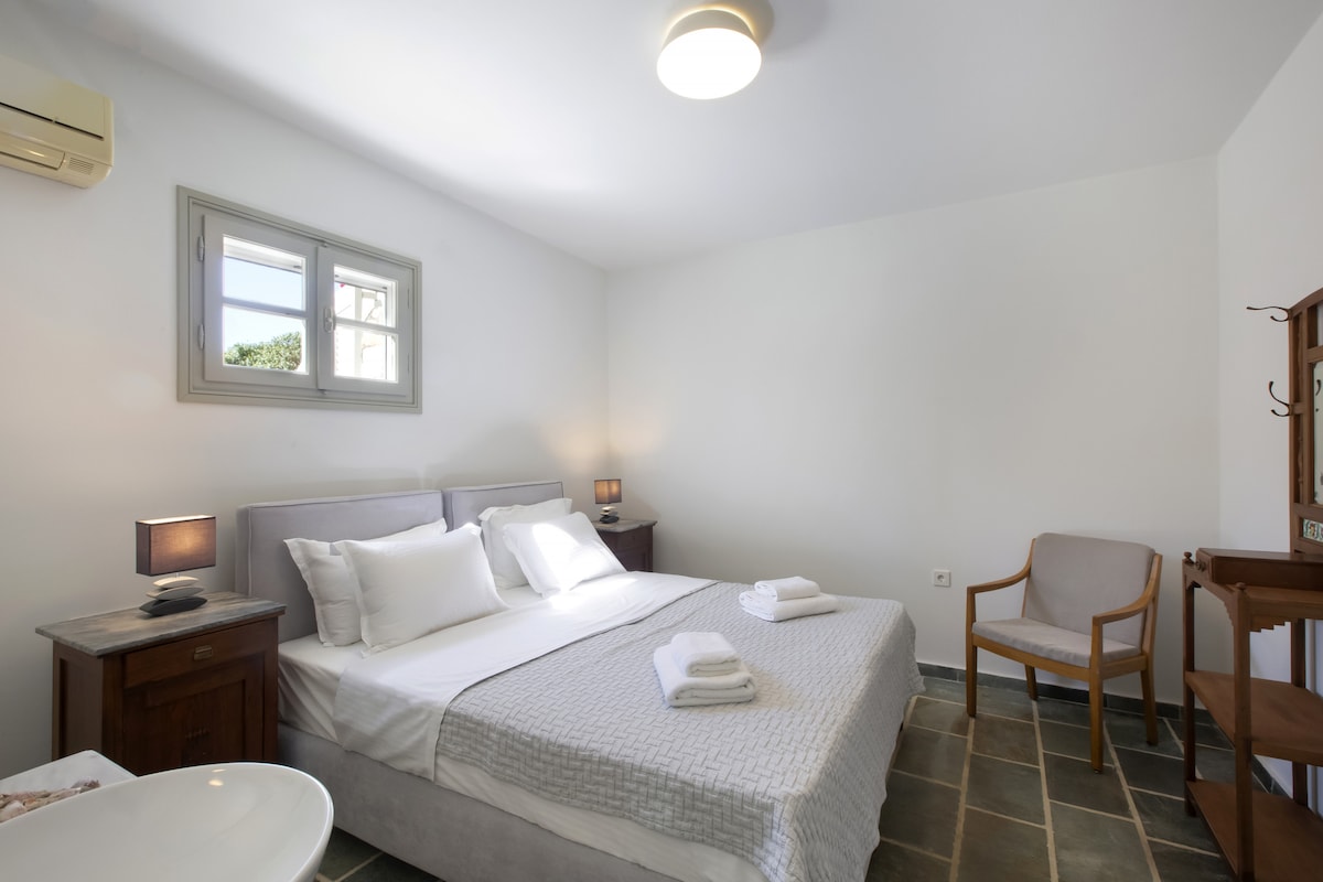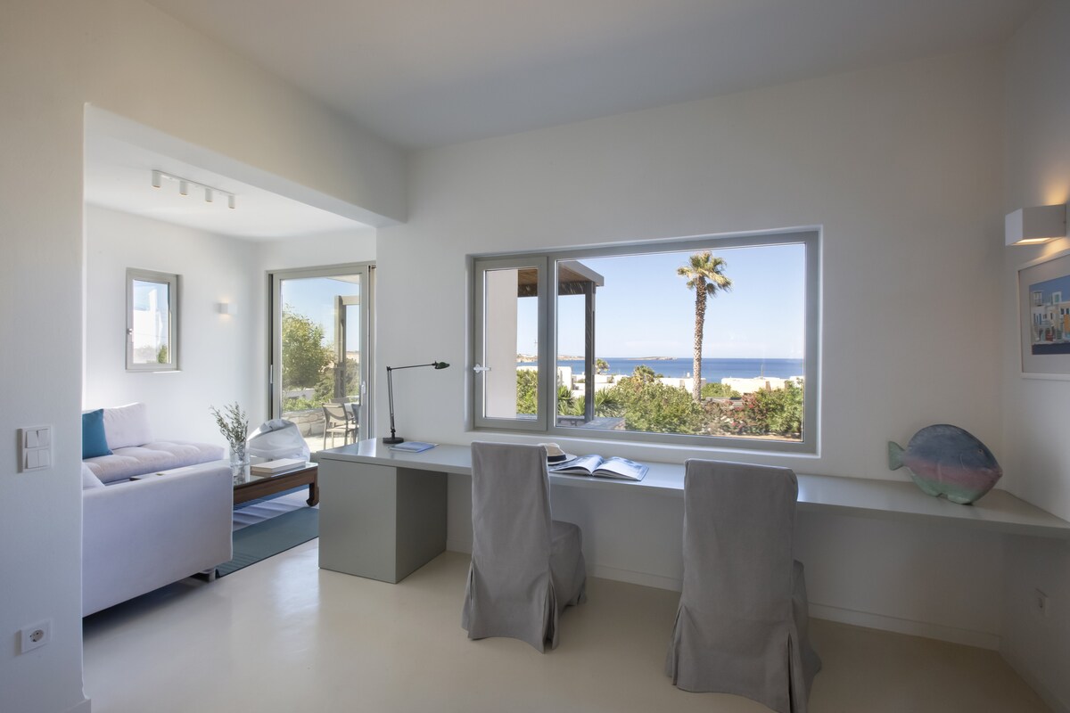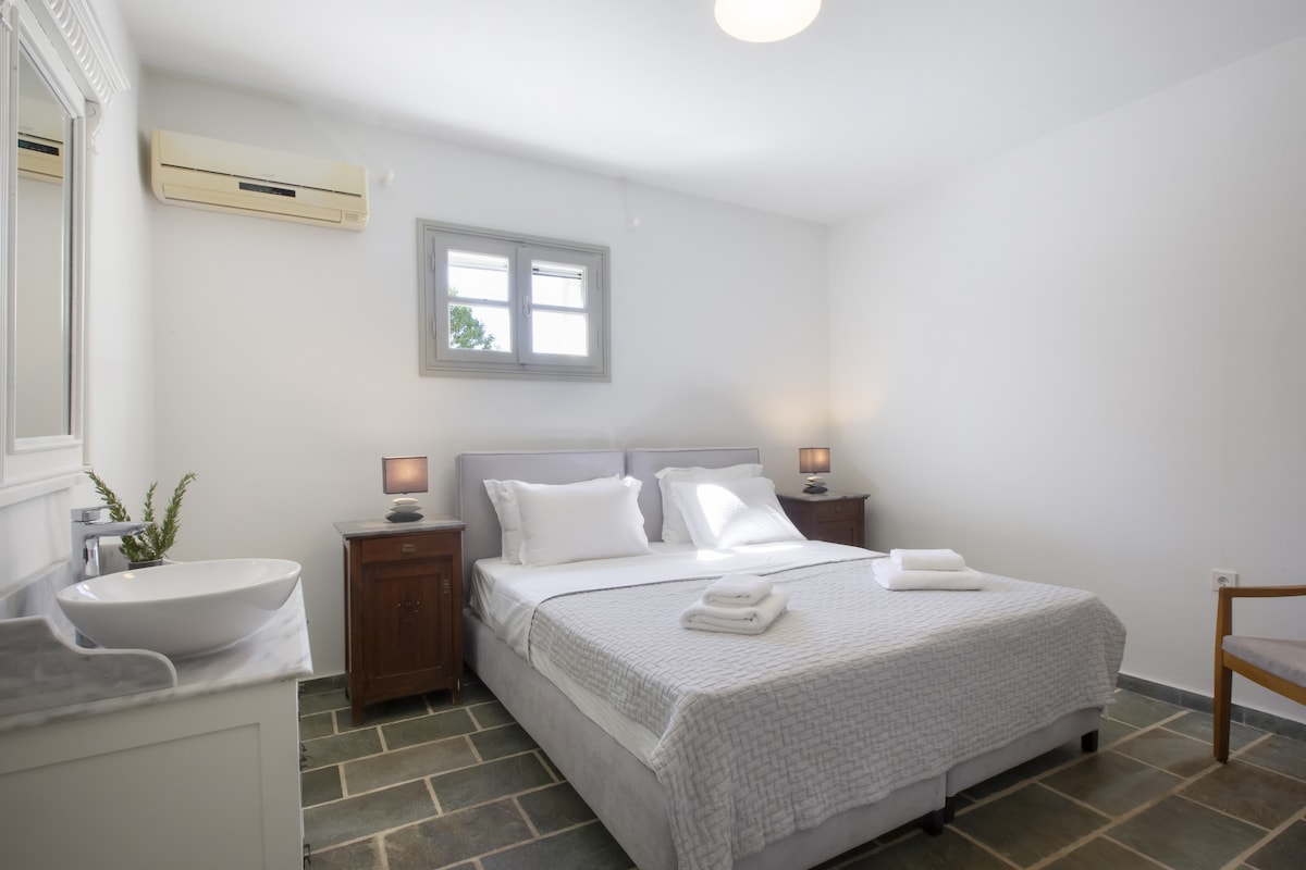 Rinia is the essential upmarket Paros villa. A beautiful family residence with stunning sea views and a large garden, it has many shaded areas outdoors for the whole party to wine and dine alfresco. Two gorgeous beaches are just a few steps away. Up to 8 guests can enjoy this villa very comfortably. For essentials and a bite to eat you can walk to the fishing village of Ambelas, while picturesque Naousa town with its bars, restaurants and shops is a just short drive away. White with green shutters, the villa is modern but has been built with respect to the local minimal Cycladic architecture, using mostly natural, locally sourced materials. Outdoors you can relax on the villa's shaded terrace with seaview You will have exclusive use of its large garden full of trees and aromatic plants. The residence’s large shaded terrace has a built double bed. There you will be able to relax day and night, take in the stunning sea and Paros views or have a bite to eat and something to drink during the gentle summer evenings. There is also a large Bbq that our residents love to use to cook with herbs picked from our garden. If you are there during July and August, don’t forget to pick some of your figs, they are absolutely delicious. Inside the house has been decorated with comfort and style in mind. There is a large living, dining and kitchen area with a functioning fireplace. The kitchen is modern and fully-equipped with everything you may need. The bedrooms are very spacious and look out onto the garden and the sea. All four have double beds. One of our bathrooms has a large bath tub and all come with modern showers. You will have exclusive access to the villa and its private garden. We will not be on the premises but we will often be staying nearby and are always available to assist and advise. Ambelas is a charming fishing village, a few minutes’ drive from Naousa town. There is a picturesque port, lovely beaches and plenty of tavernas offering the day’s catch. Some of Paros’ best known beaches, such as Santa Maria and Kolimbithres are just a short drive away. The village also has a riding school, a yoga and meditation centre and shops for necessities. It is a great spot for those wanting to explore Paros’ hillside traditional villages like Lefkes. The villa is located in a residential area within walking distance of Ambelas Even though you can walk to the nearest village, we recommend that you hire a car to enjoy your stay as there is no local bus stop near our home.Guest access