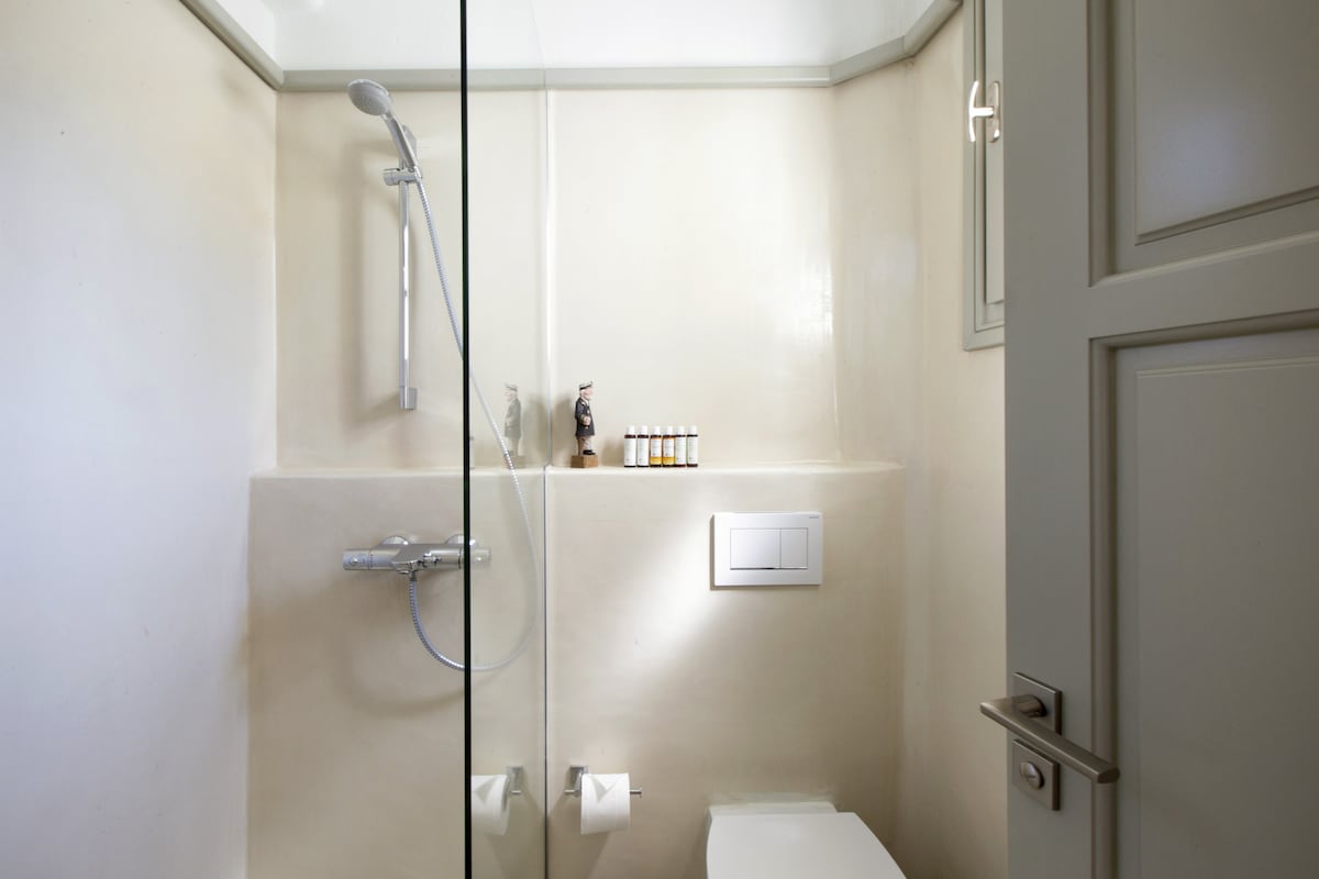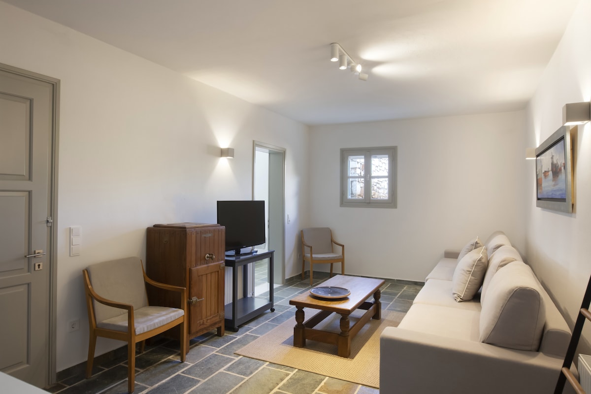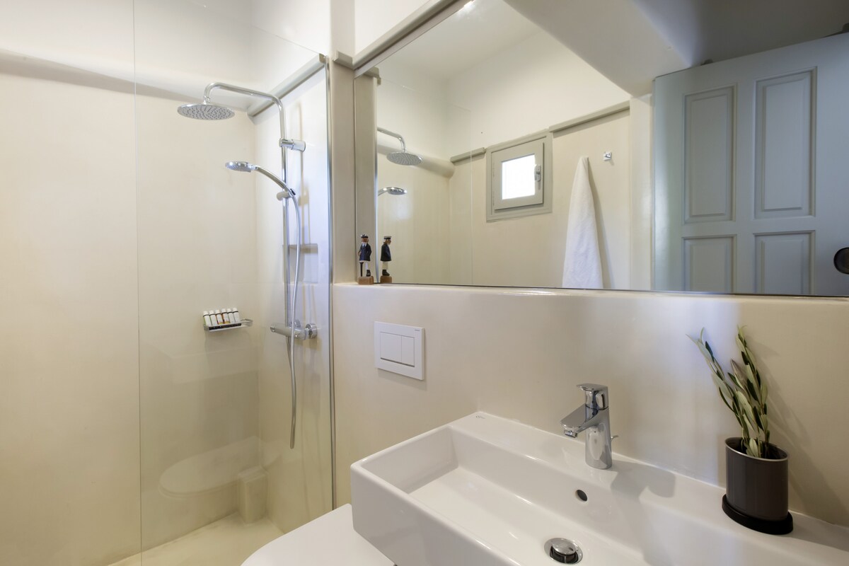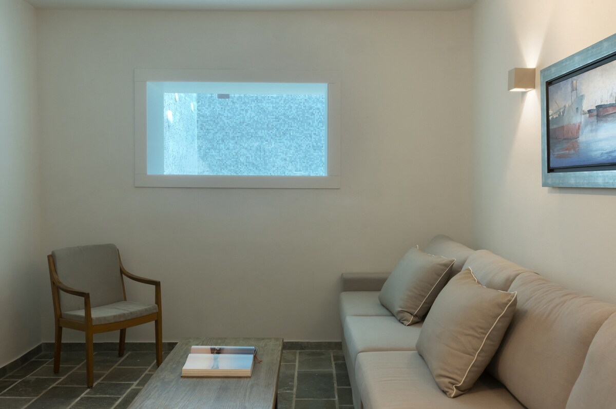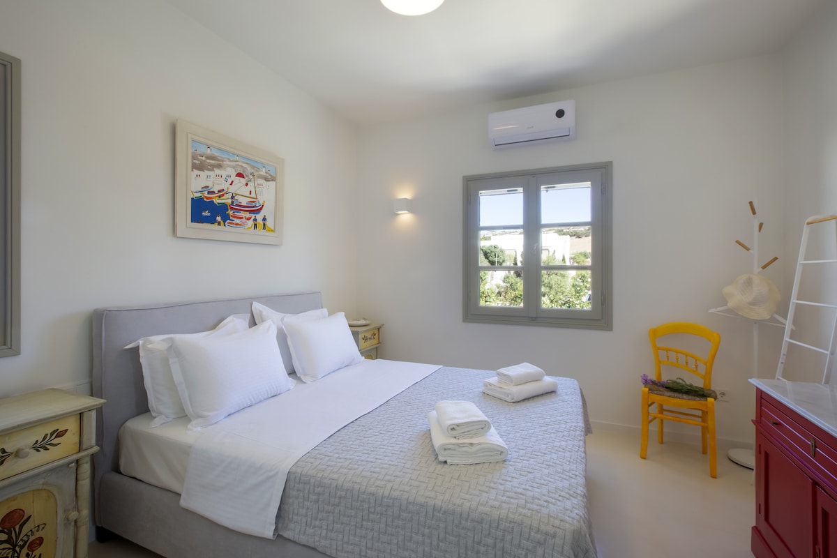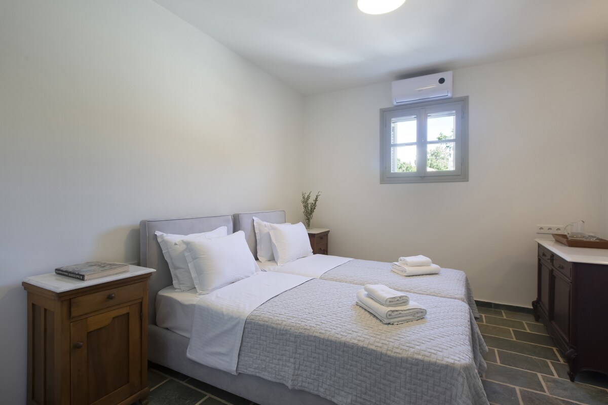 Rinia is the essential upmarket Paros villa. A beautiful family residence with stunning sea views and a large garden, it has many shaded areas outdoors for the whole party to wine and dine alfresco. Two gorgeous beaches are just a few steps away. Up to 8 guests can enjoy this villa very comfortably. For essentials and a bite to eat you can walk to the fishing village of Ambelas, while picturesque Naousa town with its bars, restaurants and shops is a just short drive away. White with green shutters, the villa is modern but has been built with respect to the local minimal Cycladic architecture, using mostly natural, locally sourced materials. Outdoors you can relax on the villa's shaded terrace with seaview You will have exclusive use of its large garden full of trees and aromatic plants. The residence’s large shaded terrace has a built double bed. There you will be able to relax day and night, take in the stunning sea and Paros views or have a bite to eat and something to drink during the gentle summer evenings. There is also a large Bbq that our residents love to use to cook with herbs picked from our garden. If you are there during July and August, don’t forget to pick some of your figs, they are absolutely delicious. Inside the house has been decorated with comfort and style in mind. There is a large living, dining and kitchen area with a functioning fireplace. The kitchen is modern and fully-equipped with everything you may need. The bedrooms are very spacious and look out onto the garden and the sea. All four have double beds. One of our bathrooms has a large bath tub and all come with modern showers. You will have exclusive access to the villa and its private garden. We will not be on the premises but we will often be staying nearby and are always available to assist and advise. Ambelas is a charming fishing village, a few minutes’ drive from Naousa town. There is a picturesque port, lovely beaches and plenty of tavernas offering the day’s catch. Some of Paros’ best known beaches, such as Santa Maria and Kolimbithres are just a short drive away. The village also has a riding school, a yoga and meditation centre and shops for necessities. It is a great spot for those wanting to explore Paros’ hillside traditional villages like Lefkes. The villa is located in a residential area within walking distance of Ambelas Even though you can walk to the nearest village, we recommend that you hire a car to enjoy your stay as there is no local bus stop near our home.Guest access