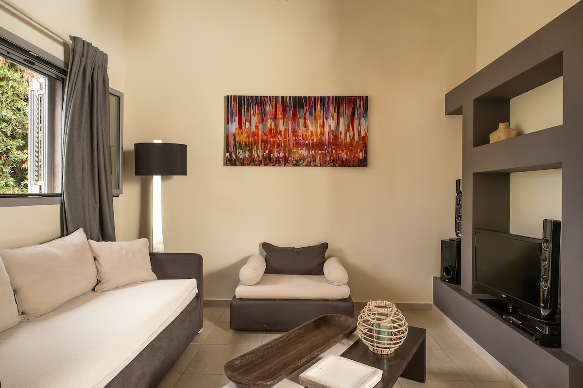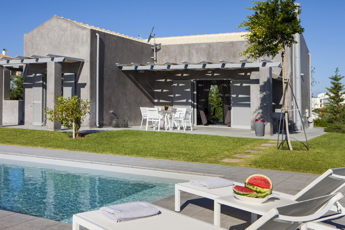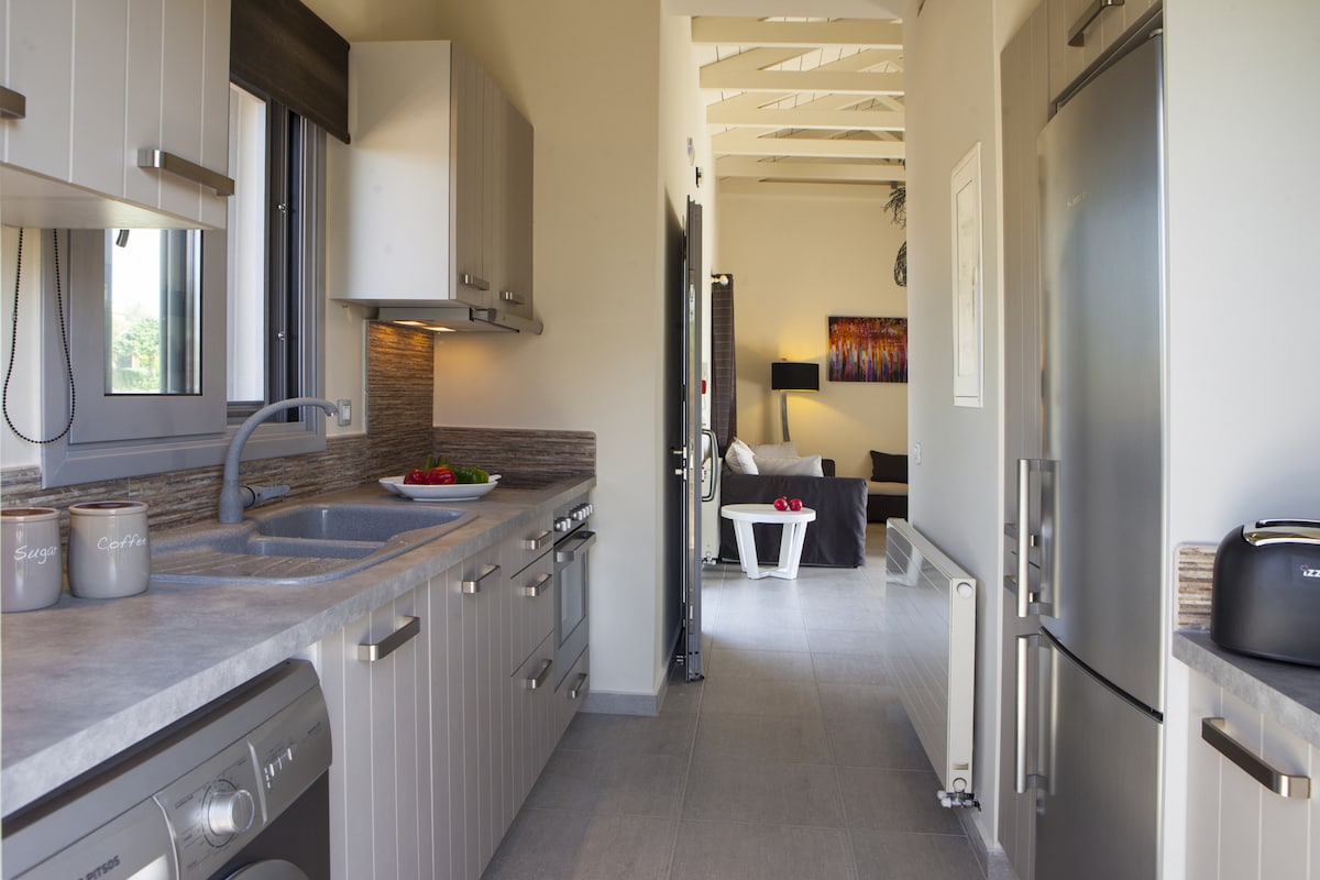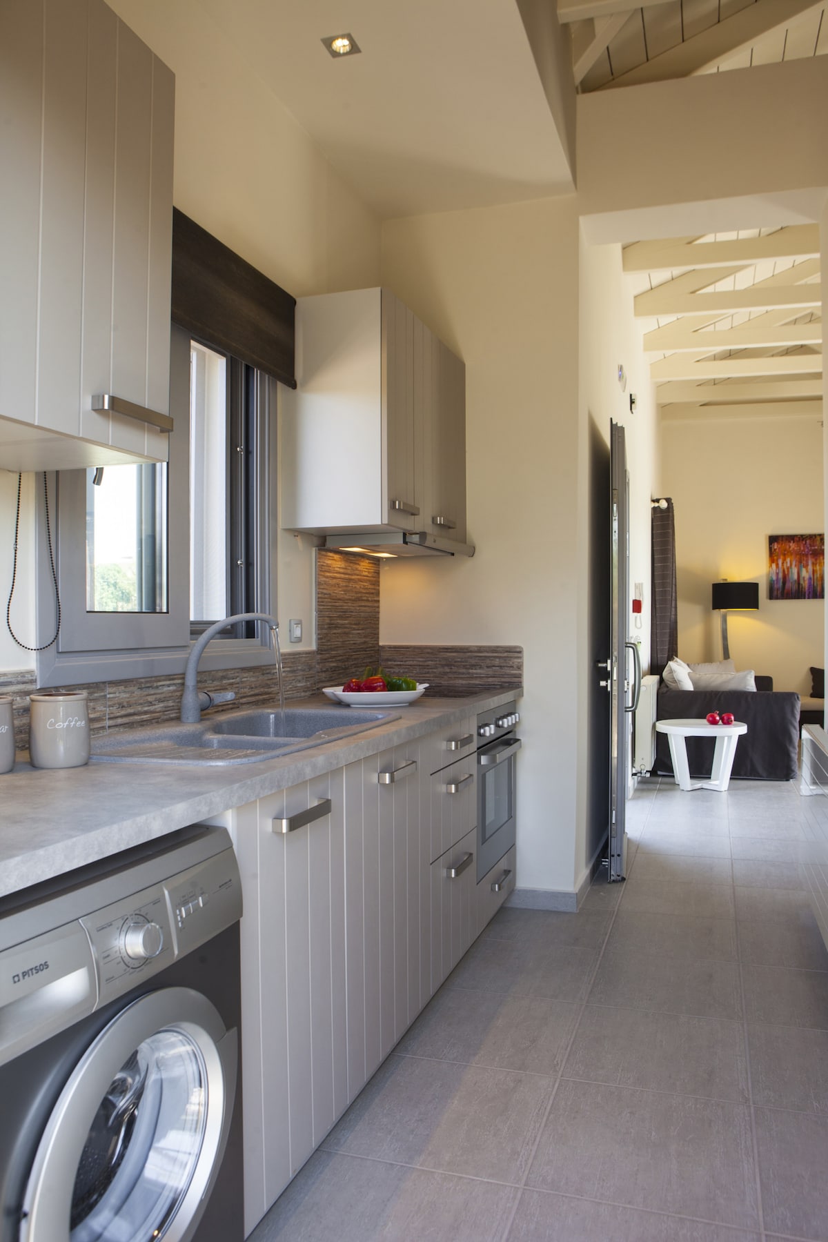 Villa Lefteris is set in a great location, within walking distance of local tavernas, shops and the two sandy beaches. This newly built, large modern one bedroom property has been styled and finished to a very high standard and sits within beautifully landscaped gardens. Villa Lefteris offers a spacious open plan and shabby chic design, offering beautiful pastel colours and wooden vaulted ceilings throughout.