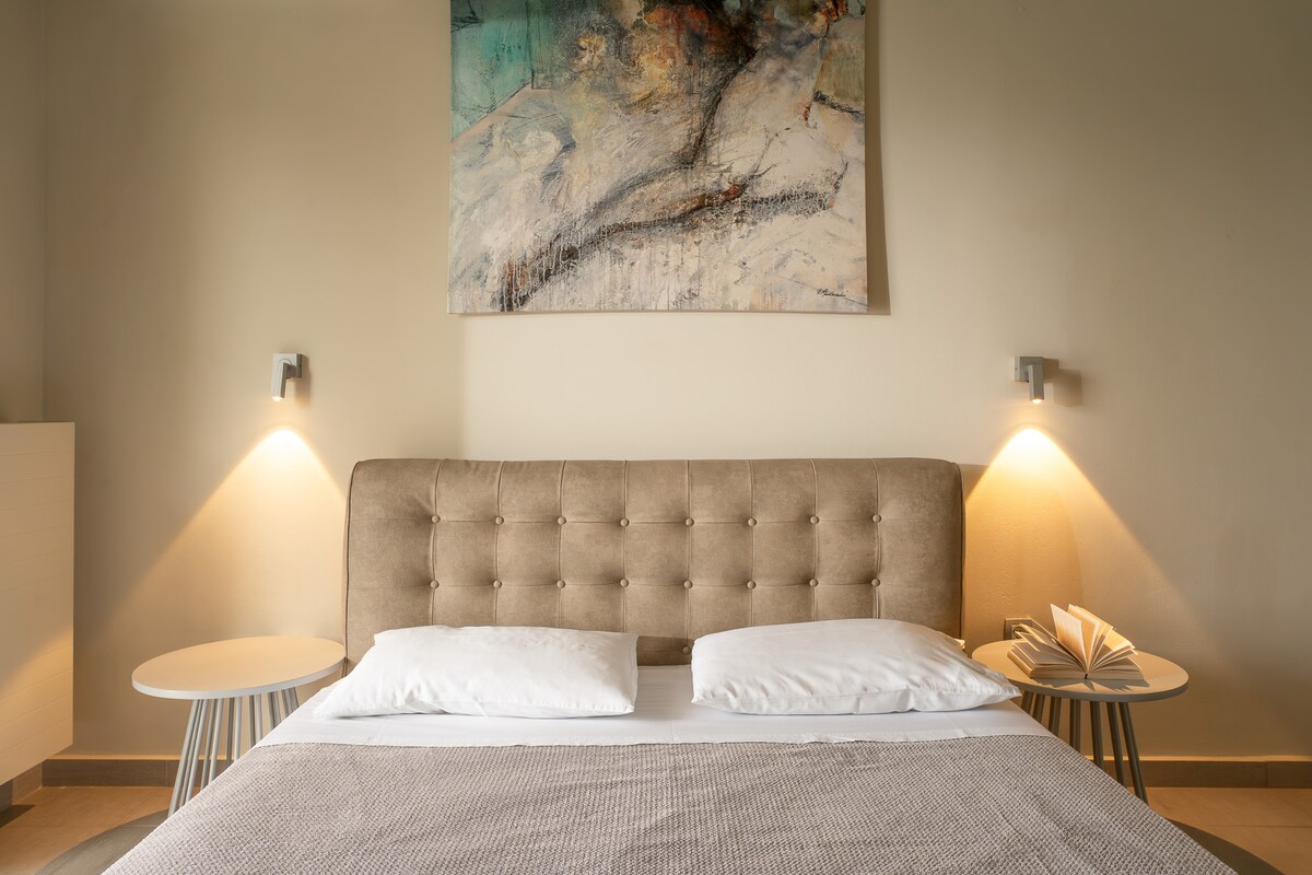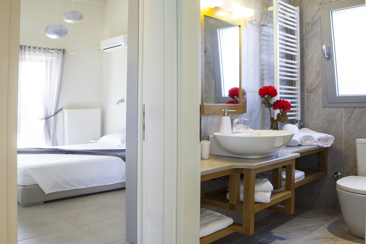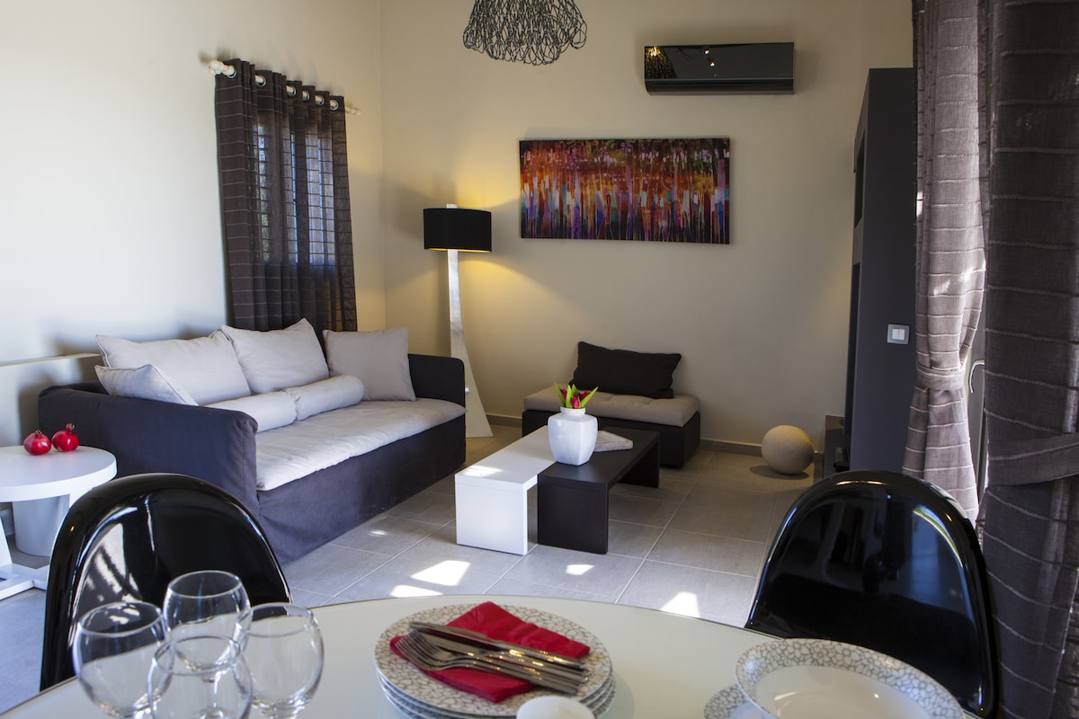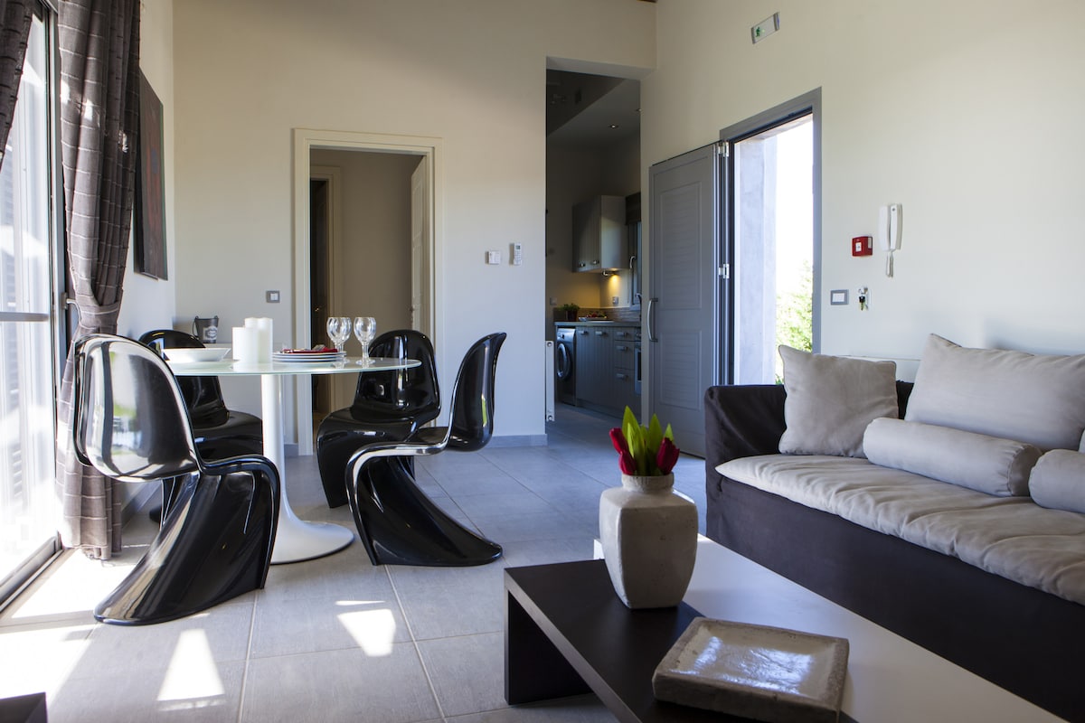 Villa Lefteris is set in a great location, within walking distance of local tavernas, shops and the two sandy beaches. This newly built, large modern one bedroom property has been styled and finished to a very high standard and sits within beautifully landscaped gardens. Villa Lefteris offers a spacious open plan and shabby chic design, offering beautiful pastel colours and wooden vaulted ceilings throughout.