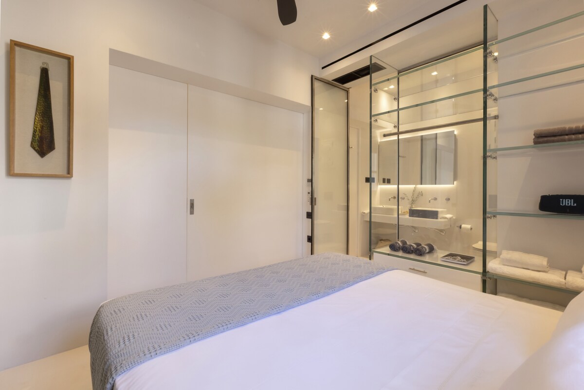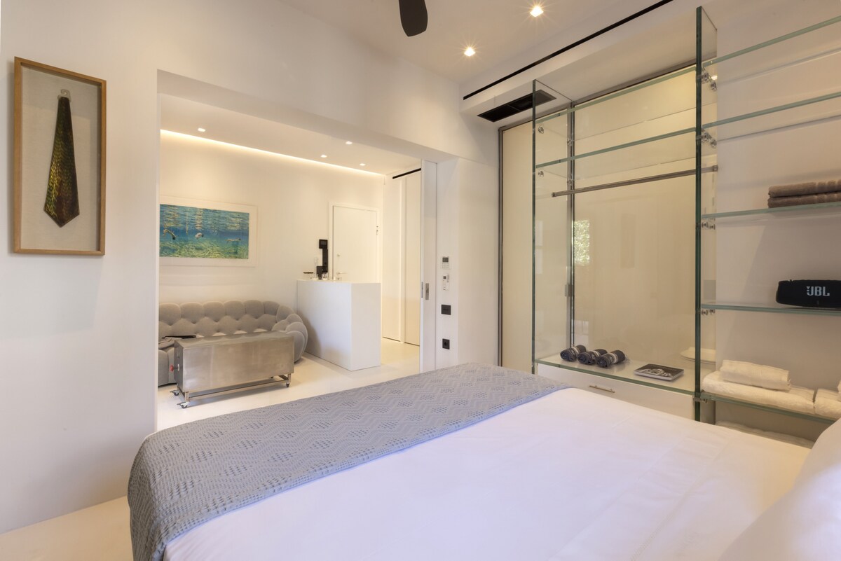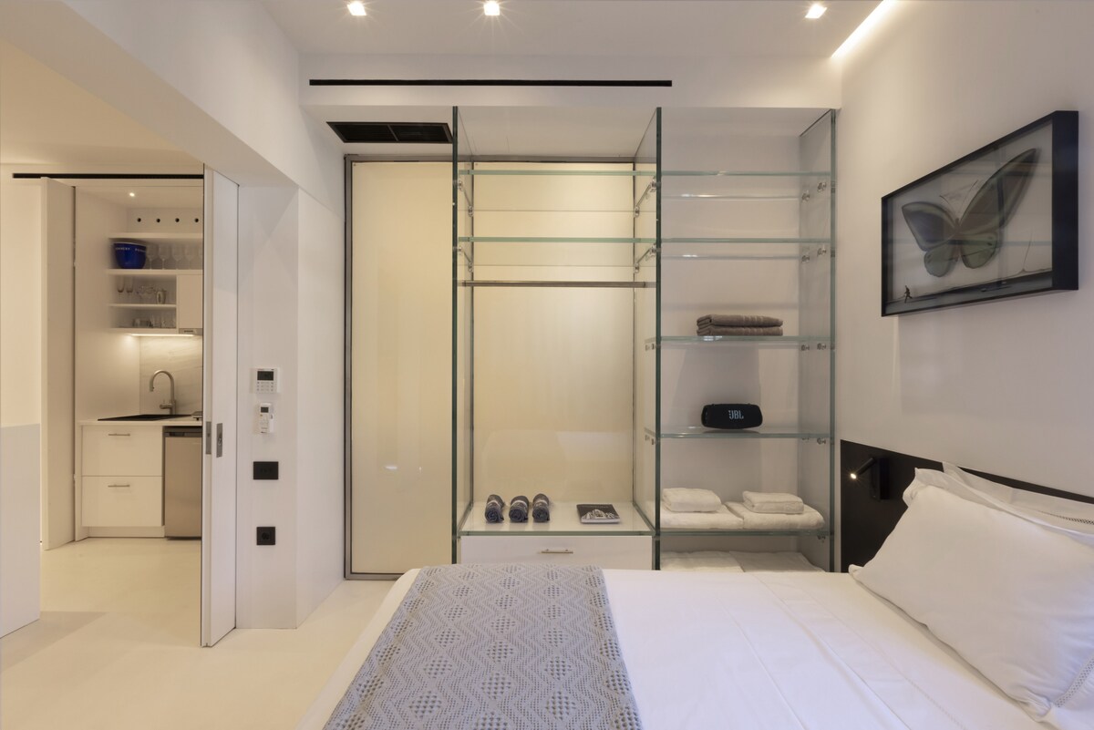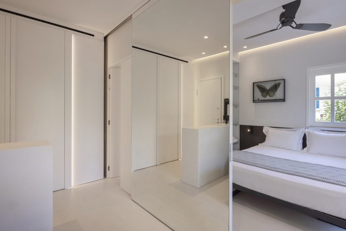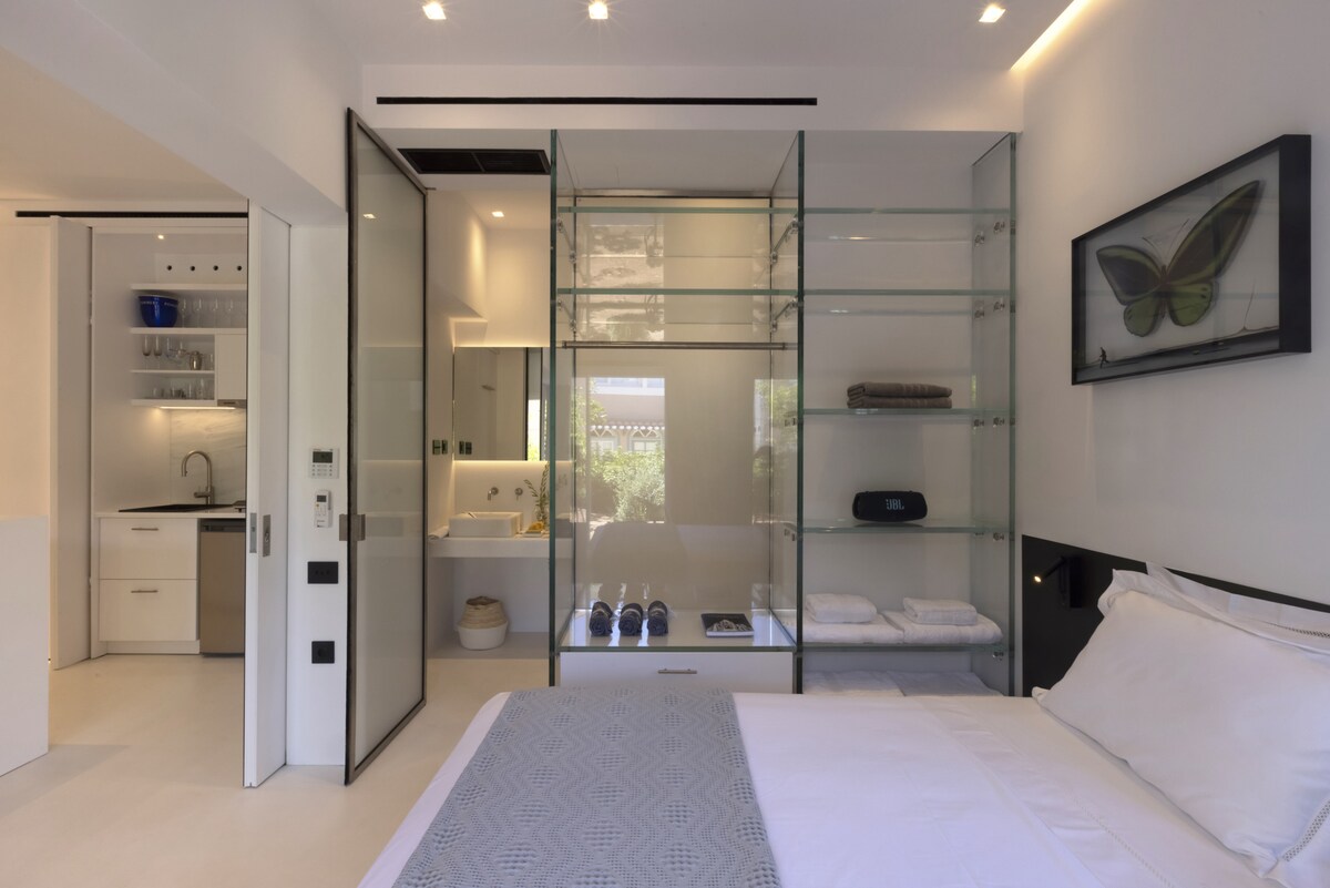 A truely elegant property hidden in the picturesque residential old harbor Spetses area, literally only a couple of minutes walk from the island's best bars and restaurants! Its a cozy small-sized appartment with modern minimal design, in off-white and dark grey/black details mood and incredible ergonomic use of the space, featuring a fully equipped concealed kitchen, an open glass wardrobe, variable transparency glass wall and door to the bathroom, king size bed, designer sofa and lot of nice artwork. Bathroom with nice marble sinks and shower area. Sliding doors with full height mirrors between living room and bedroom provide sleeping privacy while using the rest of the appartment. On the outside a nice secluded veranda extending to a private garden of lemon, orange and olive trees, with ambient night lighting and illuminated pots with basil and herbs, makes it a perfect spot for late night relaxing with a glass of wine! An amazing overall property that we plan to visit again!