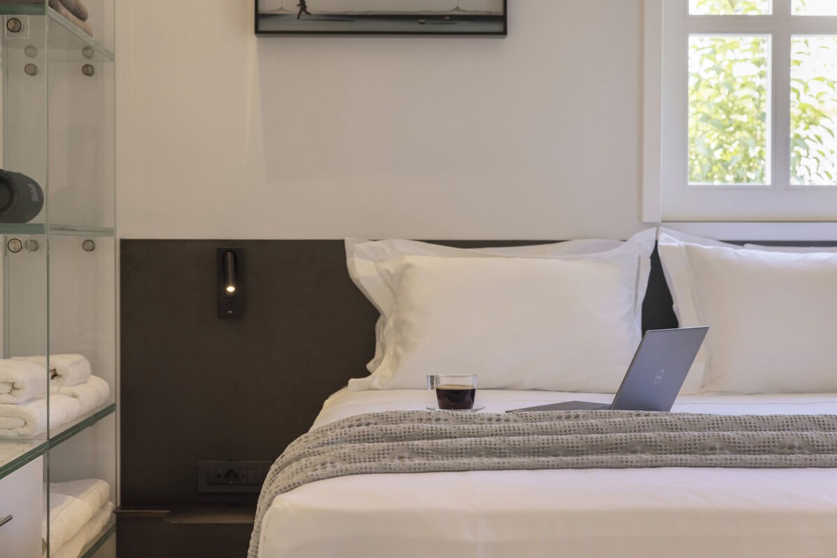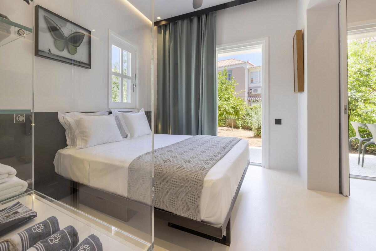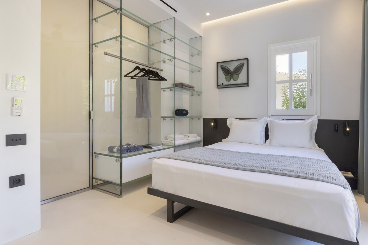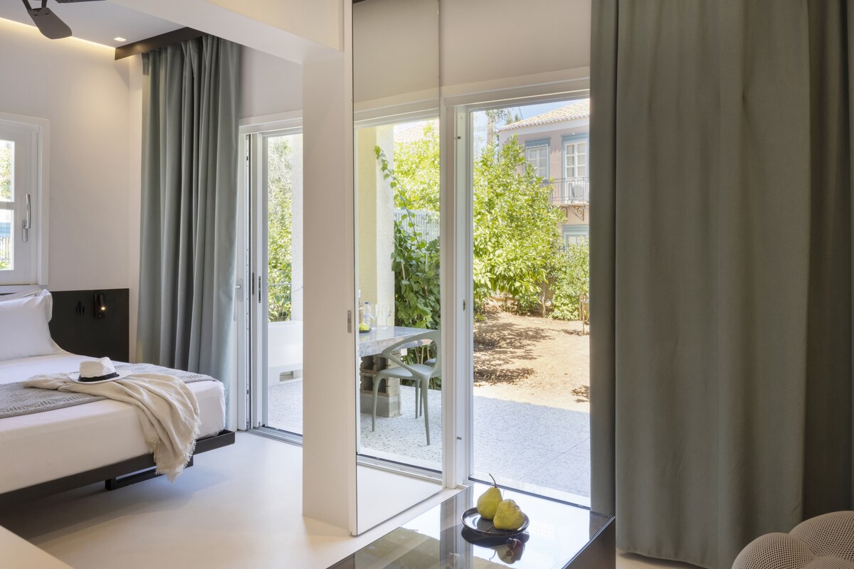 Welcome to our luxurious and modern suite, perfect for couples or solo travelers. Nestled in the old port of Spetses, our suite is just 100m away from the island's vibrant cafes, restaurants, and shops. Explore the scenic waterfront, visit local museums, or rent a bike to discover hidden beaches and picturesque trails. Experience the charm of Spetses island from our contemporary suite enjoying its relaxing location. This stylish and modern space, designed by a famous architect, offers all the comforts you need for a memorable stay. Relax on the unique, plush Roche Bobois couch while enjoying a movie on the wall-mounted flat-screen Tv. The vintage coffee table doubles as a foosball game, adding a fun and artistic touch to your evenings. The comfortable double bed, is adorned with high-quality mattress and linens, ensuring a restful night's sleep. You can choose the overhead ceiling fan or Ac to cool the suite. Fully equipped with a microwave & grill, mini-fridge, coffee maker, and all necessary utensils to prepare simple meals. It also includes washing machine and dishwasher. Open shelving provides easy access to kitchenware. Features a luxurious walk-in shower with marble accents, dual sinks, and modern fixtures for a spa-like experience of a 5* hotel. Step outside to a private patio where you can enjoy a glass of wine and fresh fruit under the Mediterranean sun. Guests have exclusive access to the entire suite as well as the garden full of flowers and lemon trees. Enjoy the privacy and convenience of a self-contained space during your stay. We respect our guests' privacy but are always available to provide recommendations or assistance as needed.Other things to note