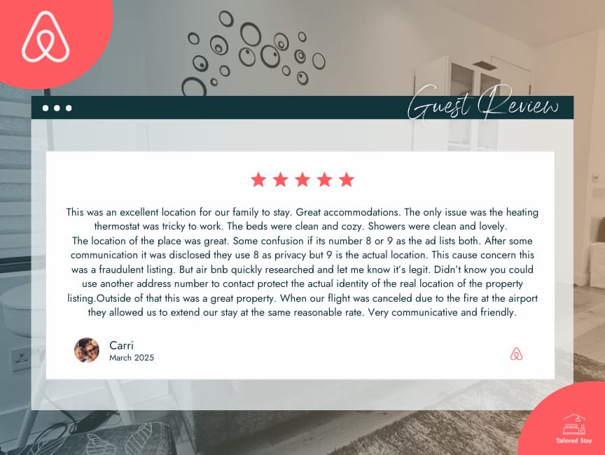 This was an excellent location for our family to stay. Great accommodations. The only issue was the heating thermostat was tricky to work. The beds were clean and cozy. Showers were clean and lovely. The location of the place was great. Some confusion if its number 8 or 9 as the ad lists both. After some communication it was disclosed they use 8 as privacy but 9 is the actual location. This cause concern this was a fraudulent listing. But air bnb quickly researched and let me know it’s legit. Didn’t know you could use another address number to contact protect the actual identity of the real location of the property listing. Outside of that this was a great property. When our flight was canceled due to the fire at the airport they allowed us to extend our stay at the same reasonable rate. Very communicative and friendly.