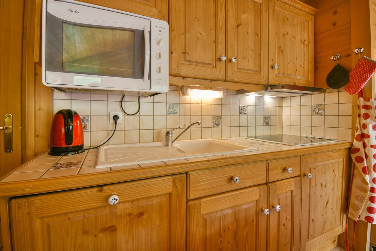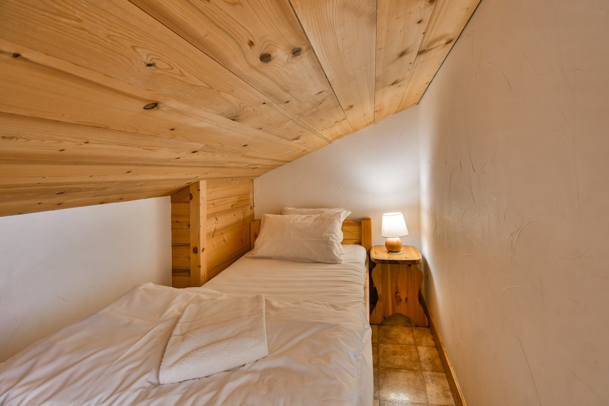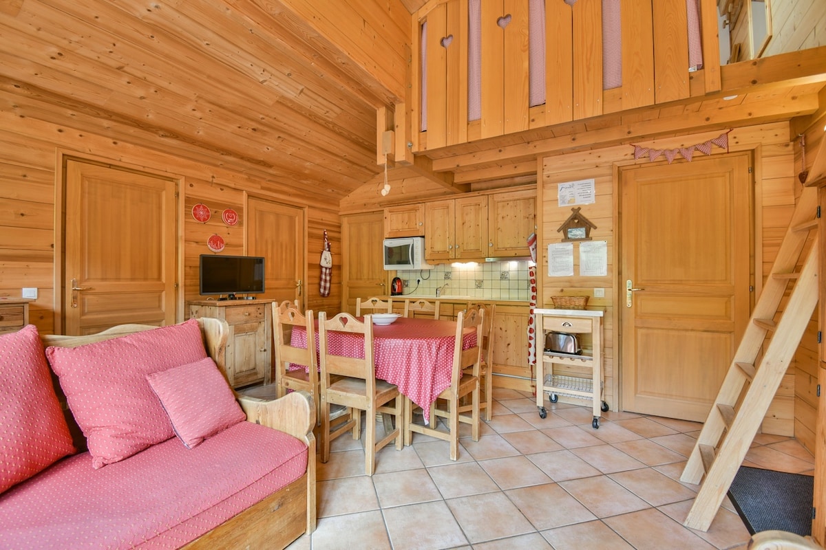 Apartment ideally located, 5 minutes walk from the departure of the chairlifts, and direct access to the shops. Nice accommodation, well equipped with dishes and appliances, overlooking the ski area, large balcony. The mezzanine double bed is accessible only for adults or large children.
