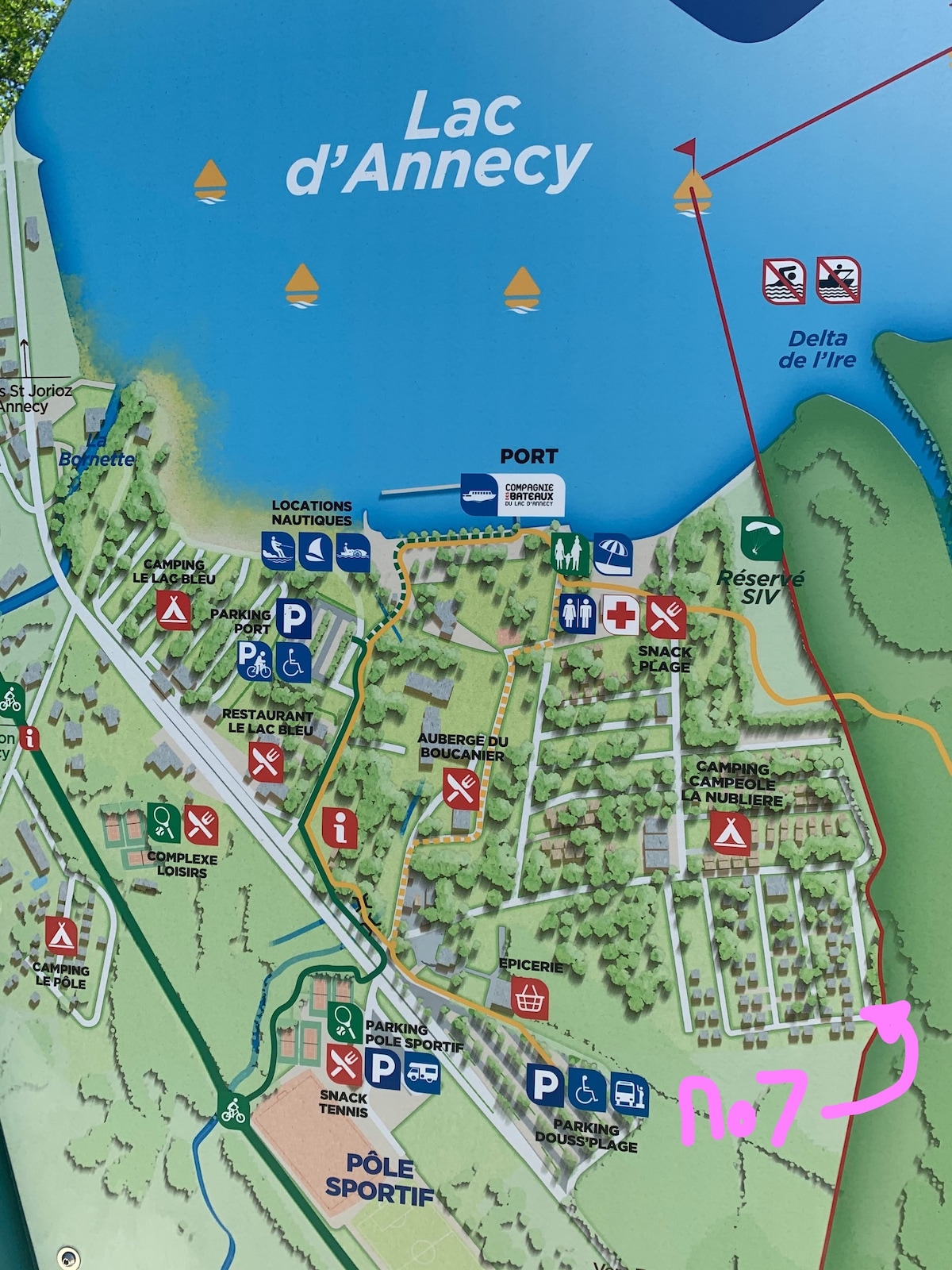2 minutes walk through campsite to the beach on lake Annecy and all the amenities.