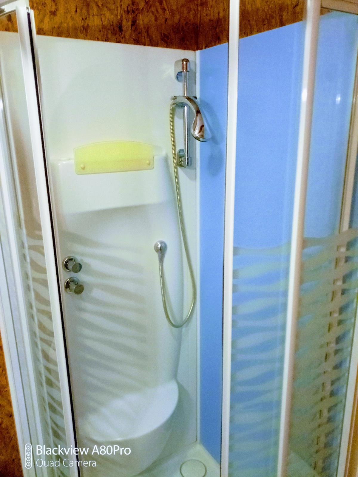 Bathroom - shower cubicle, sink, washing machine and hairdryer.