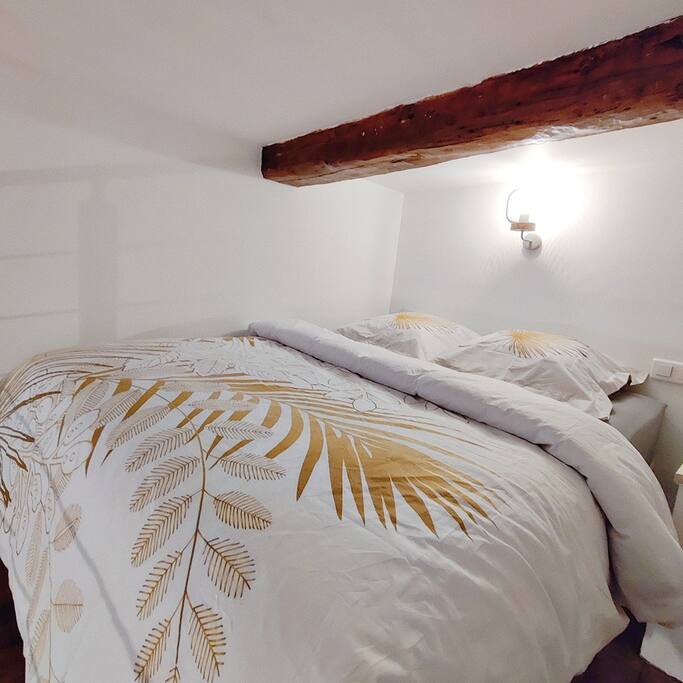 The sleeping area is located in the mezzanine which is reached by a wooden staircase. In the mezzanine is the comfortable bed and a small dresser; from up there you will get a better feeling of the high ceiling (-: