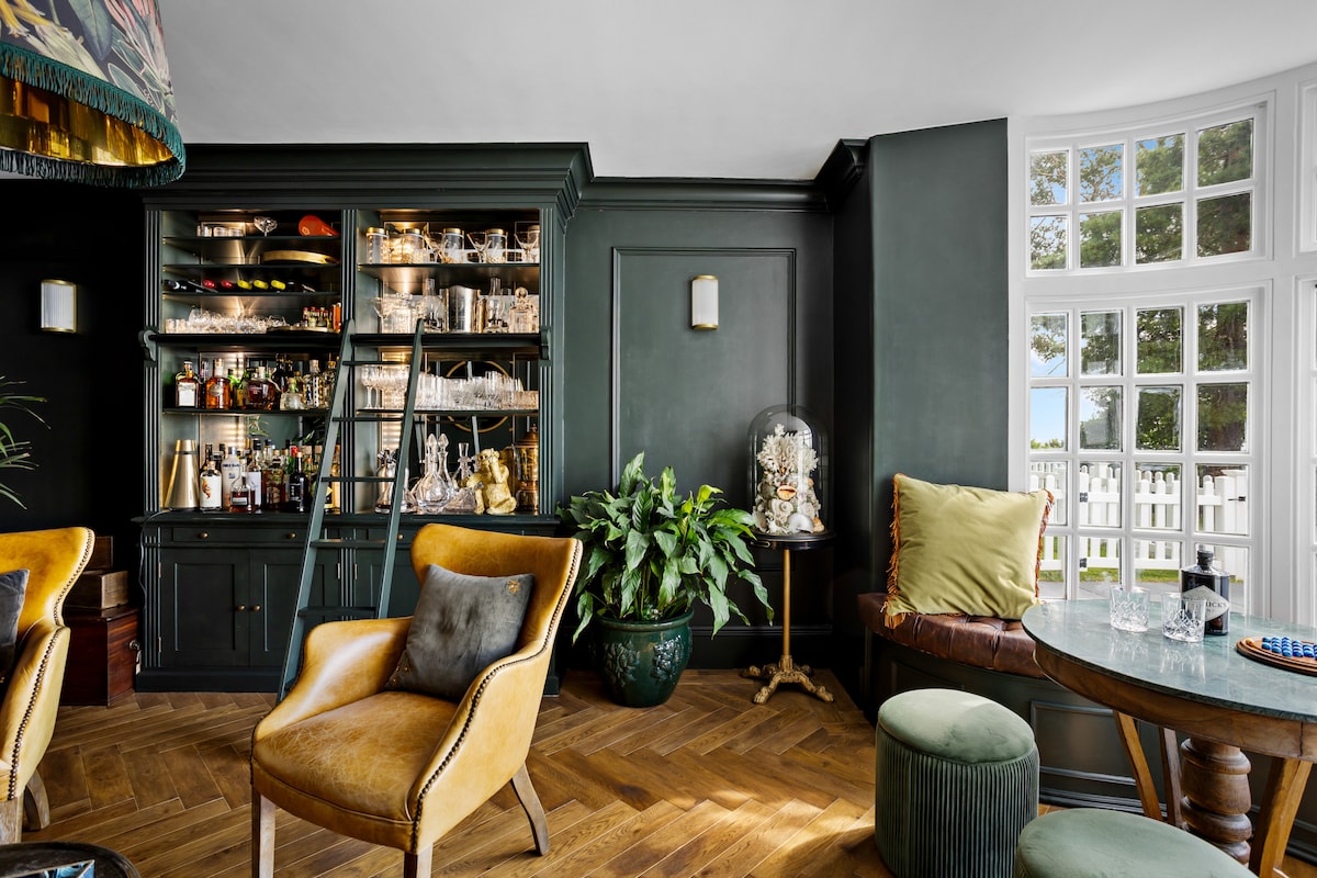 Herringbone flooring leads to a cosy snug with velvet armchairs, a wood-burning stove, and a bespoke bar, an ideal place for celebratory toasts. Sit in the sumptuous bay window playing a game of cards or solitaire as the evening draws to a close.