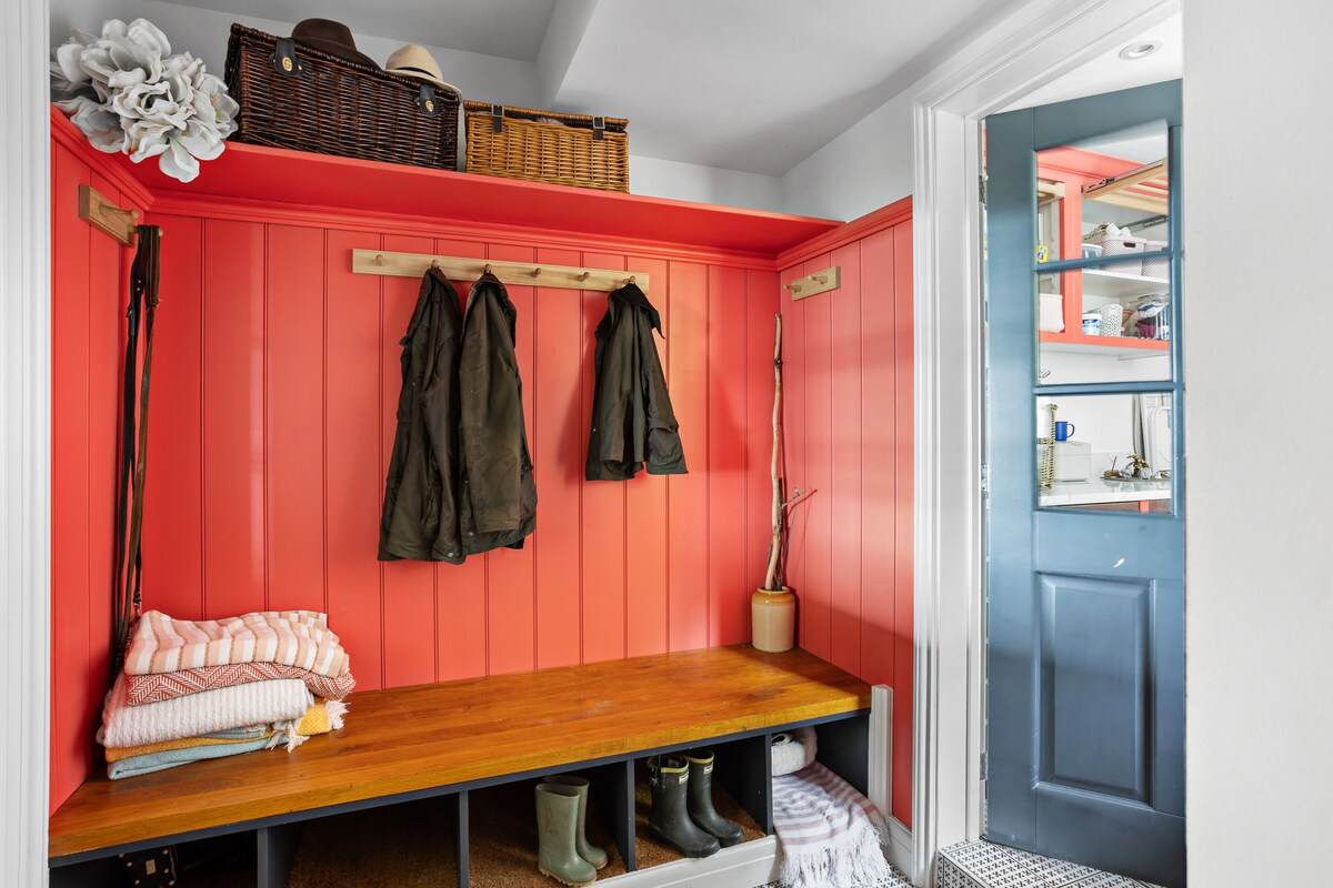 A pink-painted cloakroom and boot room with laundry facilities, wine fridges and drying space ensures practicality after Dartmoor adventures or beach days.