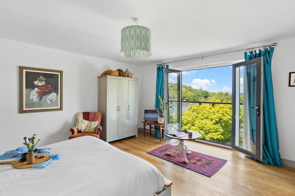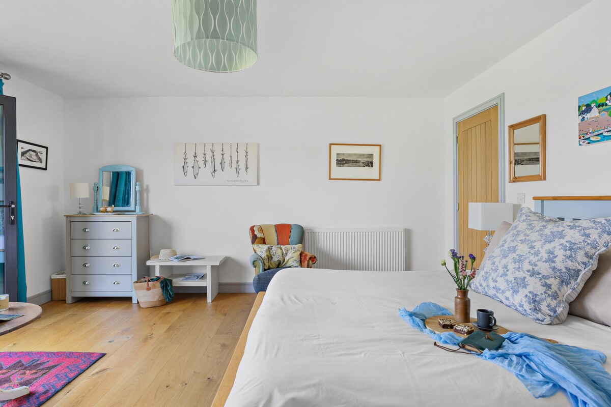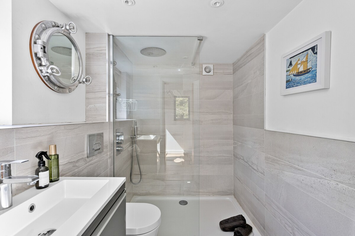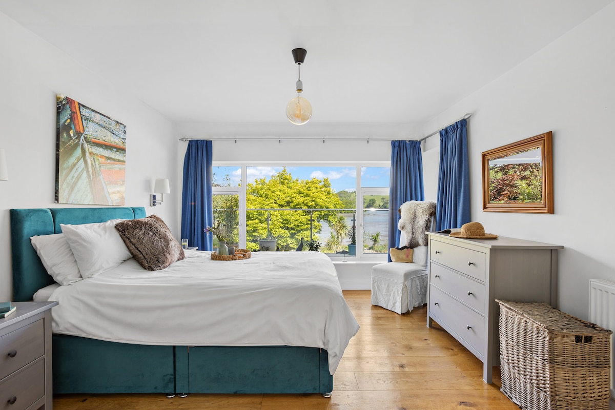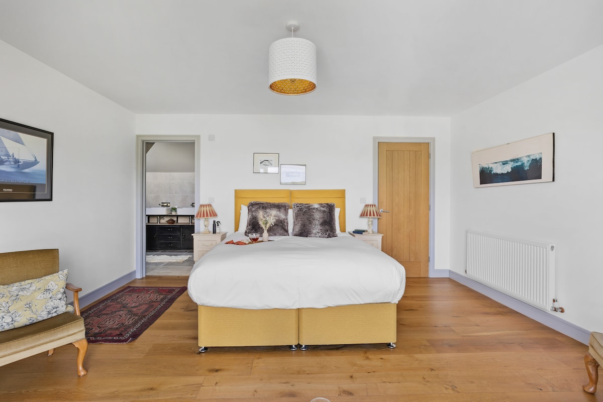 The main house offers four luxurious bedrooms, while the separate Boathouse accommodates an additional two guests, providing plenty of space and privacy. On the ground floor of the main house, you’ll find a superking bedroom with a large picture window overlooking the garden. A large Jack and Jill bathroom connects the bedroom to Bedroom 4, which is furnished with a single daybed and trundle, providing two additional single beds,king size double. This bathroom features a double-ended jacuzzi bath, walk-in shower, washbasin, and Wc.