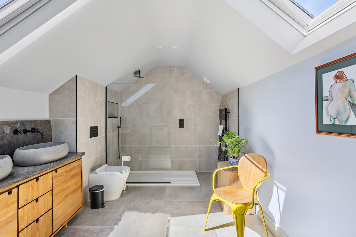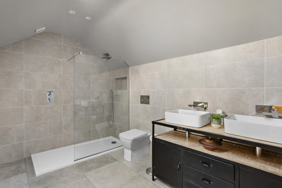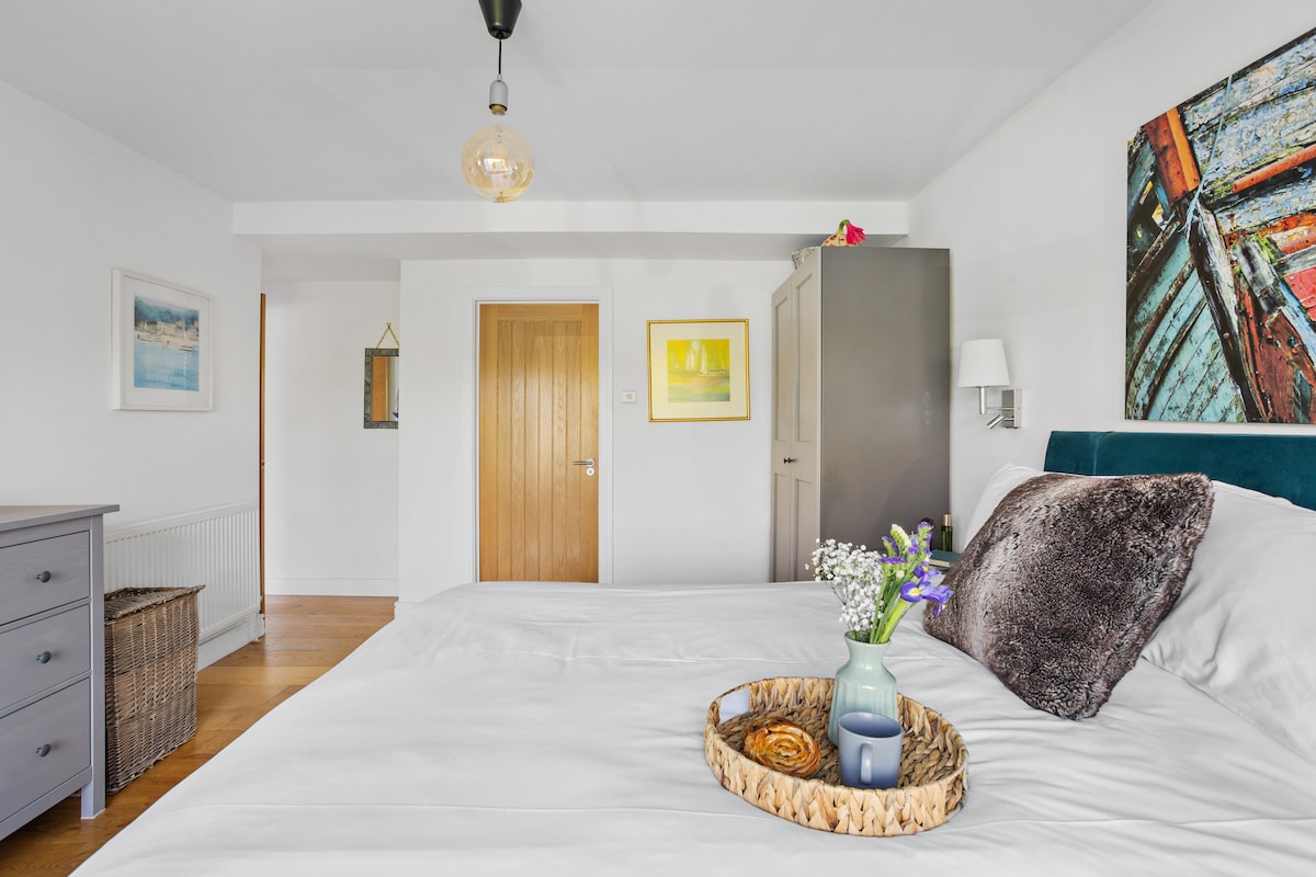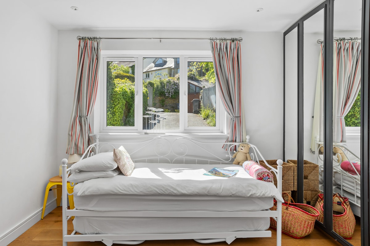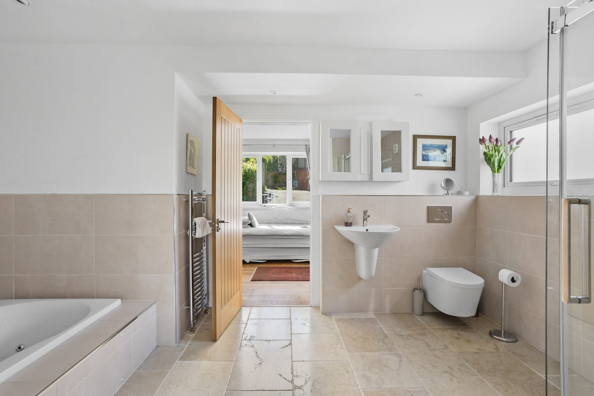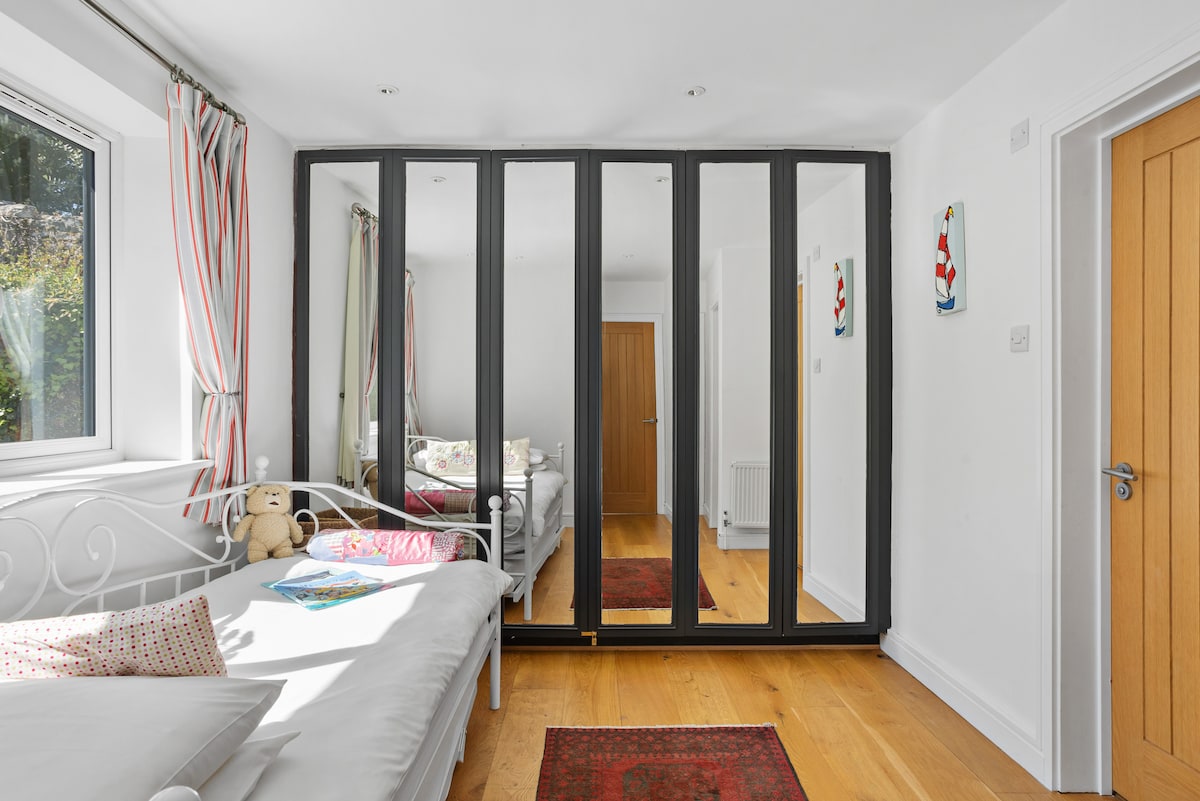 The main house offers four luxurious bedrooms, while the separate Boathouse accommodates an additional two guests, providing plenty of space and privacy. On the ground floor of the main house, you’ll find a superking bedroom with a large picture window overlooking the garden. A large Jack and Jill bathroom connects the bedroom to Bedroom 4, which is furnished with a single daybed and trundle, providing two additional single beds,king size double. This bathroom features a double-ended jacuzzi bath, walk-in shower, washbasin, and Wc.