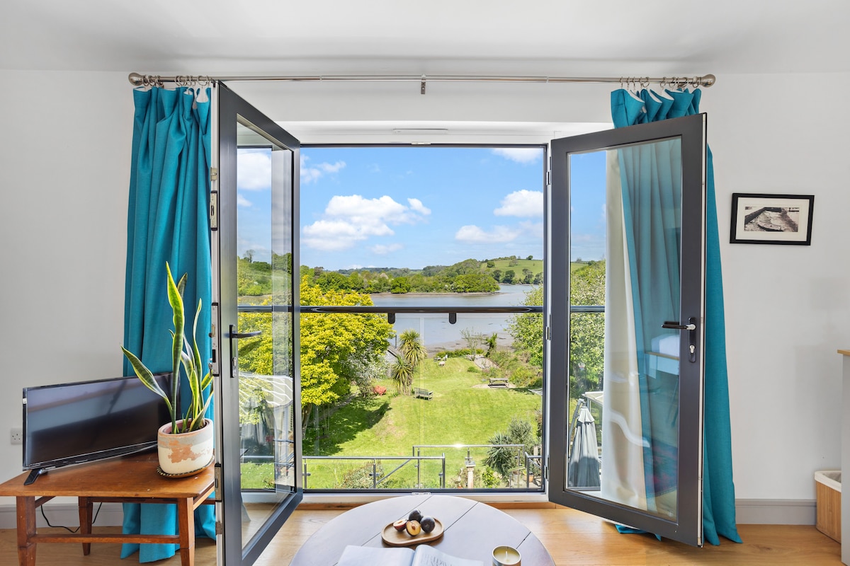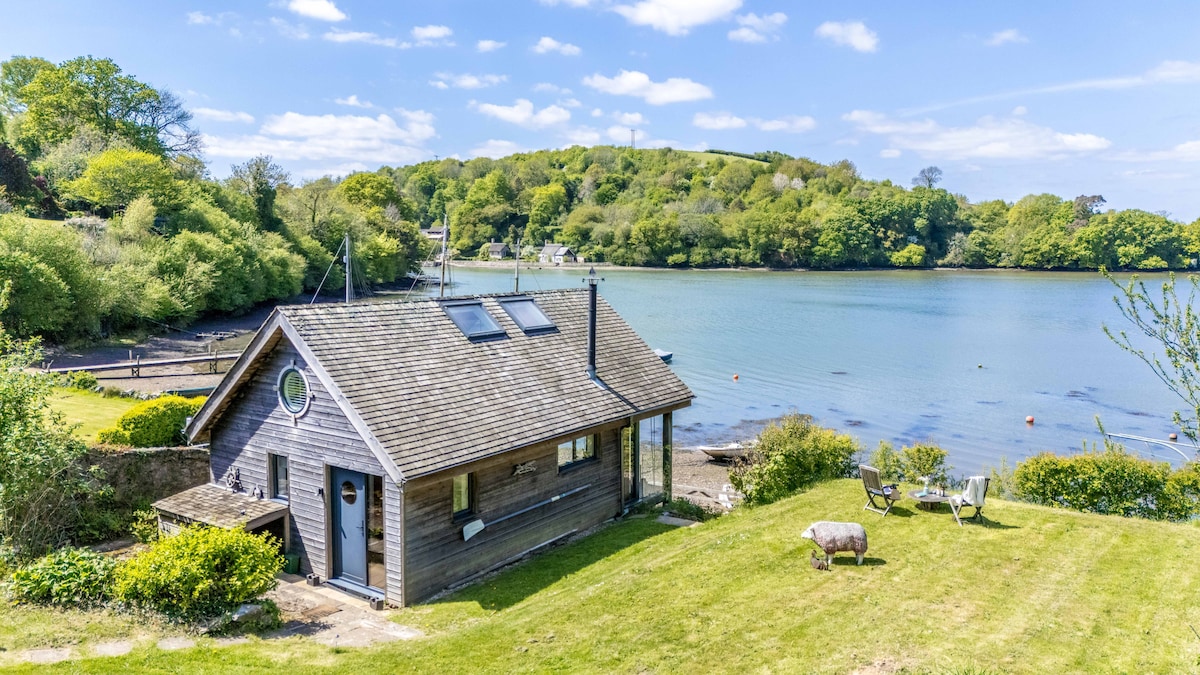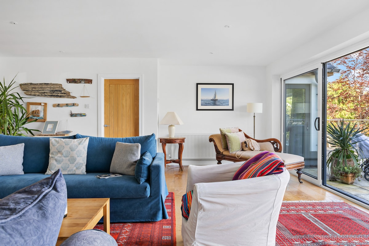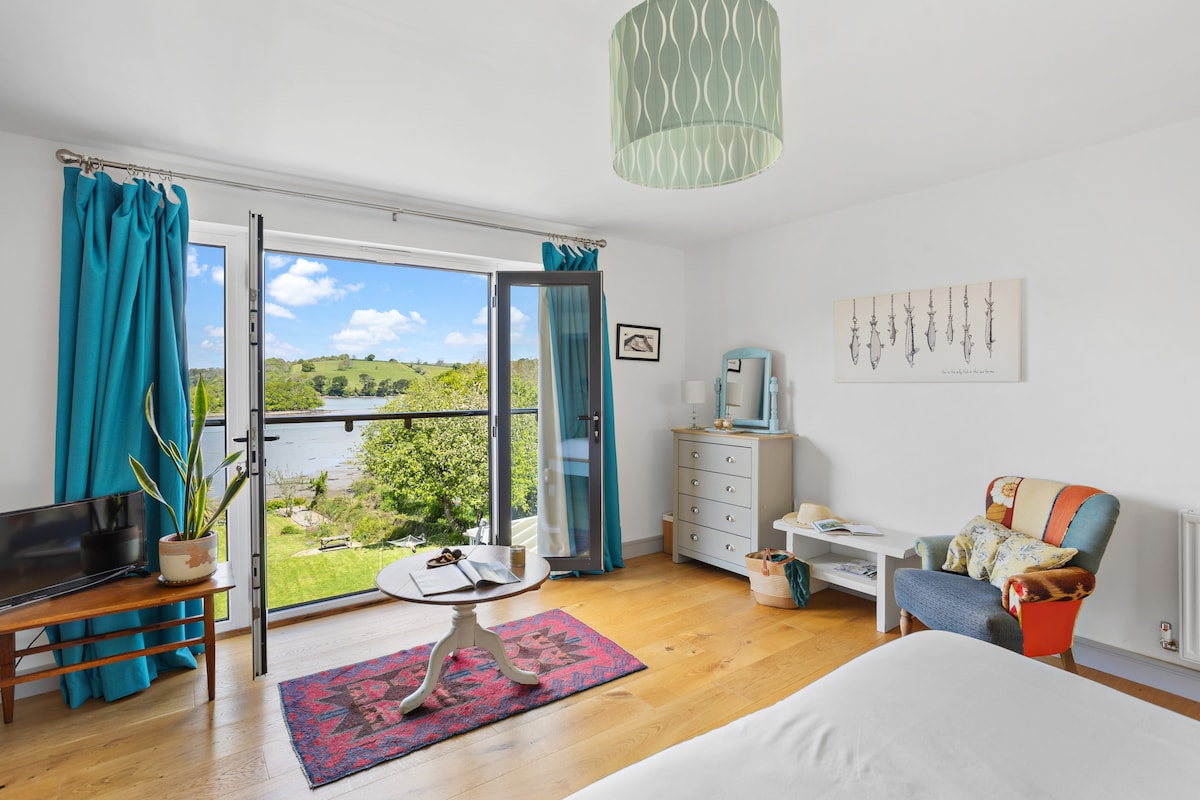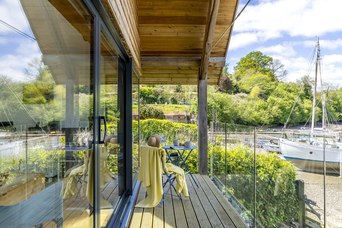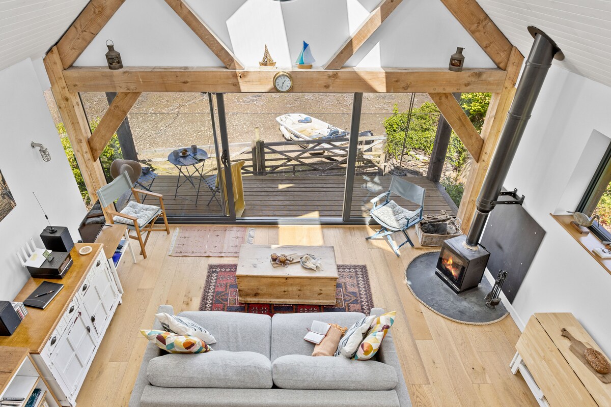 The Boathouse, located right on the water's edge at the bottom of the garden, offers a cozy retreat for two guests. The open-plan living area is filled with natural light, and large sliding doors open onto a private balcony with breathtaking views of the water. The compact yet fully equipped kitchen allows for independent dining, while the mezzanine bedroom, accessed by "ship's steps," offers a snug double bed. For additional sleeping space, there is also a sofa bed in the lounge.