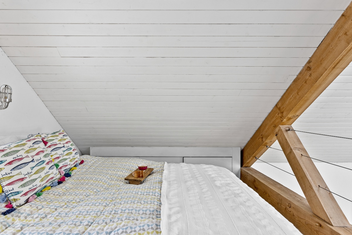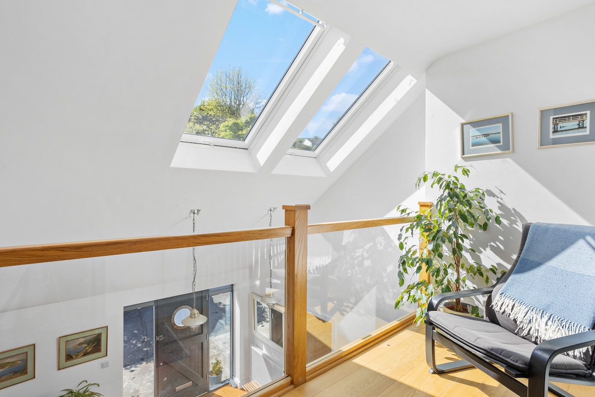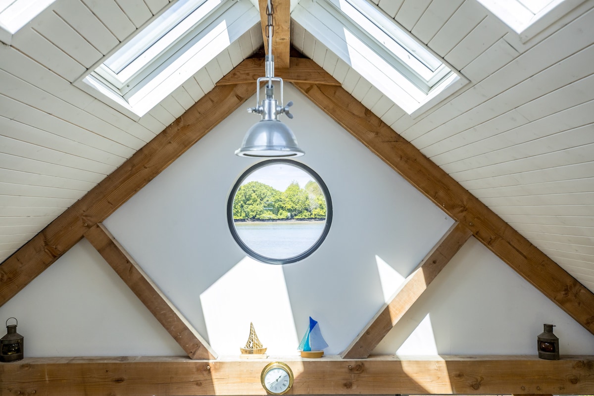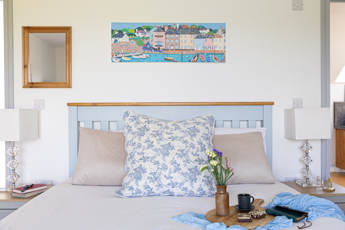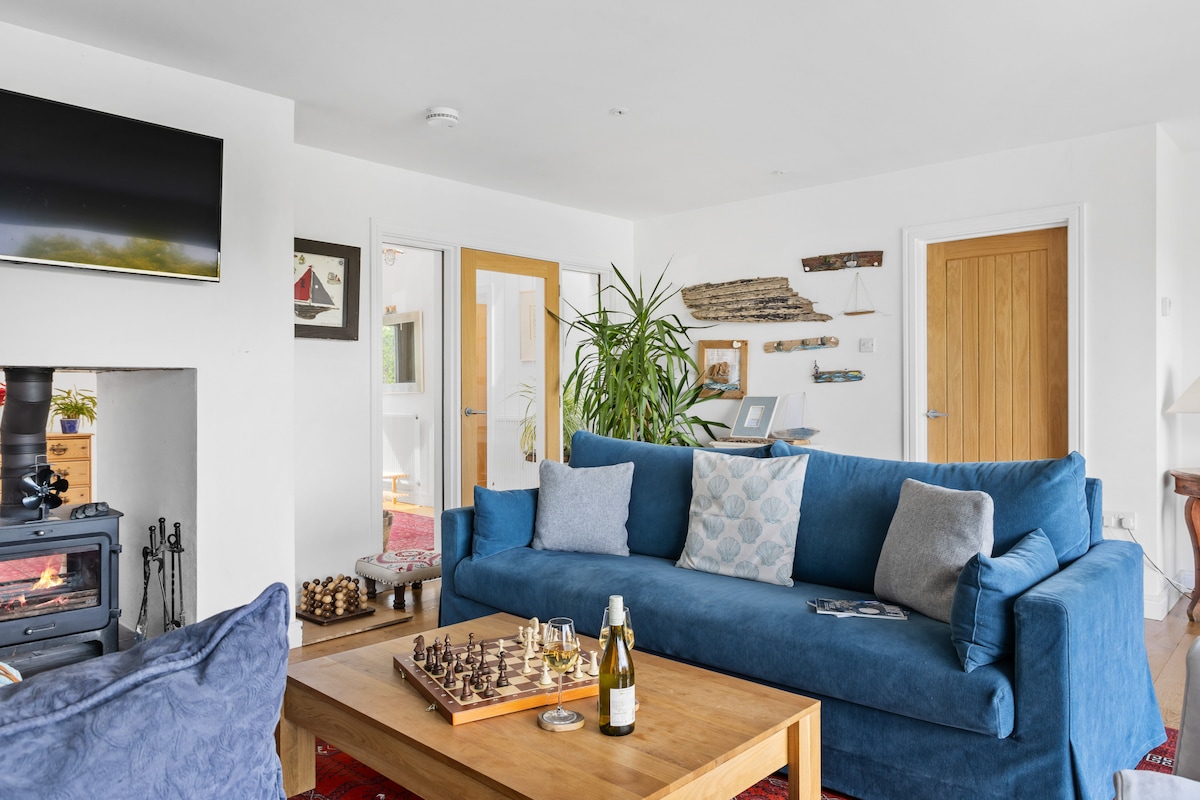 The Boathouse, located right on the water's edge at the bottom of the garden, offers a cozy retreat for two guests. The open-plan living area is filled with natural light, and large sliding doors open onto a private balcony with breathtaking views of the water. The compact yet fully equipped kitchen allows for independent dining, while the mezzanine bedroom, accessed by "ship's steps," offers a snug double bed. For additional sleeping space, there is also a sofa bed in the lounge.