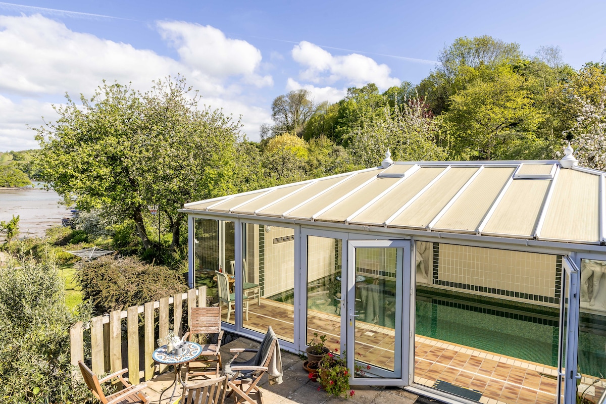 The paved terrace extends from the lounge and kitchen area, providing a perfect spot to relax and enjoy al fresco dining. Lounge on comfortable garden furniture, fire up the rustic barbecue for a delicious outdoor meal,simply take in the tranquillity of the surrounding landscape. For those seeking relaxation, the indoor heated pool offers the ultimate place to unwind, whether you’re swimming with familyenjoying a peaceful soak. At high tide, the creek is also perfect for a gentle paddle.
