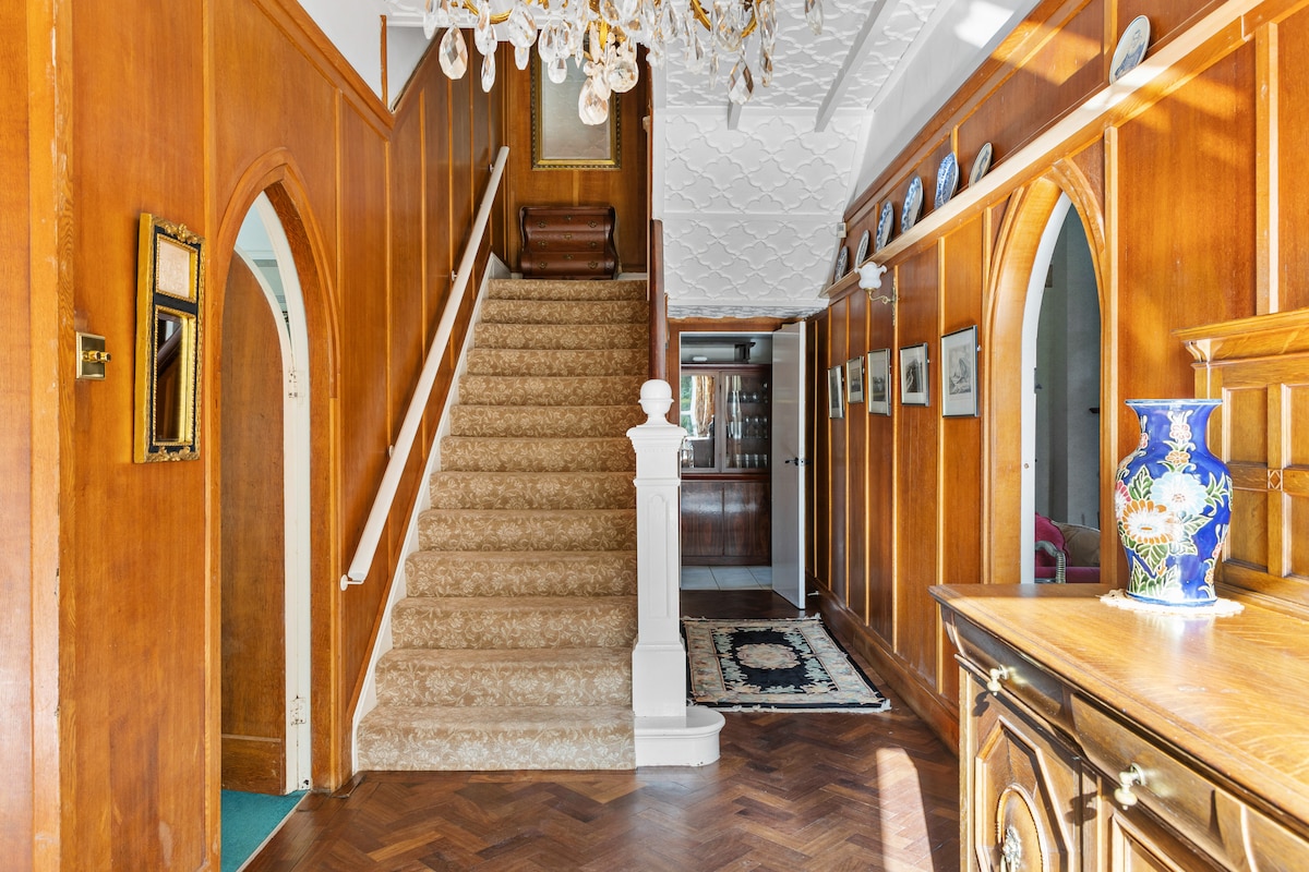 Inside, the house is dripping with architectural features, including twin turrets which flank the main entrance, ornate plaster ceilings, original Arts and Crafts fireplaces and gothic-style arched doors and wood-panelled walls.