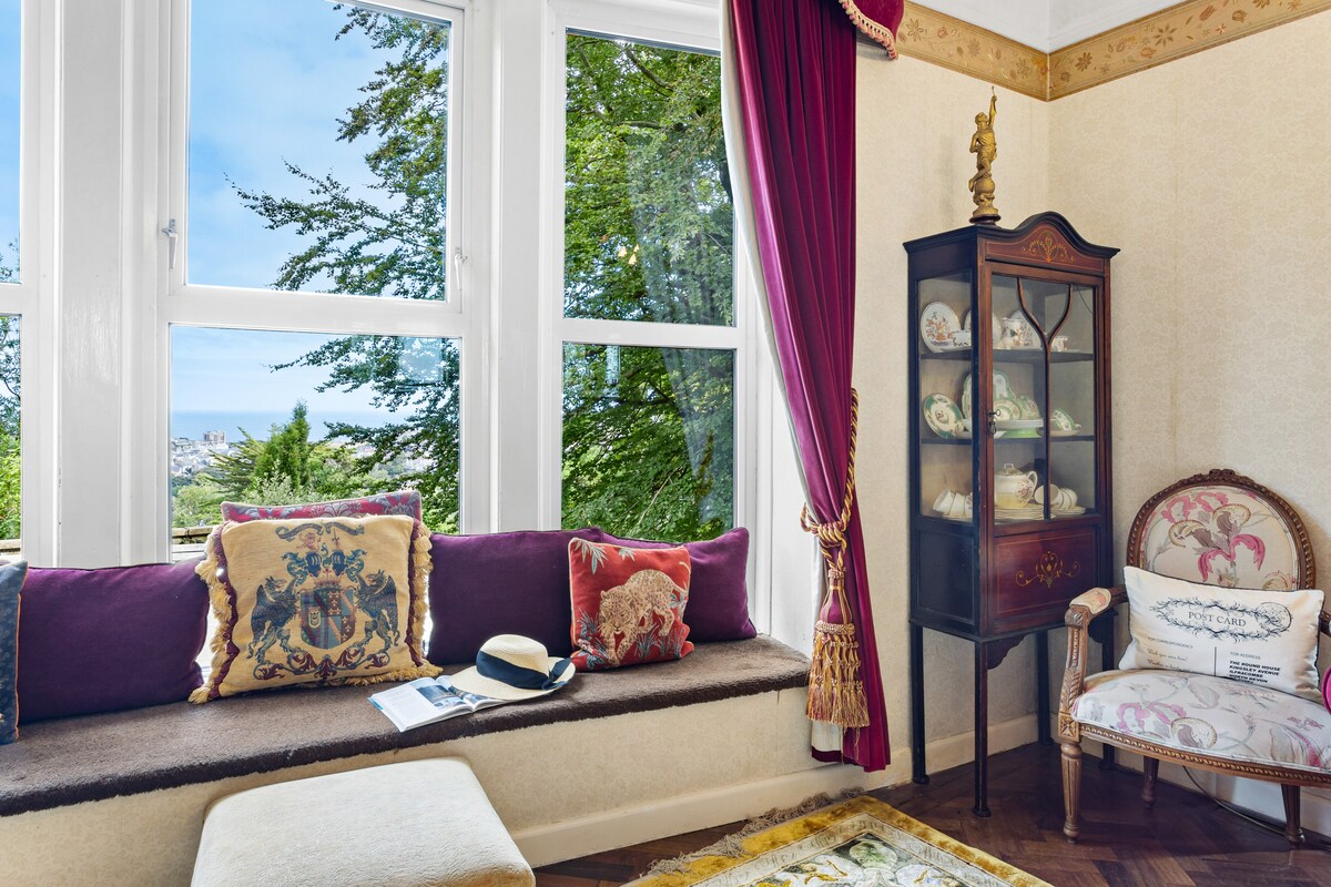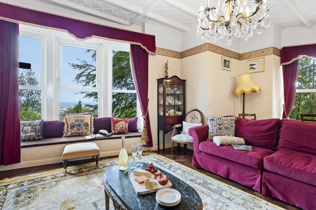 The front door opens into a turreted entrance with an ornate gilded patterned plastered ceiling and herringbone parquet flooring leading towards the drawing room. This features a bowed picture window with a window seat below, so you can gaze out at the hypnotic sea views.