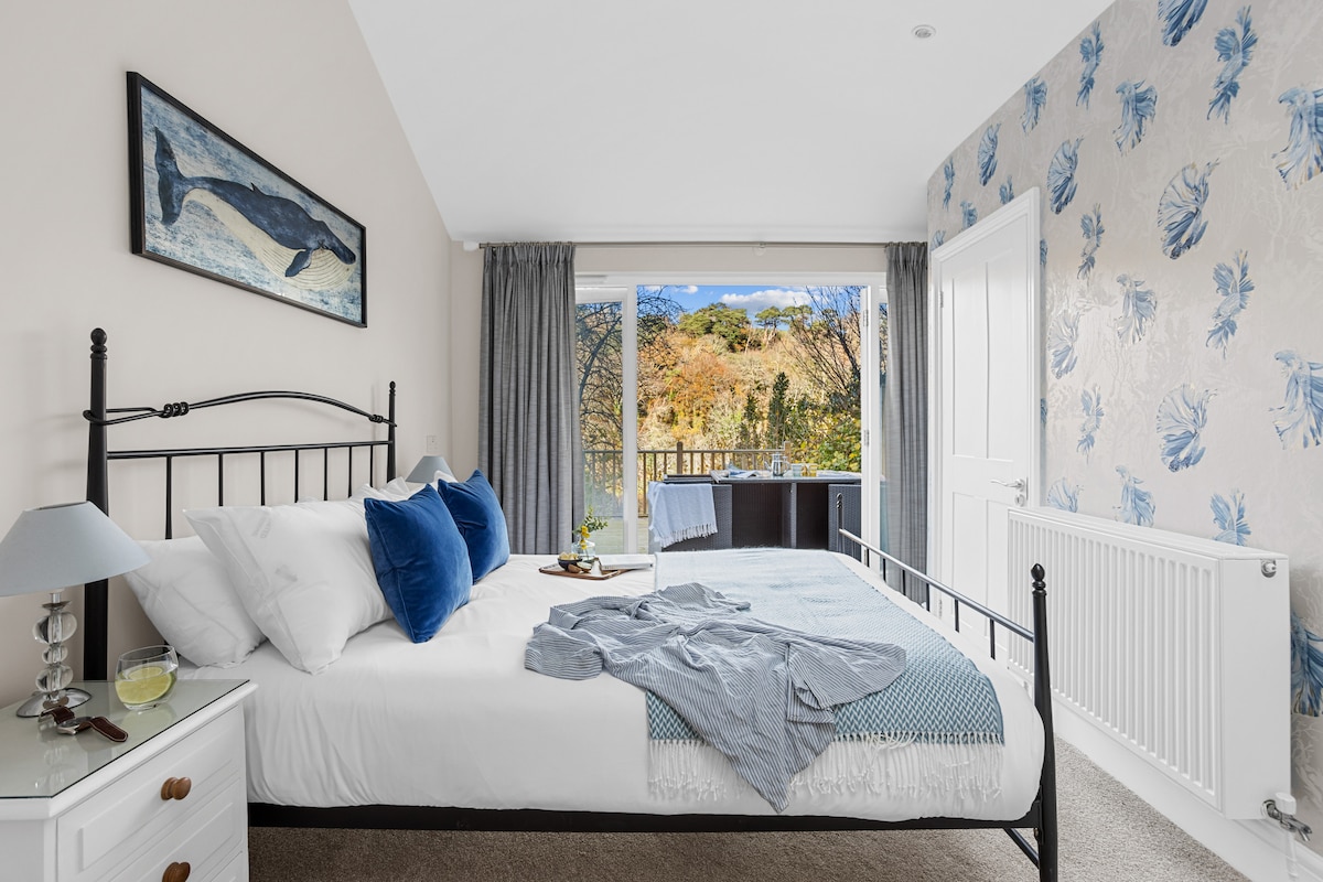 - Master Bedroom – King bed, private balcony with hillside views, luxurious ensuite with free-standing bath and walk-in shower.