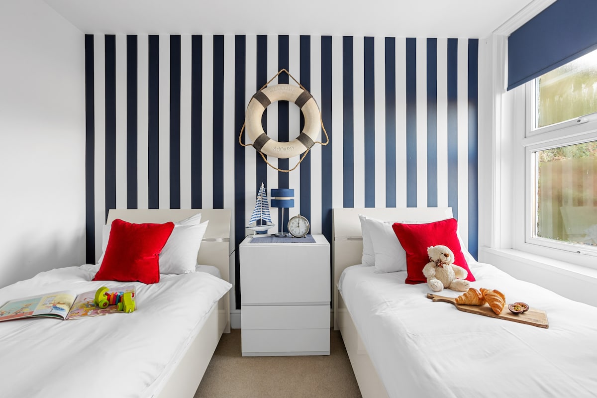 - Twin Bedroom – Nautical stripes and a soothing coastal theme.