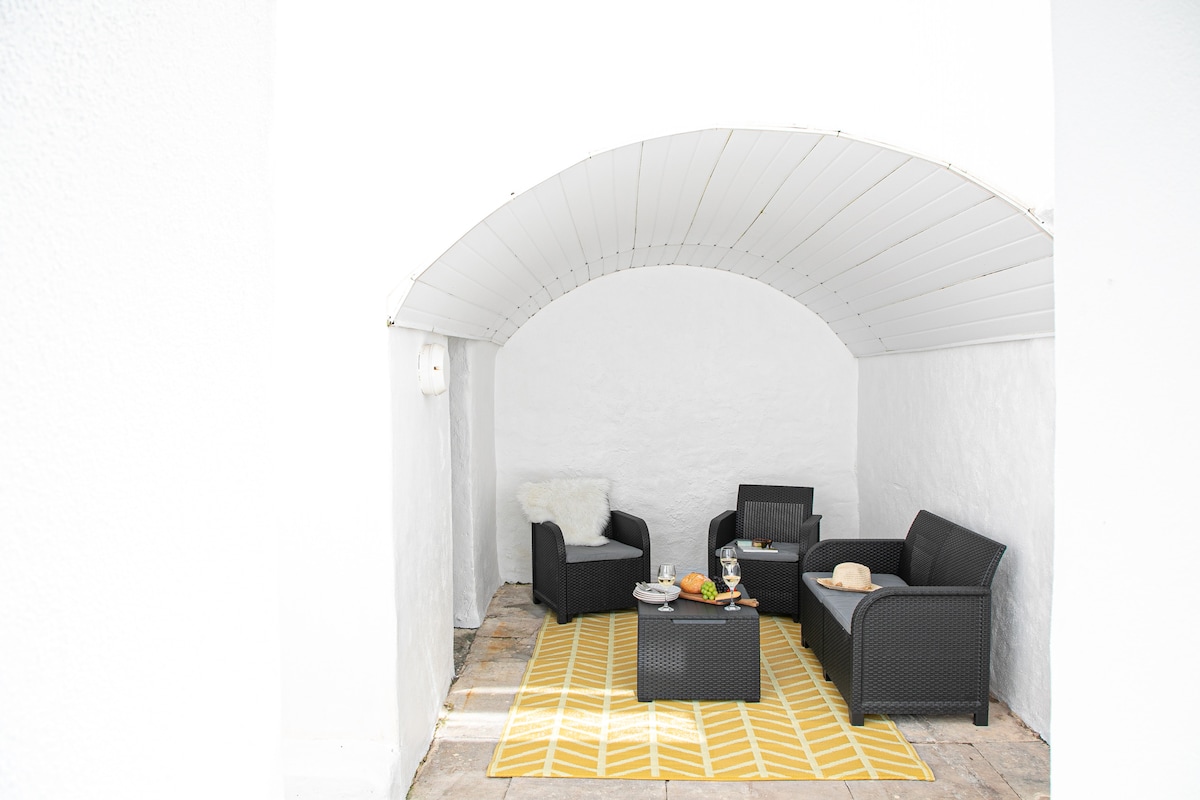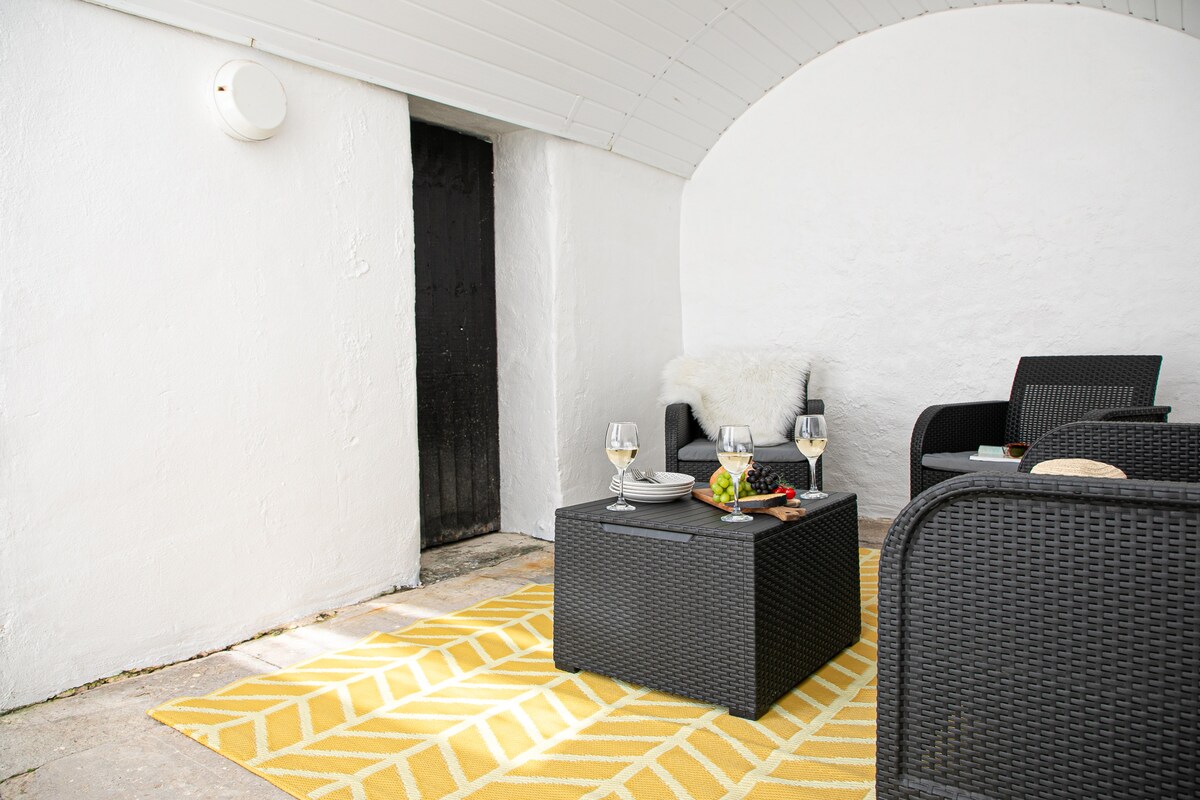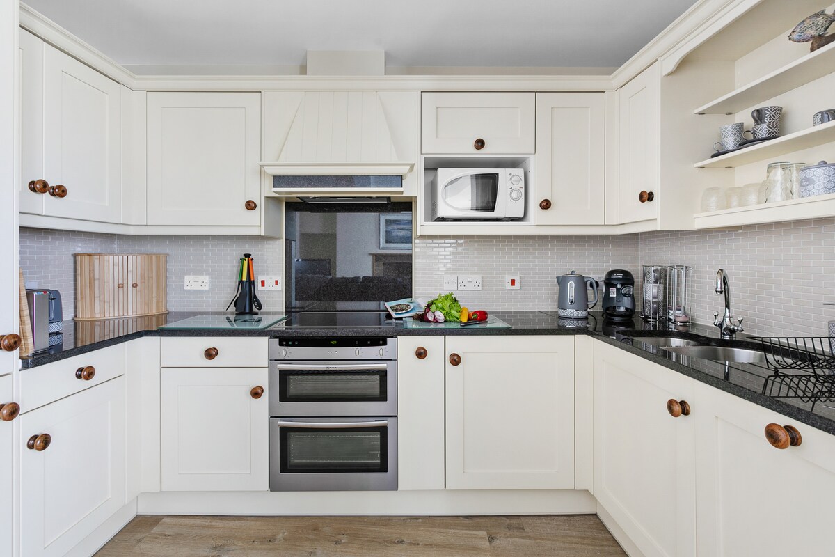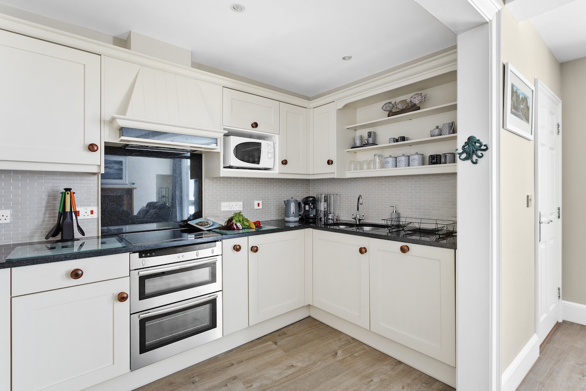 Thoughtfully designed to highlight its Georgian origins, the apartment features original cast-iron railings, wooden shutters, high ceilings and a private terrace restored from the former coal store. The bright living and dining area is perfect for gathering after a day at the beach, offering reclining sofas, a generously sized dining table and a fully equipped open-plan kitchen.