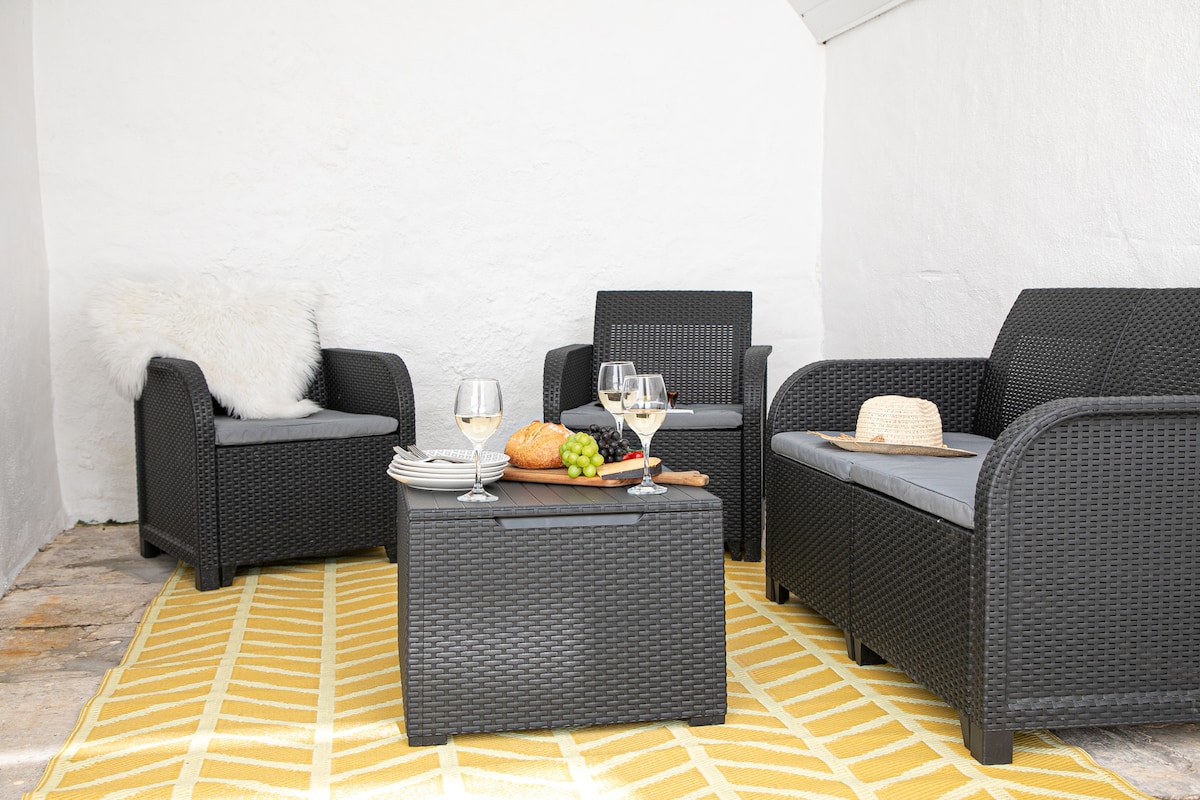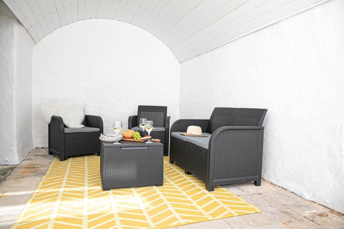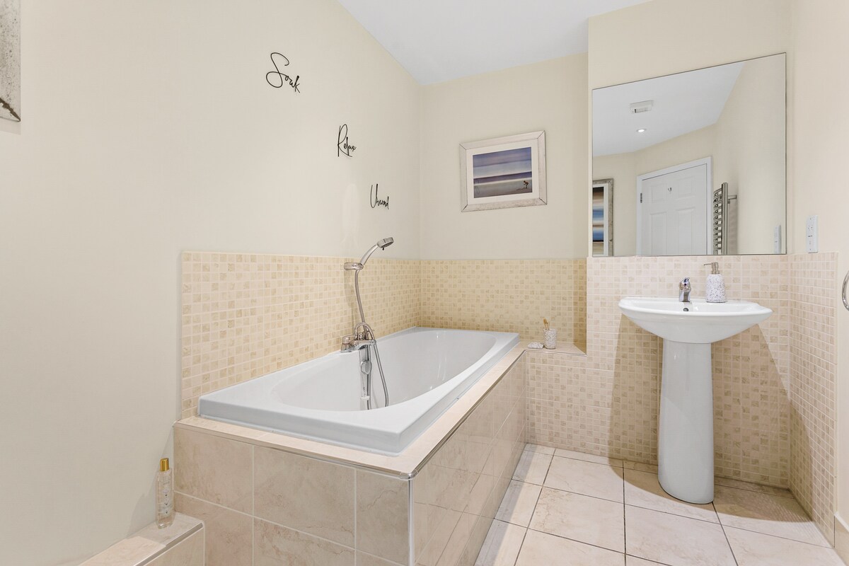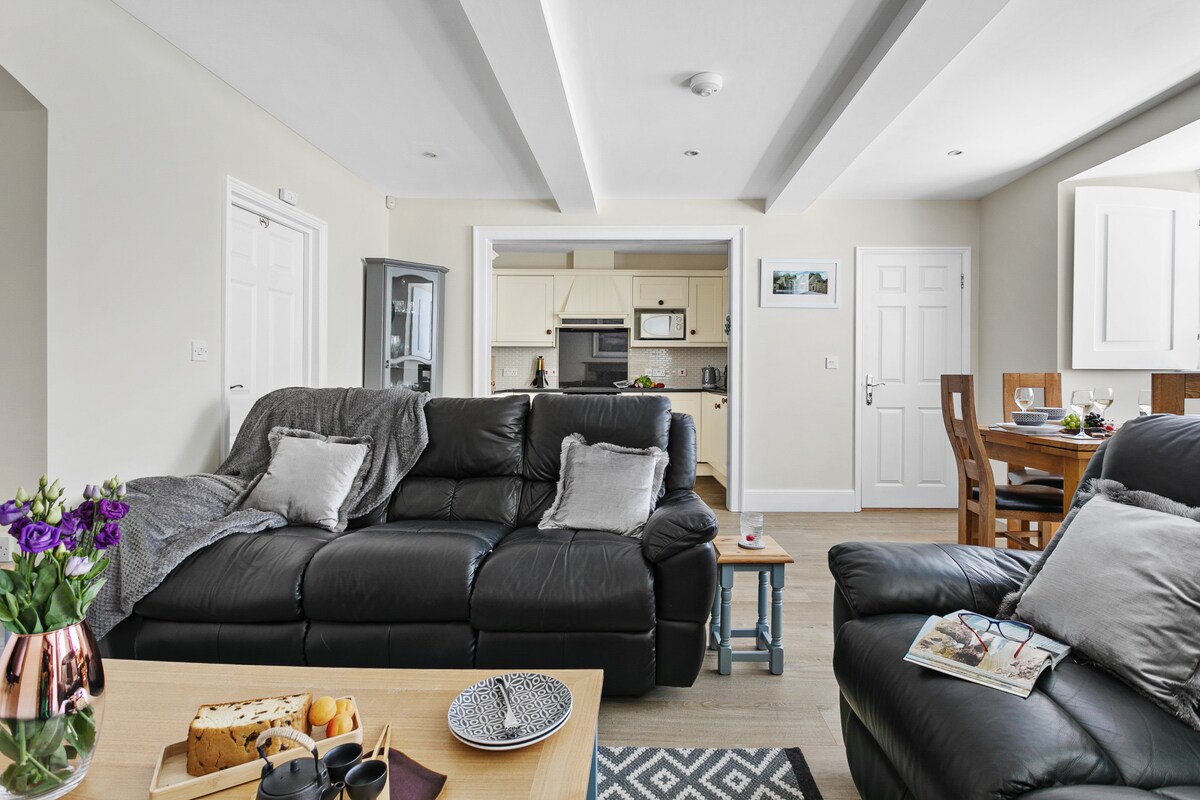 Thoughtfully designed to highlight its Georgian origins, the apartment features original cast-iron railings, wooden shutters, high ceilings and a private terrace restored from the former coal store. The bright living and dining area is perfect for gathering after a day at the beach, offering reclining sofas, a generously sized dining table and a fully equipped open-plan kitchen.