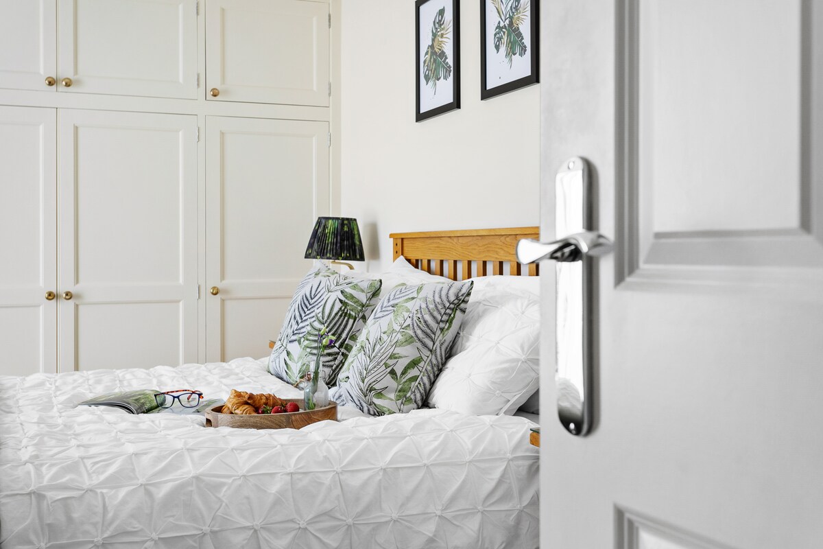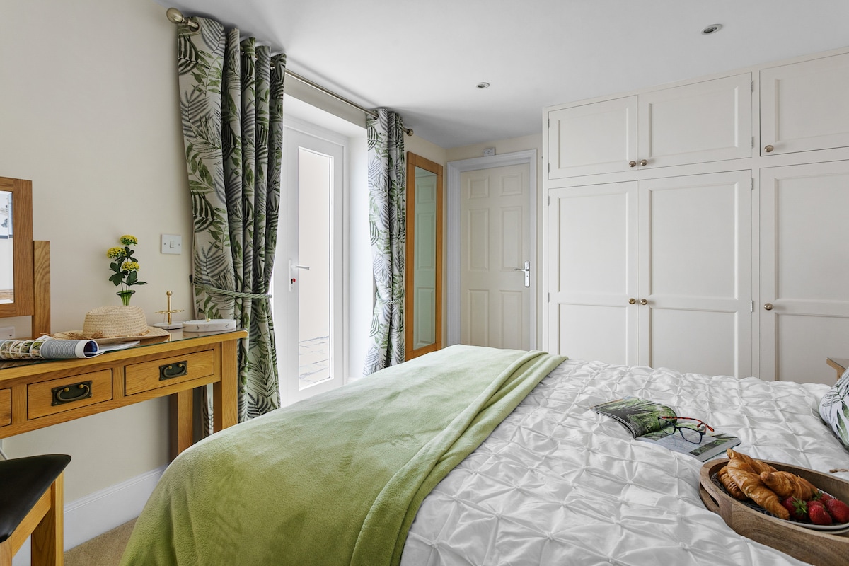 A calming double bedroom with French doors opening onto a totally enclosed, high-walled inner courtyard—safe for children and perfect for morning coffee. The ensuite shower room adds a touch of luxury and convenience.