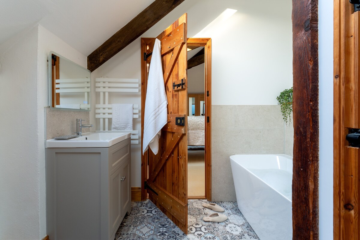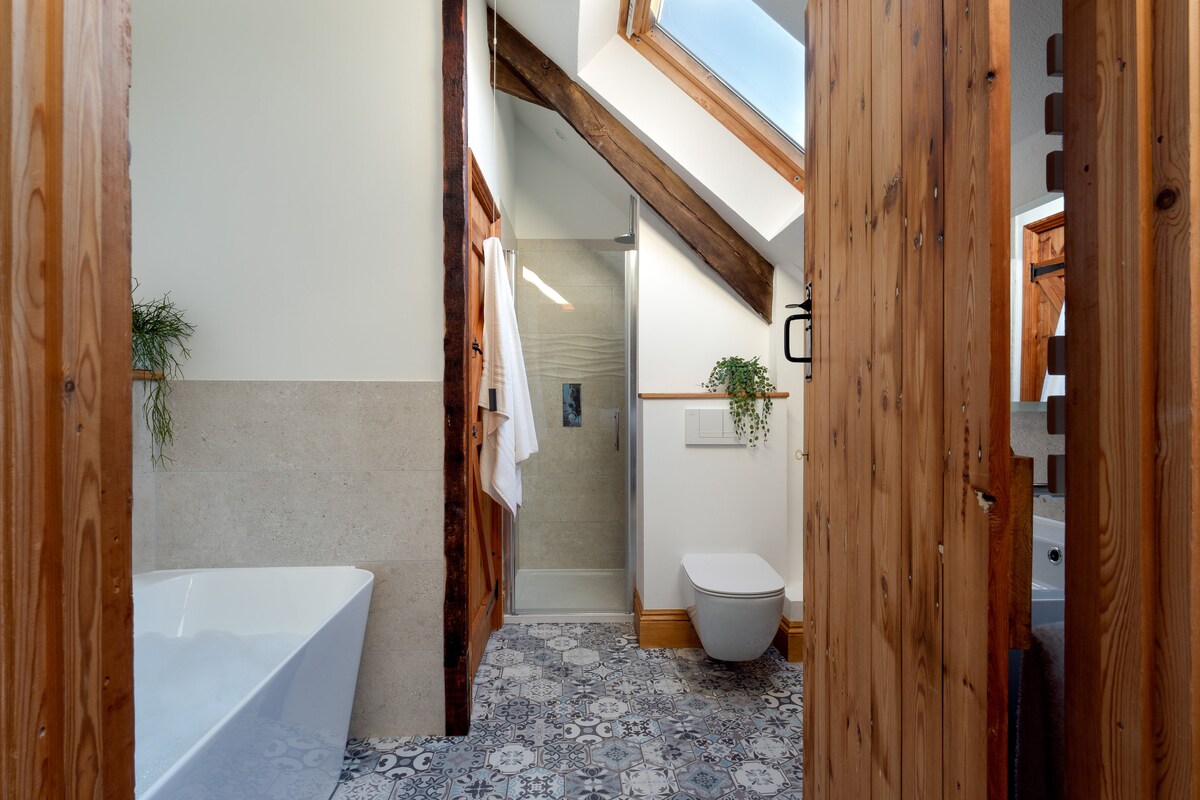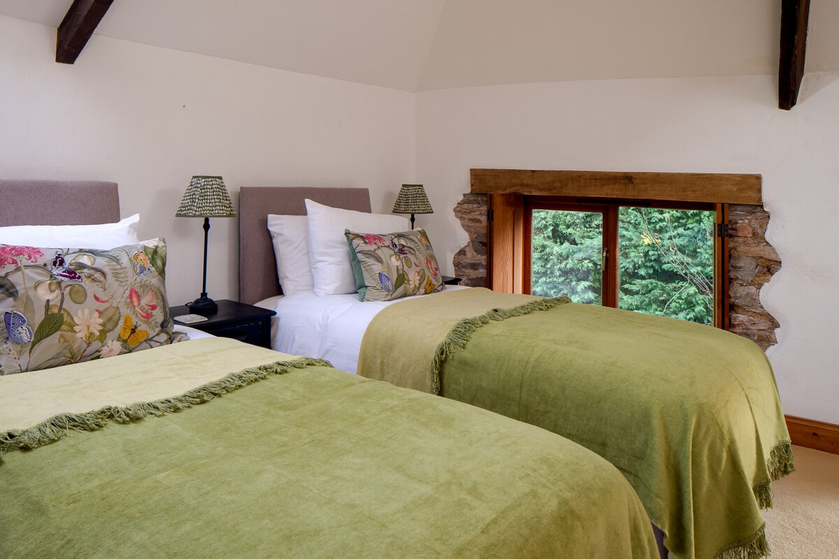 A romantic retreat featuring a custom-made cast-iron king-size bed (with its own steps!), vaulted ceiling, original beams and peaceful countryside views. Drift into a deep sleep surrounded by history and gentle rural quiet.
