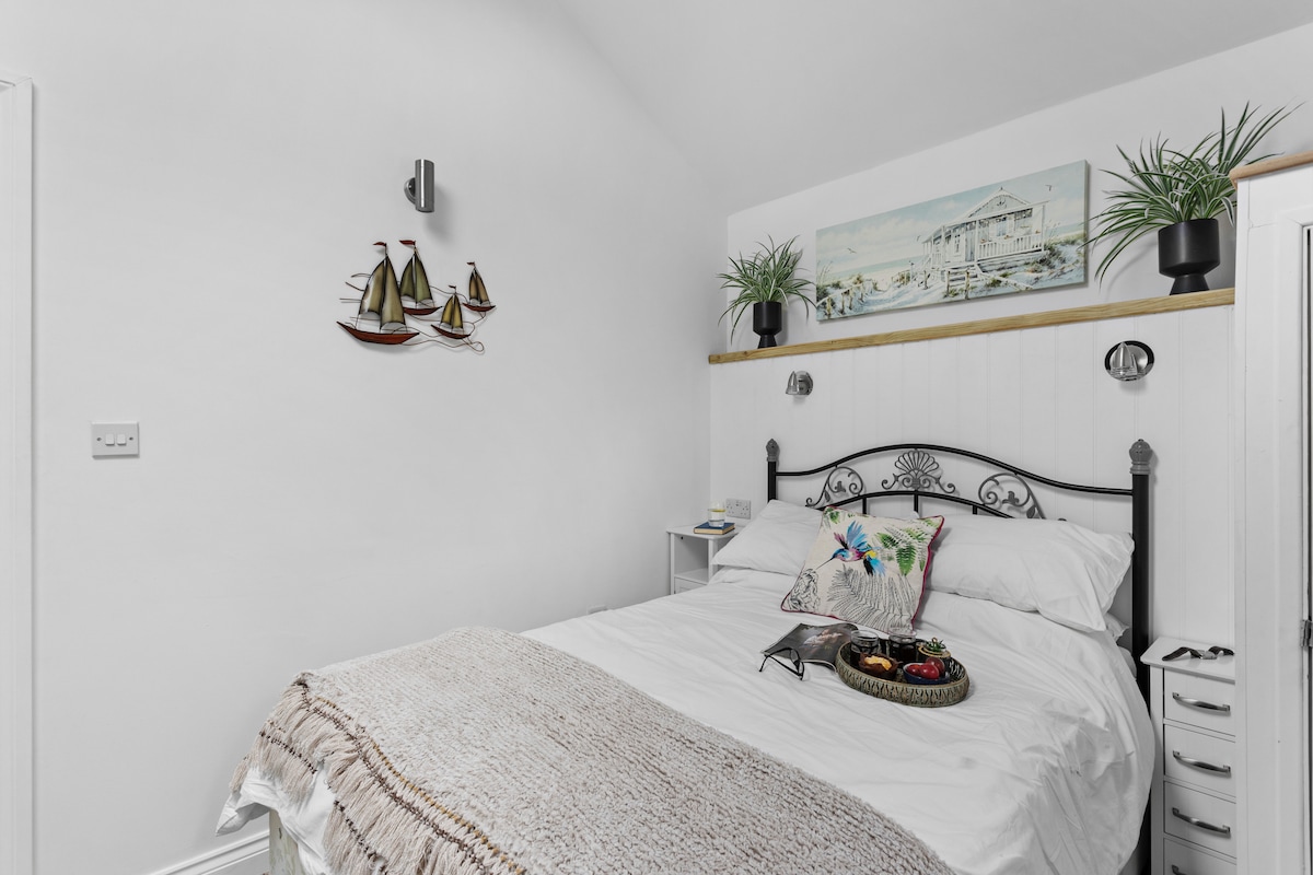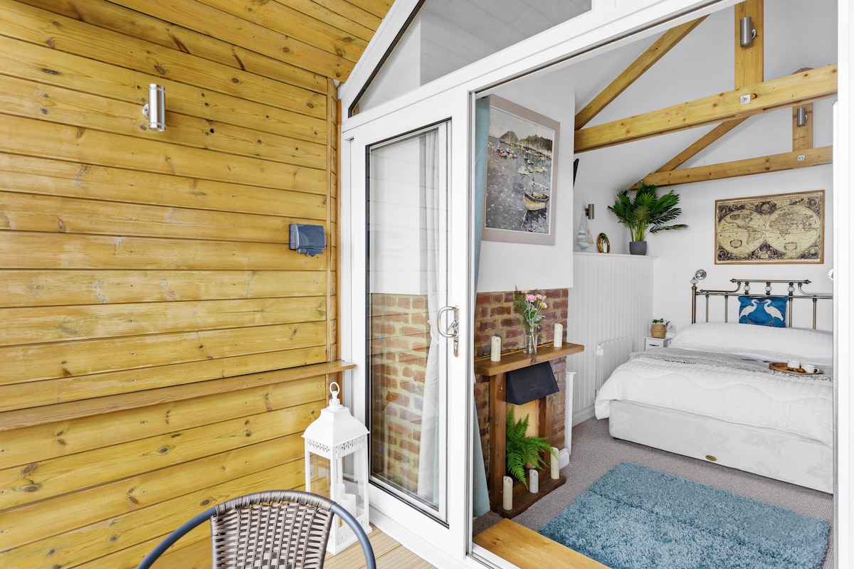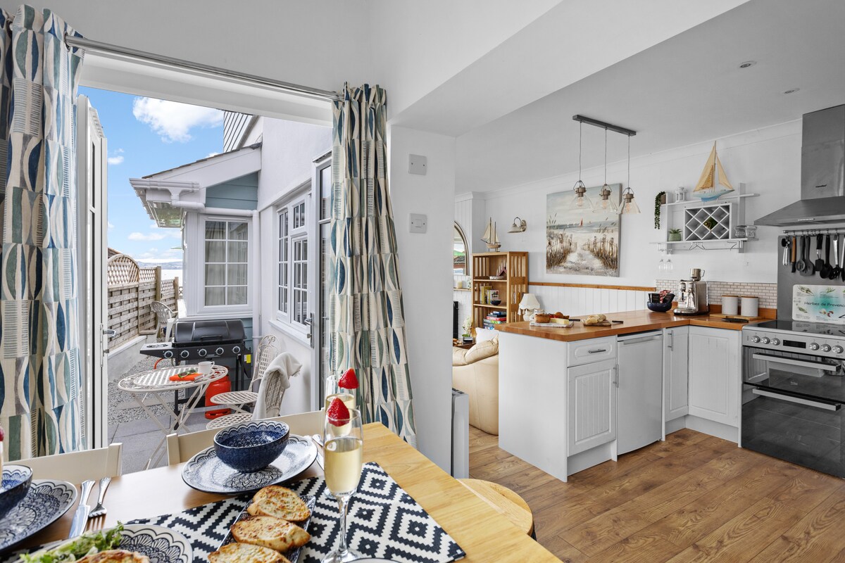 The moment you step inside The Boathouse, you’ll be captivated by the refreshing open-plan layout as the kitchen seamlessly merges with the living area, offering panoramic sea views of the marina and Torbay. As you settle into the cosy living space, let the sea air flow through, or take to the balcony to broaden the amazing vista. In the cooler months, also enjoy the warm glow of the wood-burning stove (ample wood, kindling, and firelighters are provided). Next to the kitchen area, the high dining table seats four. The feature-packed smart Tv lets you stream your favourite on-demand programmes (subscriptions required) and adjusts to the ambient light for uninterrupted viewing, come rain or shine. There’s also a Dvd player for your own choice of movies.