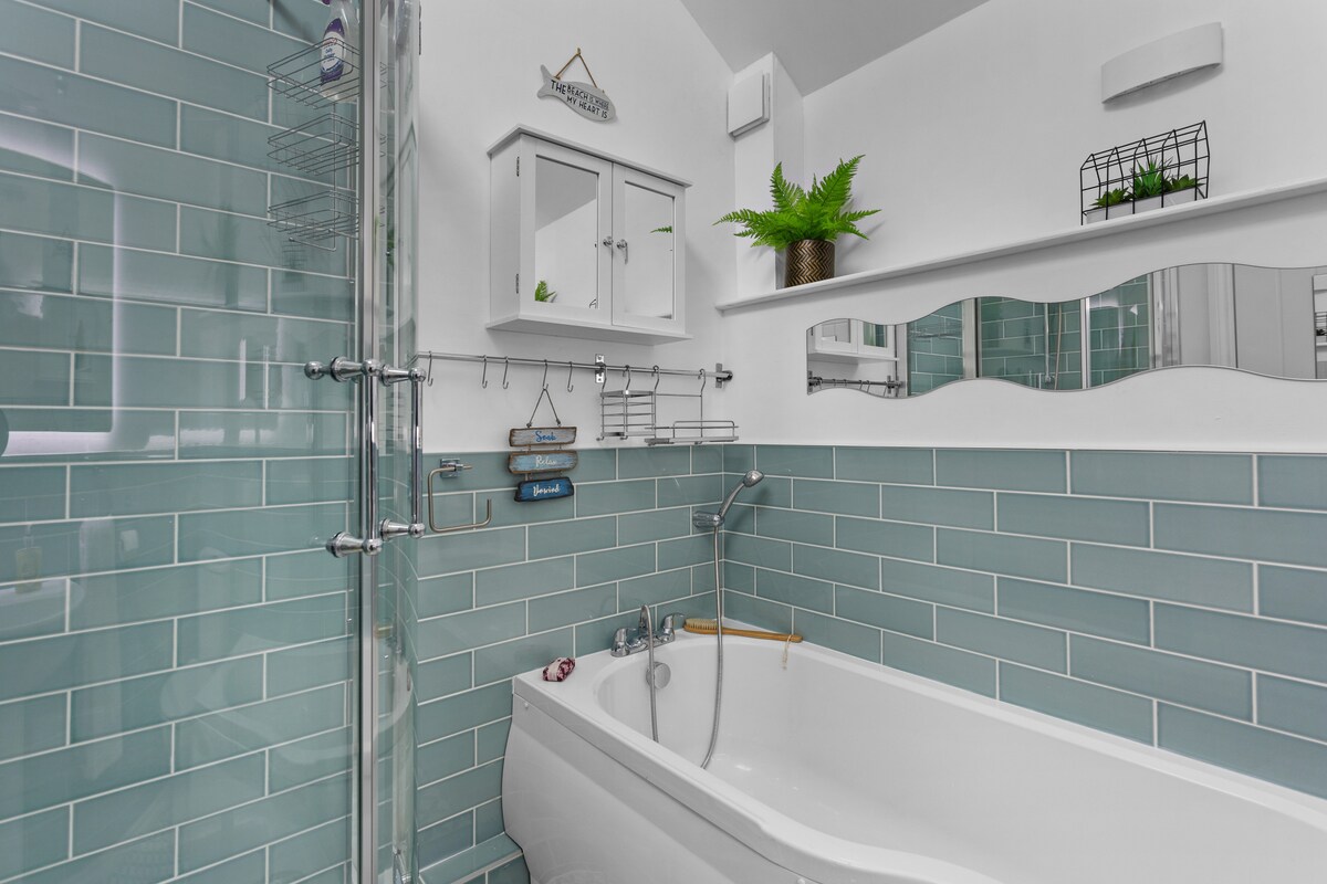 Between the bedrooms is the family bathroom. Framed in subtle nautical-green brick tiles, there’s a corner shower, curved shower bath with shower attached, plus a basin and toilet. It is also worth mentioning that there is also an large illuminated Bluetooth mirror with inbuilt speakers that plays music from any Bluetooth device.