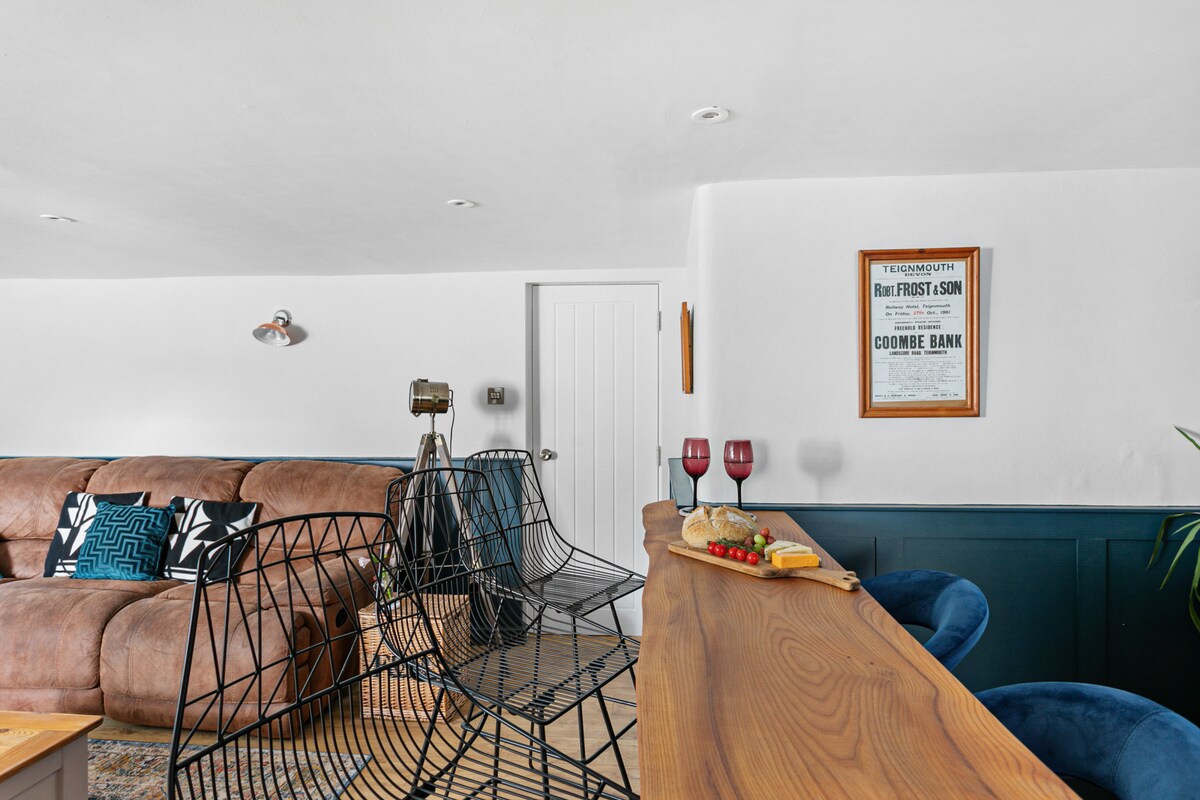Just moments from Teignmouth’s beloved Back Beach, Coombe Bank is a contemporary coastal retreat with a charming period twist. Once the bar and restaurant of the former Coombe Bank Hotel, this beautifully refurbished apartment now offers stylish, sun-filled living for families, couples, beach lovers, and walkers. With space for four guests, two bedrooms, private parking, paddleboards, and a south-facing garden, this is easy seaside living at its best.Decorated in serene coastal tones of mermaid teal and driftwood neutrals, Coombe Bank is the perfect setting for long, lazy days by the water. Start your morning with coffee in the outdoor lounge, relax on the terrace, or soak up the sun in the sheltered garden before heading to the beach for paddleboarding, swimming, or a stroll along the South West Coast Path.