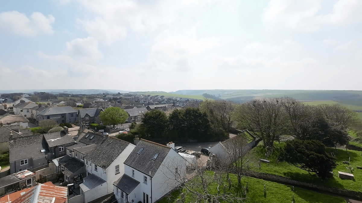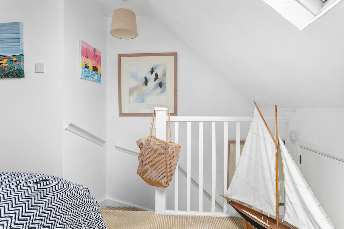 Ascend once more to the charming master bedroom, set into the eaves and offering spectacular countryside views stretching across the rolling hills of the South Hams — an official Area of Outstanding Natural Beauty. Wake to peaceful rural scenery and gentle morning light.