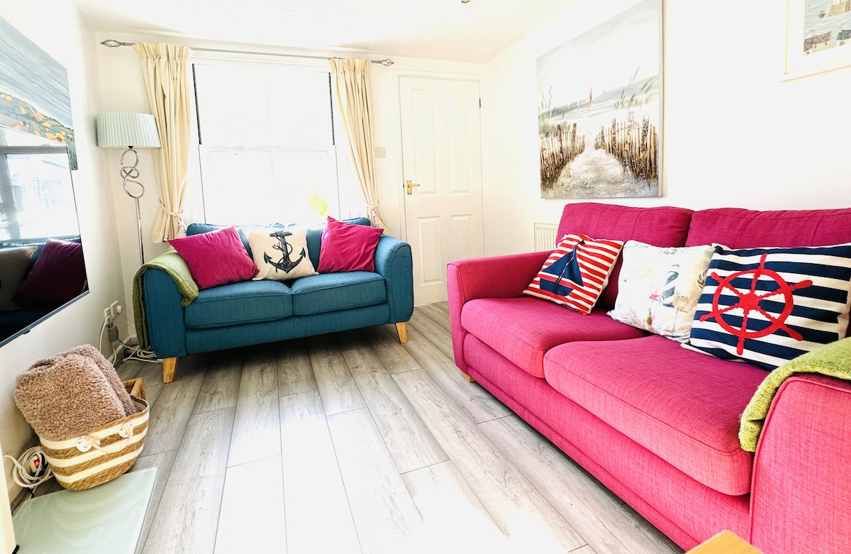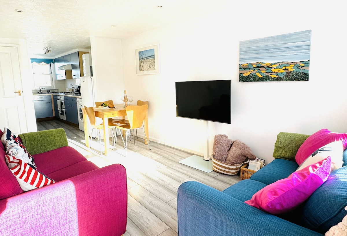 Step through the door and into an inviting space filled with light, contemporary décor and calming seaside tones. The relaxed lounge features two comfortable sofas — ideal for snuggling up after days exploring the South West Coast Path. One sofa can be converted into a double bed for occasional use (linen available on request before arrival).