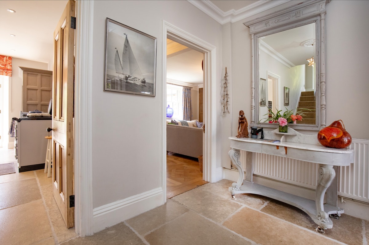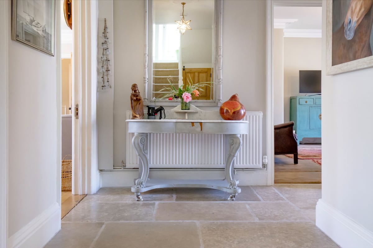 Step through the front door into the thoughtfully designed home where every detail speaks of comfort and style. The central limestone tiled hallway is filled with light with doors leading off into the south facing principal rooms and with one of two staircases rising to the first floor.