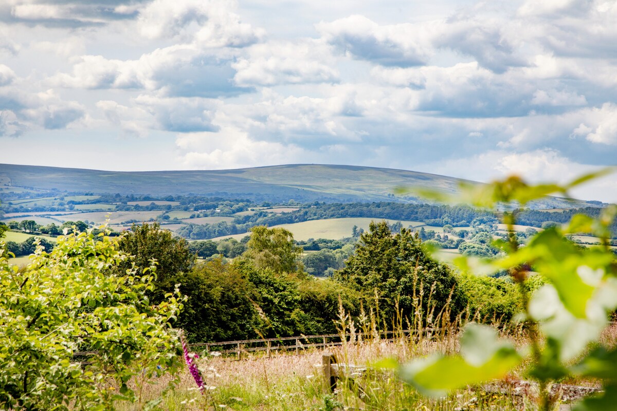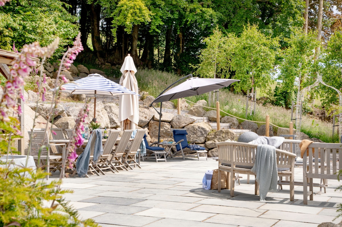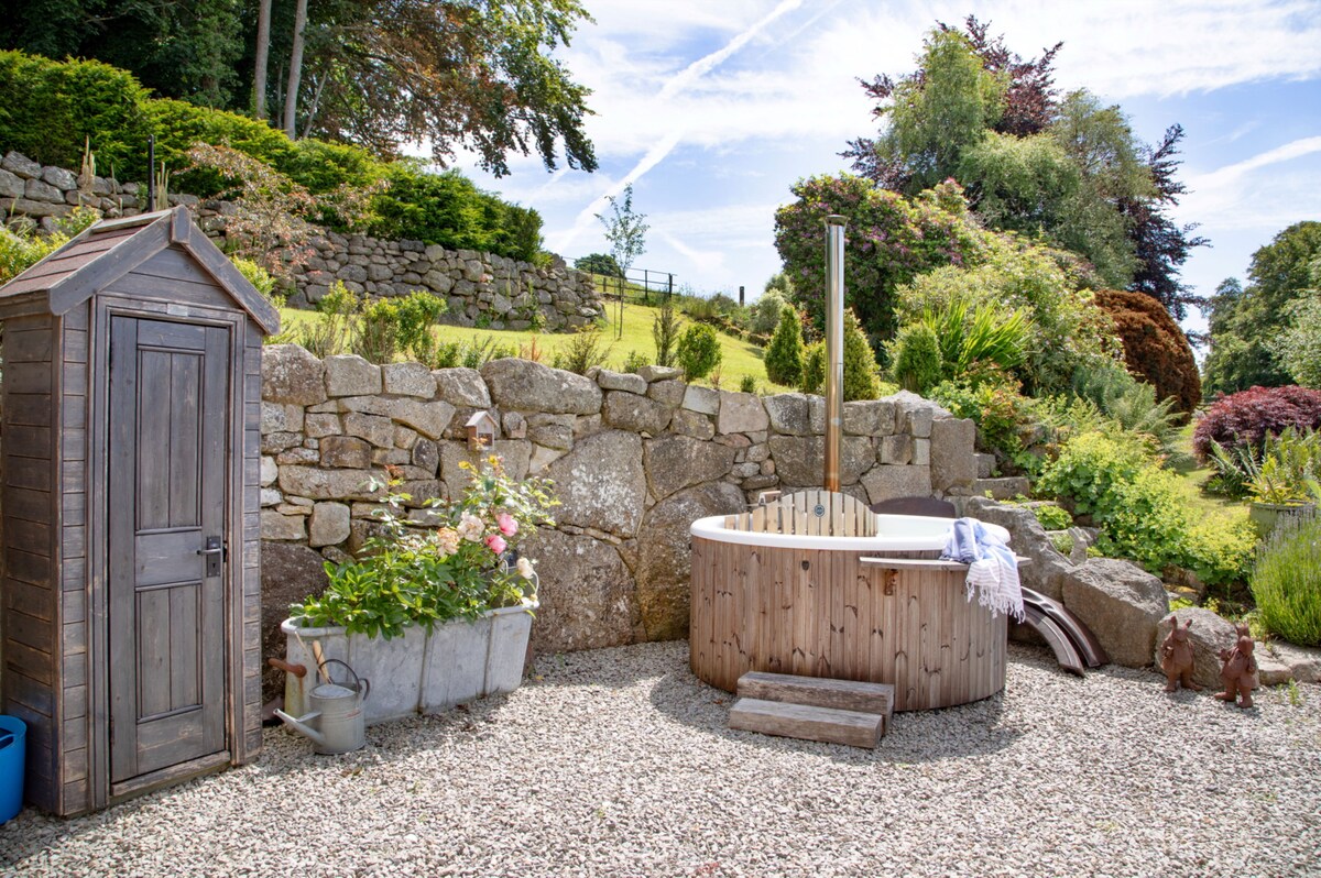 The 77-acre estate invites you to explore its meadows, paddocks, and woodlands, offering an idyllic backdrop for peaceful strolls or more energetic adventures. Unwind in the hot tub or take a dip in the communal swimming pond (available April - October). Evenings are magical, spent around the fire-pit under Dartmoor’s starry skies. (The property is packed with activities, including a trampoline, basketball net, ping pong table, and a treasure chest of kids' toys. Bikes and scooters are available to explore the quiet lanes and private grounds)