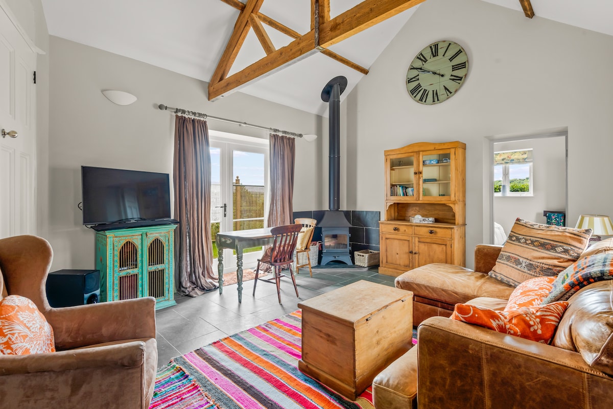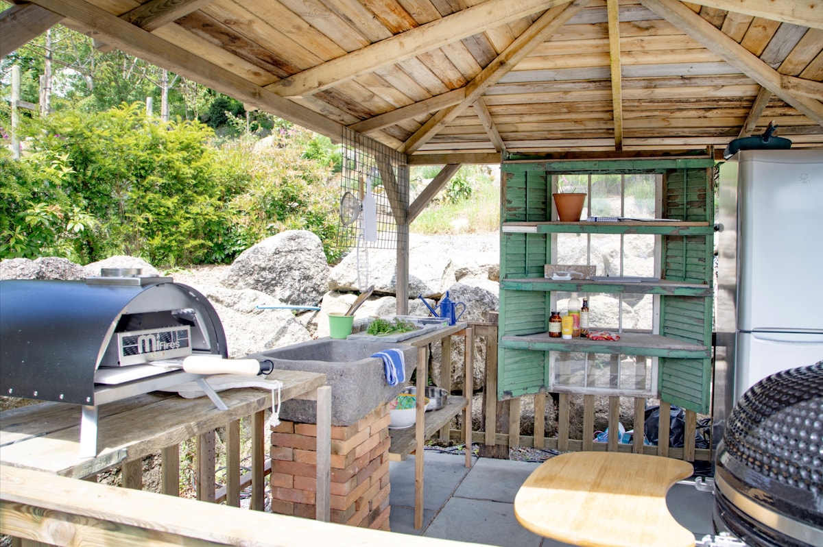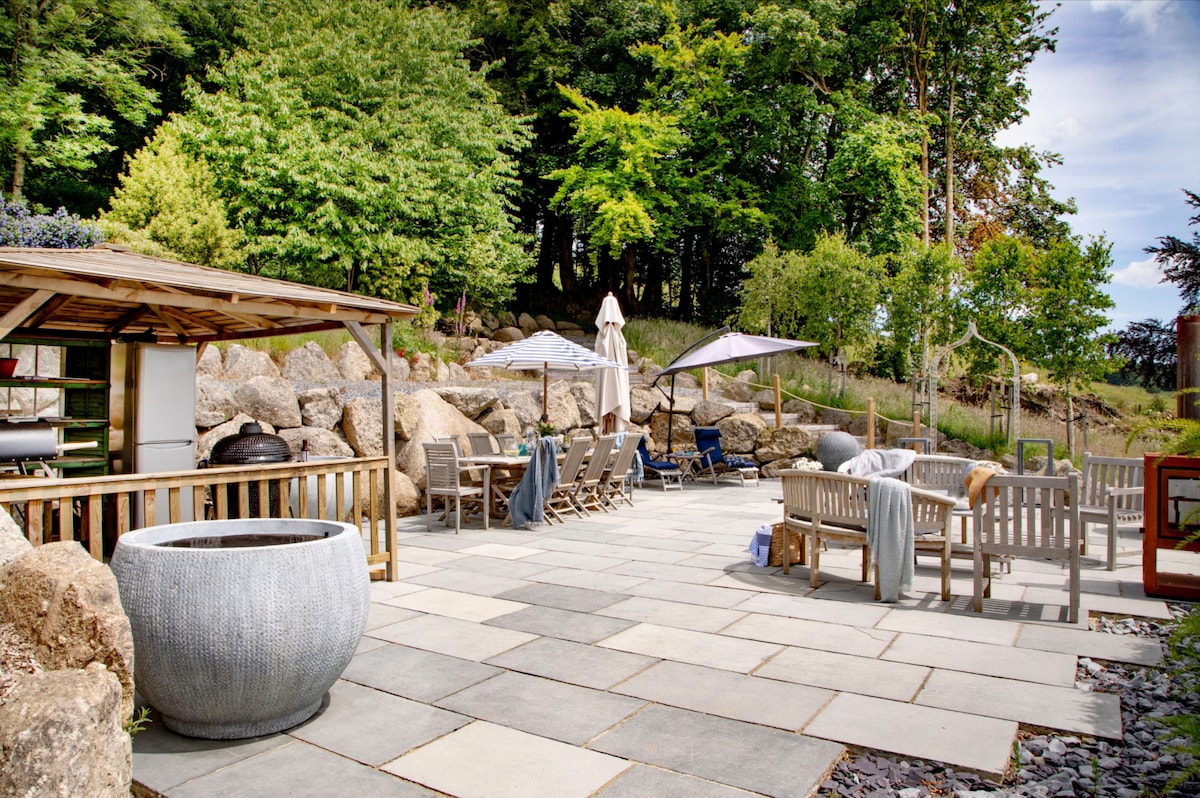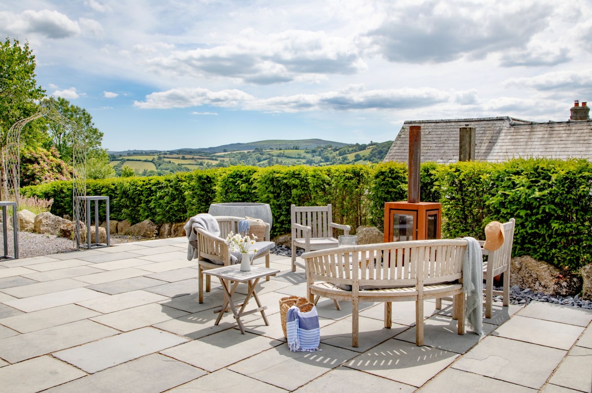 The 77-acre estate invites you to explore its meadows, paddocks, and woodlands, offering an idyllic backdrop for peaceful strolls or more energetic adventures. Unwind in the hot tub or take a dip in the communal swimming pond (available April - October). Evenings are magical, spent around the fire-pit under Dartmoor’s starry skies. (The property is packed with activities, including a trampoline, basketball net, ping pong table, and a treasure chest of kids' toys. Bikes and scooters are available to explore the quiet lanes and private grounds)