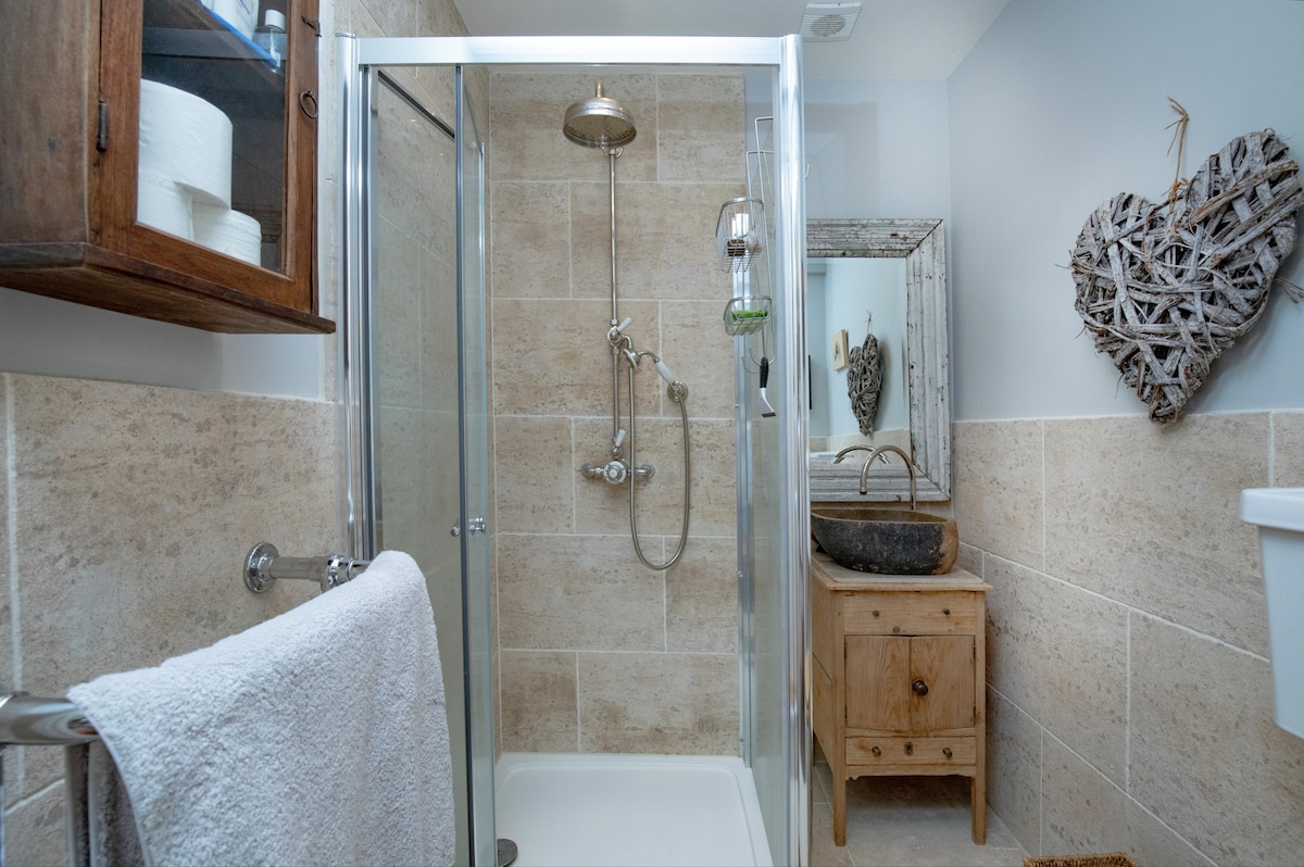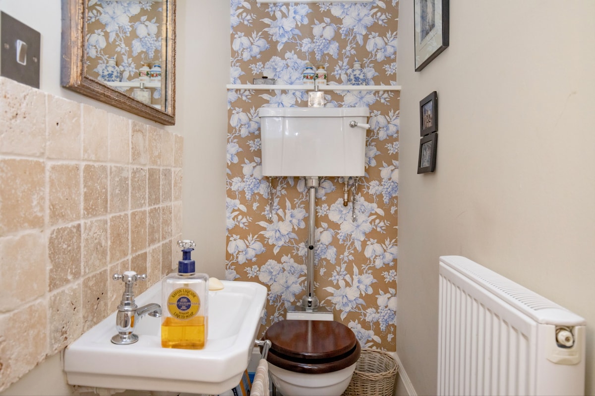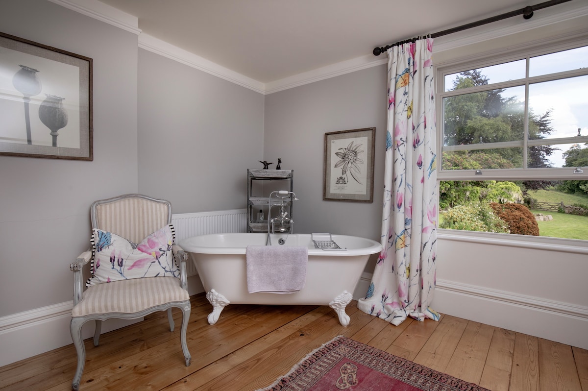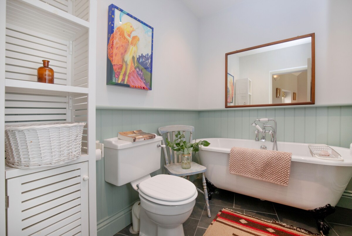 The elegant bathroom features a ball and claw freestanding bath with a hand-held shower, offering a charming, classic touch to your stay. Additional amenities include a Wc and washbasin, completing the spa-like feel of this luxurious space.