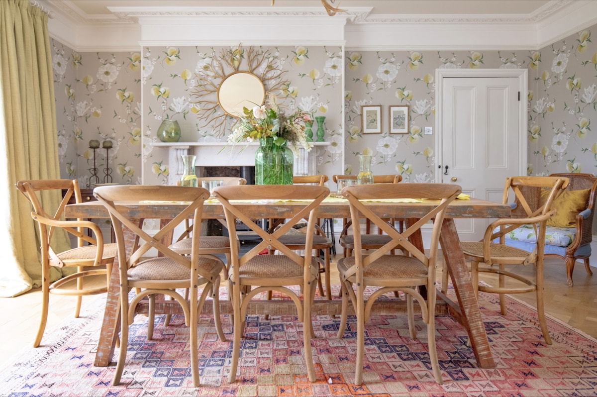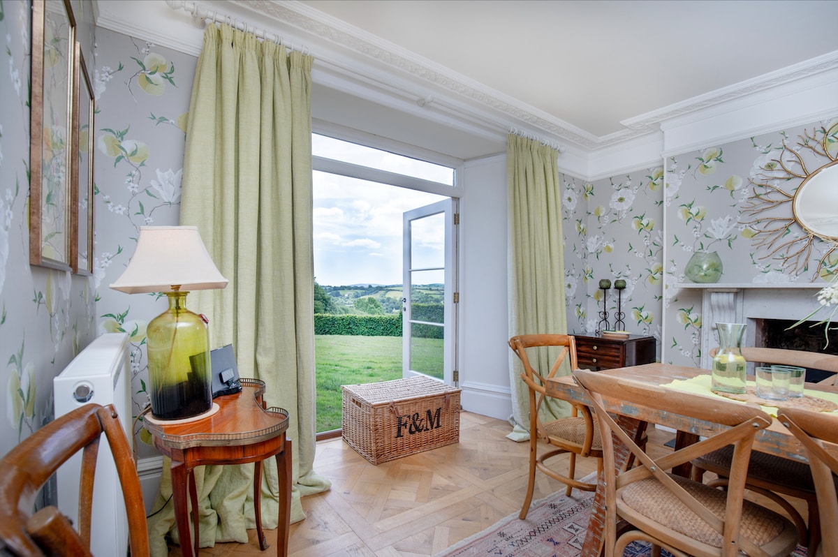 At the heart of the home is the gourmet kitchen/breakfast room, equipped with an Aga, Lacanche range and steam oven, and provides everything you need to create memorable meals. The double doors in the breakfast area open out onto the stone terrace offering wonderful views across the lawn to the moors of Dartmoor beyond. The main dining room offers a ‘Parisian country flair’ furnished with a large table to comfortably seat 10, a woodburning stove and french doors that open onto the expansive lawn, seamlessly blending indoor and outdoor living.