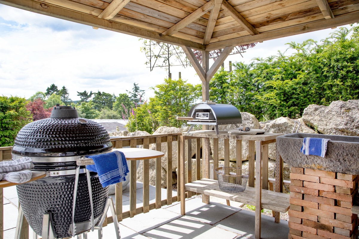 Linscott Farmhouses’ outdoor spaces are as captivating as its interiors. The stone terrace features a woodburning hot tub and looks out over the large swathe of lawn in front of the house as well as the incredible scenery that lies beyond. There is also a separate enclosed garden accessed through french doors from the Annex lounge. Follow the sloping pathways up to an elevated and stone terrace a perfect space for summer dining with the provision of an outdoor kitchen, complete with Bbq and pizza oven and enjoying majestic views over the surrounding countryside.