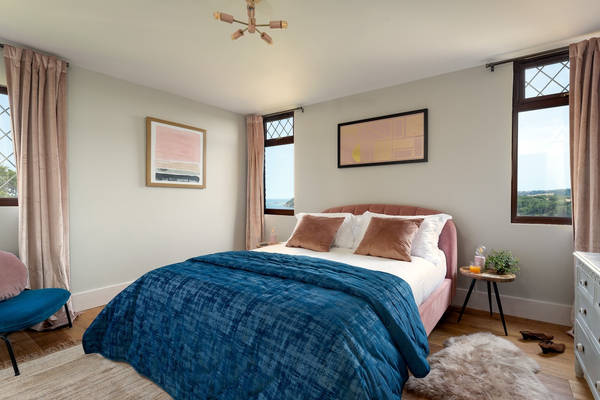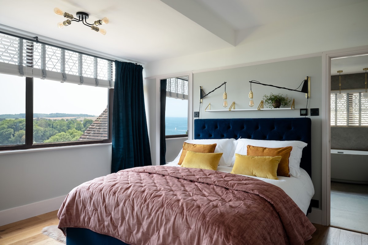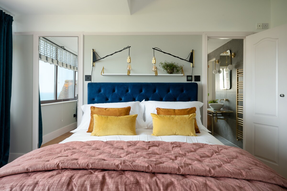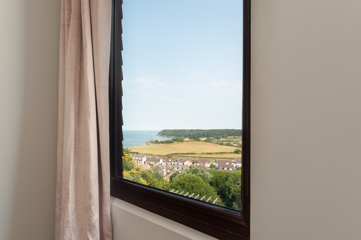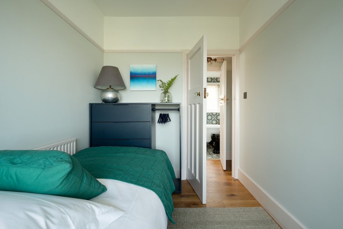 The ground floor has one double bedroom with sliding-door access to the decked terrace, and a snug room-come-bedroom with a king-size sofa bed. Open the windows and let the lovely sea breeze float in as you rest on cool cotton sheets. Both bedrooms share a contemporary ensuite shower room. Upstairs, you’ll find the views just get better. The inviting super-king master bedroom is light, airy, and has a generous and contemporary ensuite shower room, with an oval bath just asking to be filled with bubbles. There’s a cosy bedroom with two single beds (not zip and link); and a lovely double bedroom with a large en suite shower. Down the hallway is an elegant, tiled monochrome family bathroom, complete with a freestanding bath.