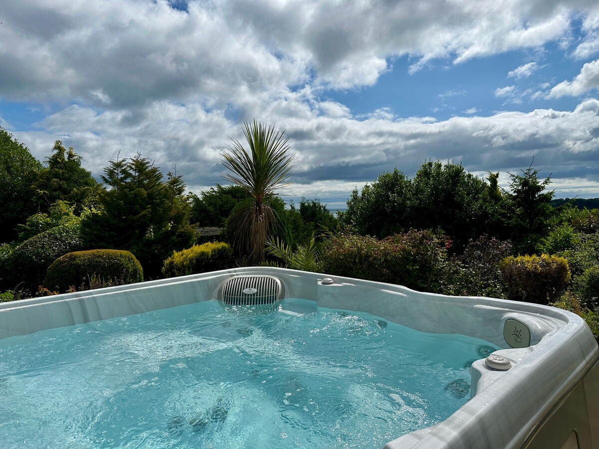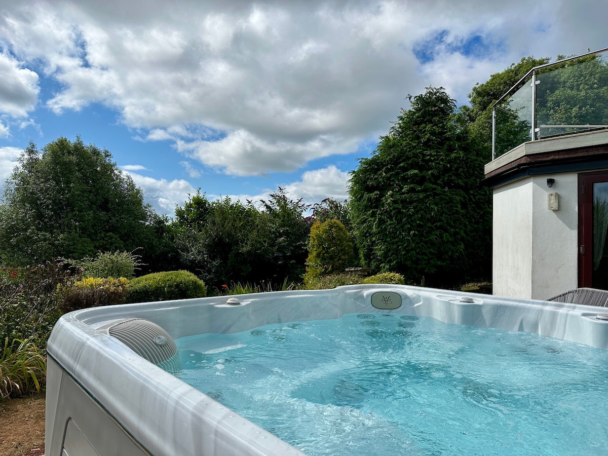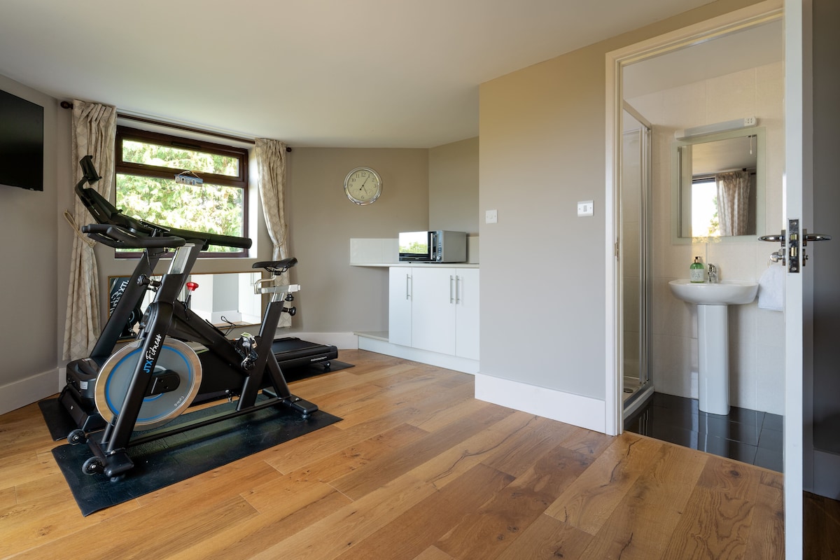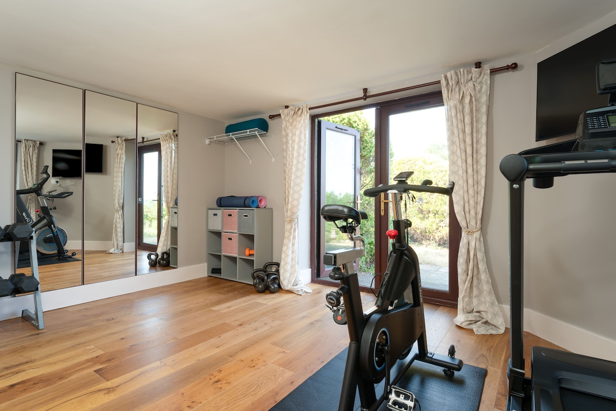Outside is the sublime decked terrace and garden. On a summer’s day, you’ll be able to soak up the sunshine and scenery whether you choose to laze in the hammock, feast around the table, or lean against the rails with a glass of fizz. During the evening why not enjoy the hot tub, newly installed for Summer 2025, which is capable of accommodating 8 guests. Underneath the terrace is a clever private gym room with a view, complete with a treadmill, bike machine and weights.